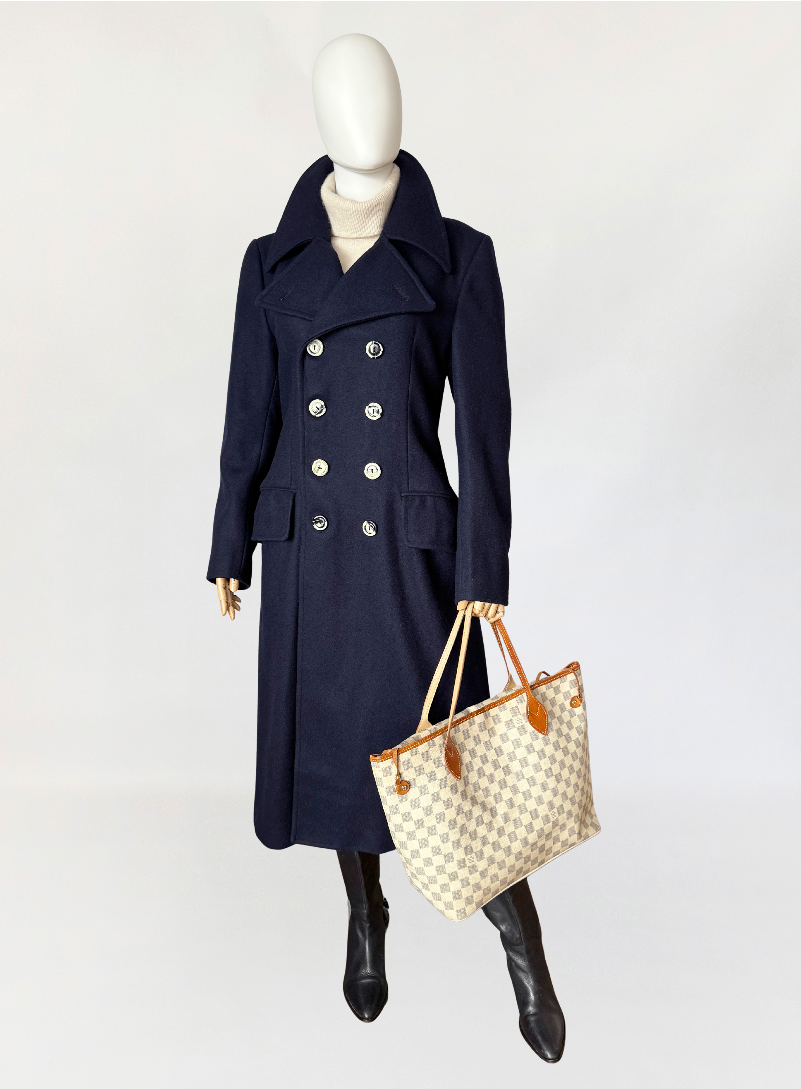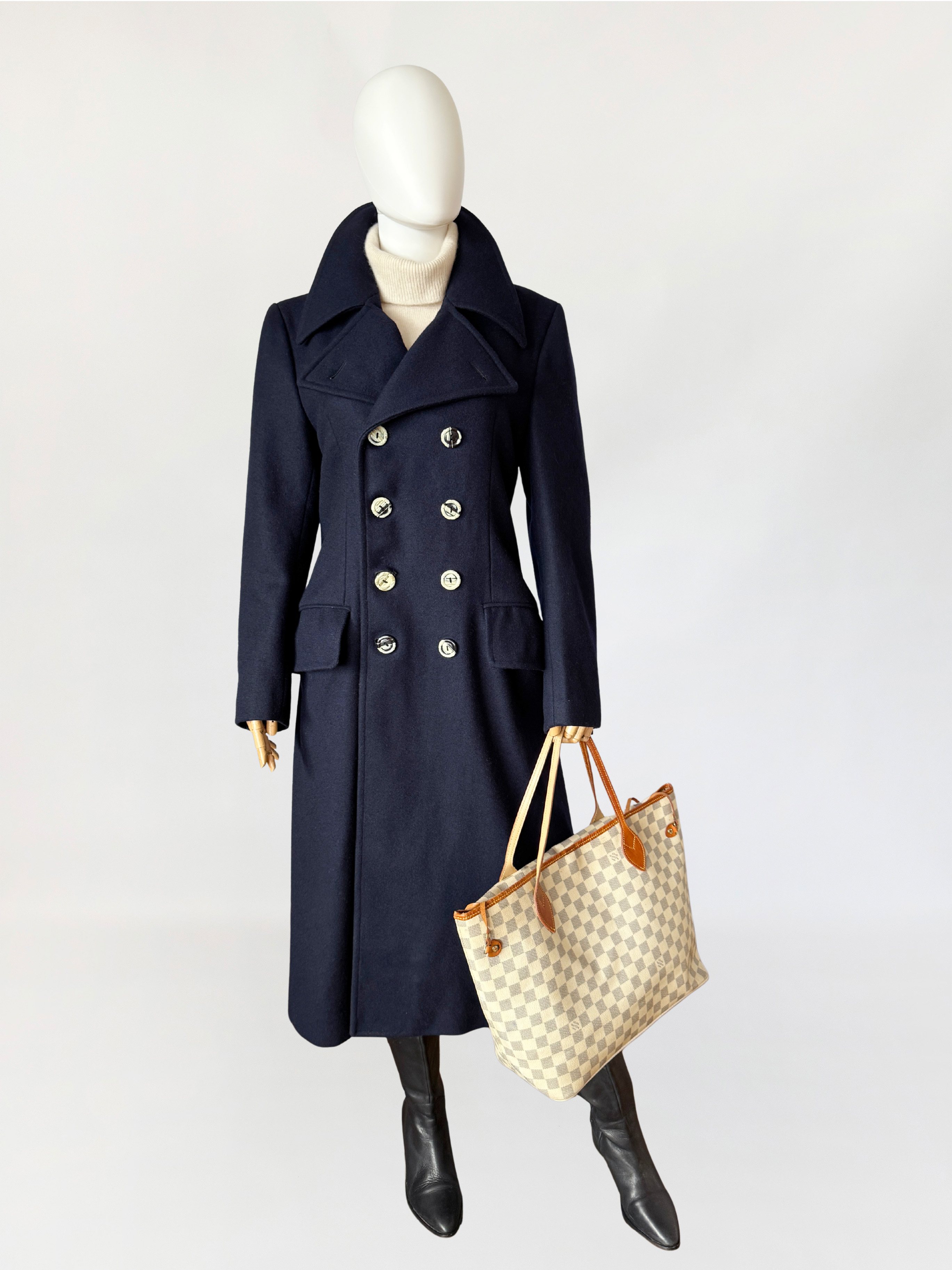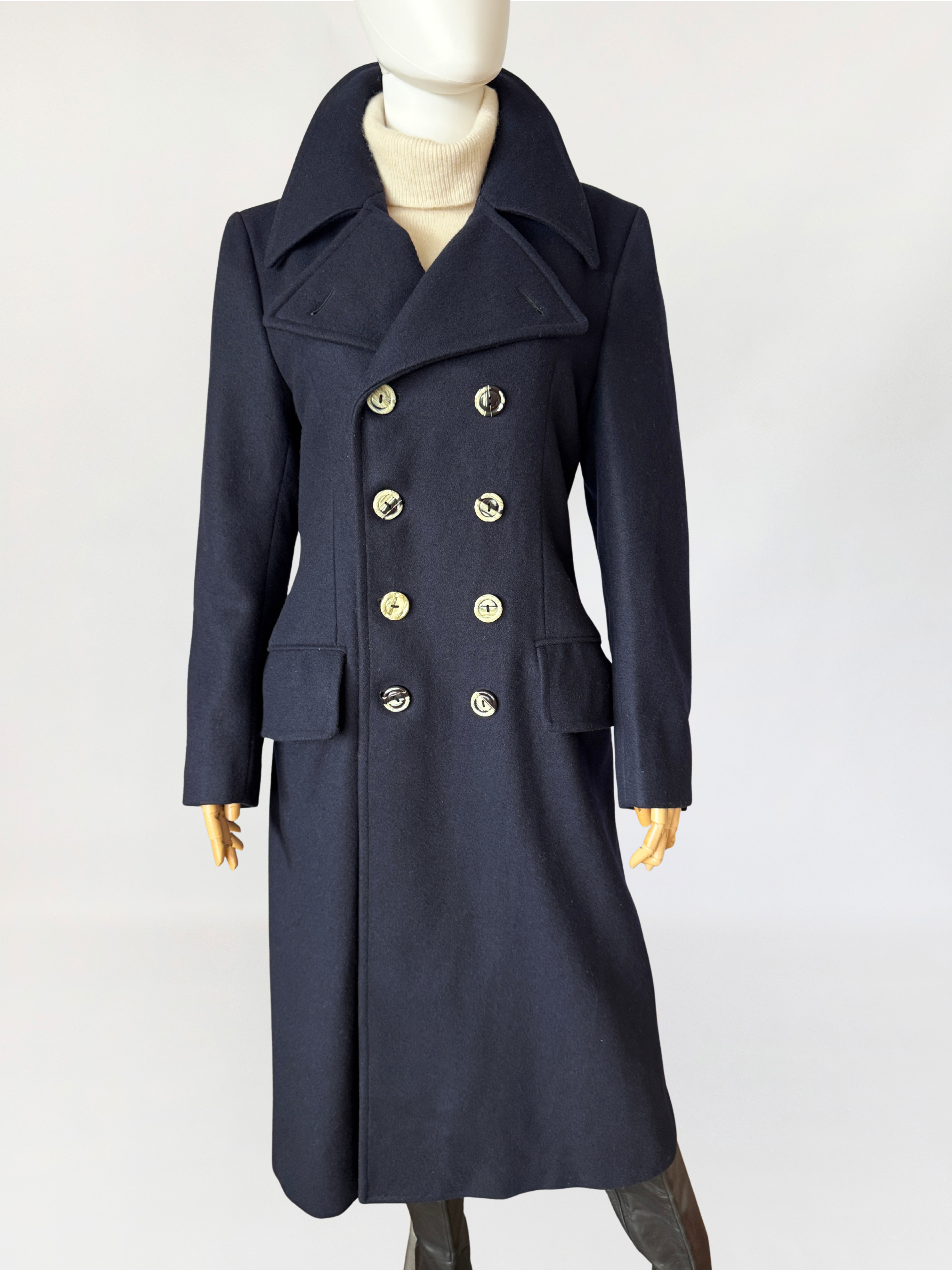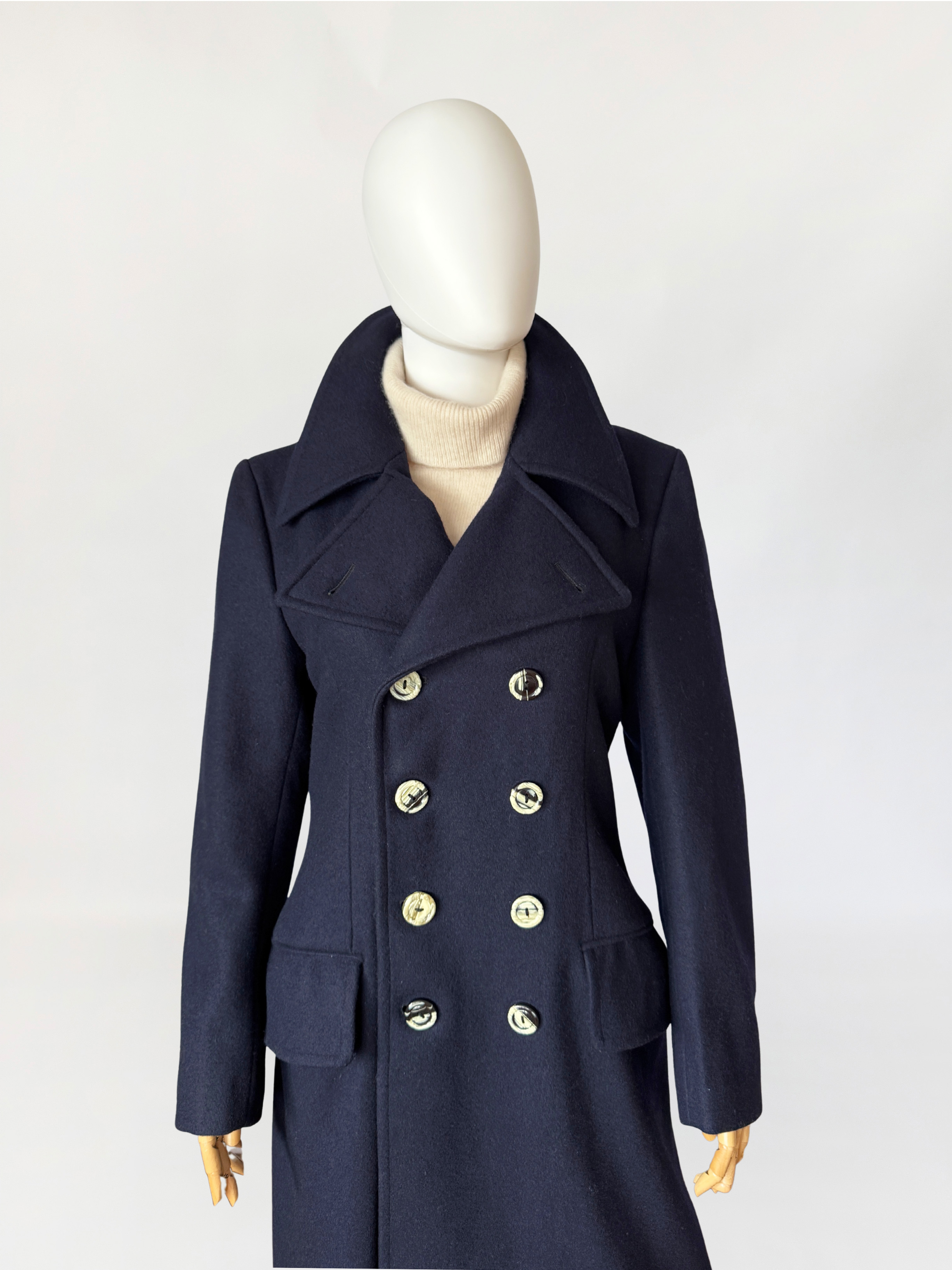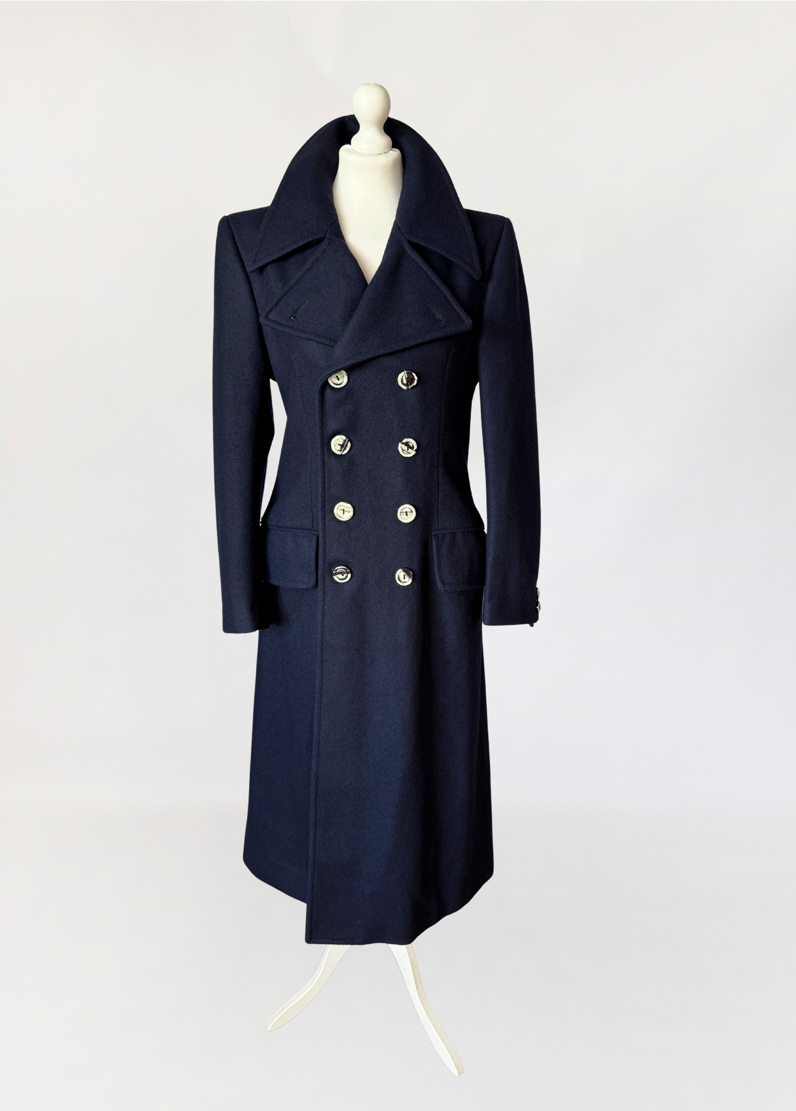 Długi dwurzędowy płaszcz vintage wykonany z masywnej, zwartej wełny o wysokiej gramaturze. Tkanina w kolorze głębokiego granatu, o matowej, jednorodnej powierzchni. Fason inspirowany krojem oficerskim: szerokie, wyraźnie zarysowane klapy, mocno dopasowana linia ramion, podkreślona talia, długość sięgająca połowy łydki. Front zapinany na sześć dużych guzików. Kieszenie z patkami umieszczone symetrycznie na wysokości bioder. Rękawy klasycznie wszywane, zakończone mankietami z małymi guzikami dekoracyjnymi. Ramiona doskonale wyprofilowane, usztywnione. Tył z głęboką kontrafałdą oraz panelem zapinanym na dwa guziki. Płaszcz jest ciężki, dobrze trzyma formę i zapewnia wysoki poziom izolacji termicznej.