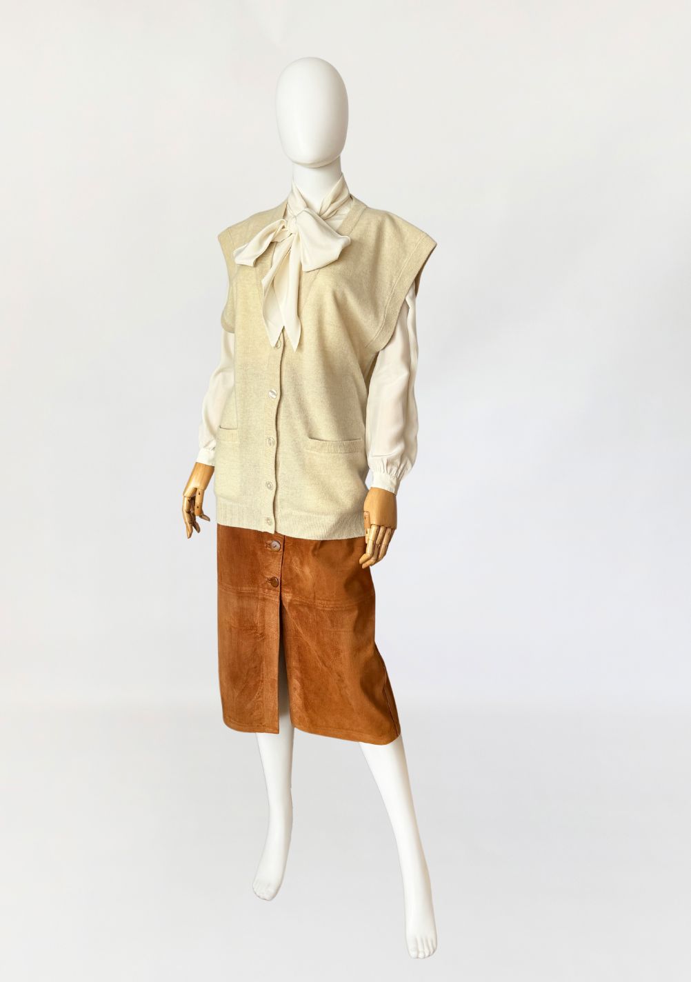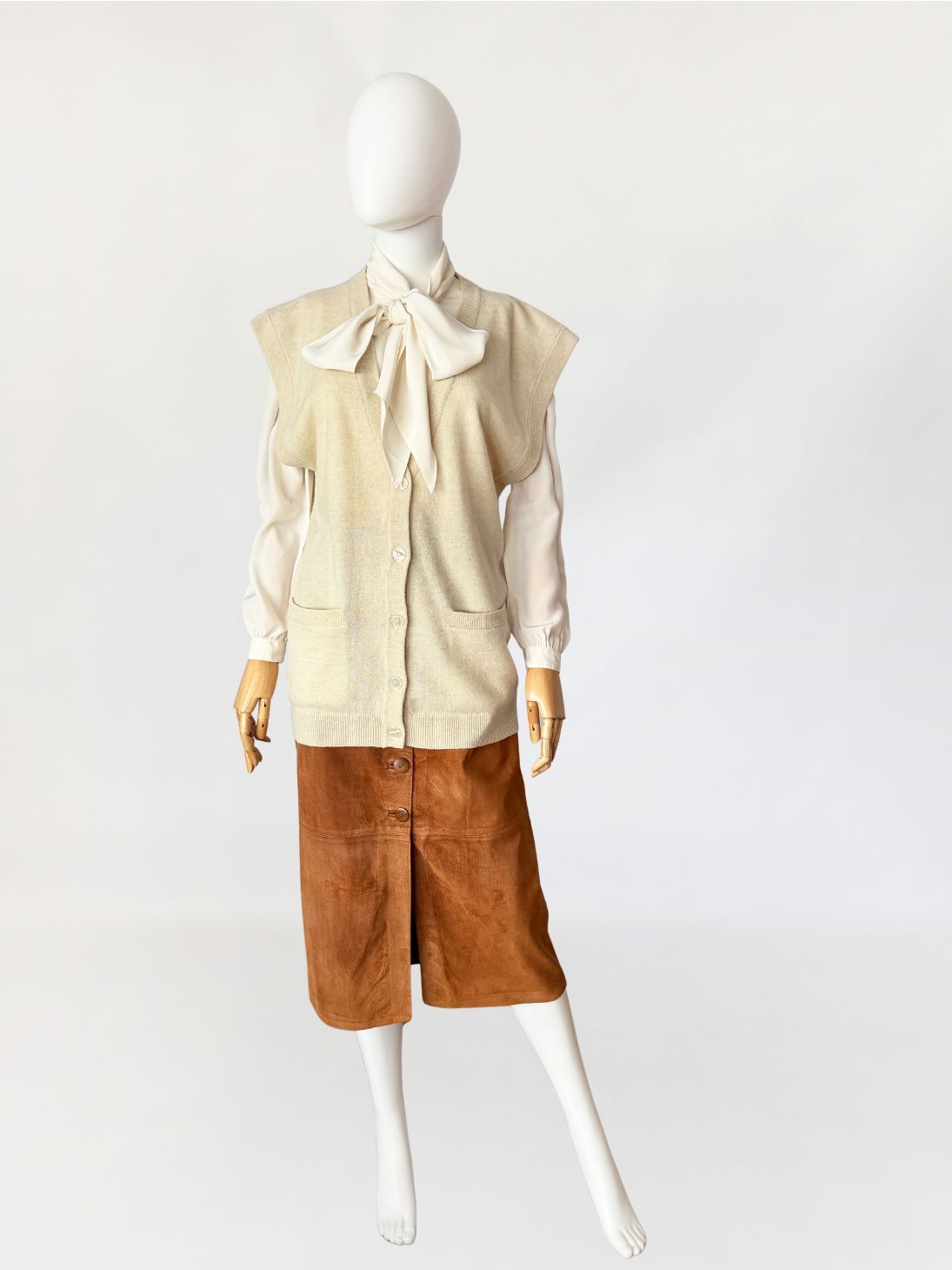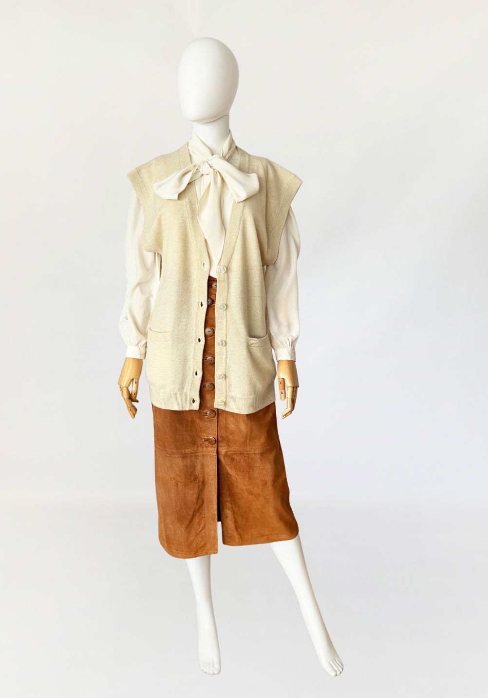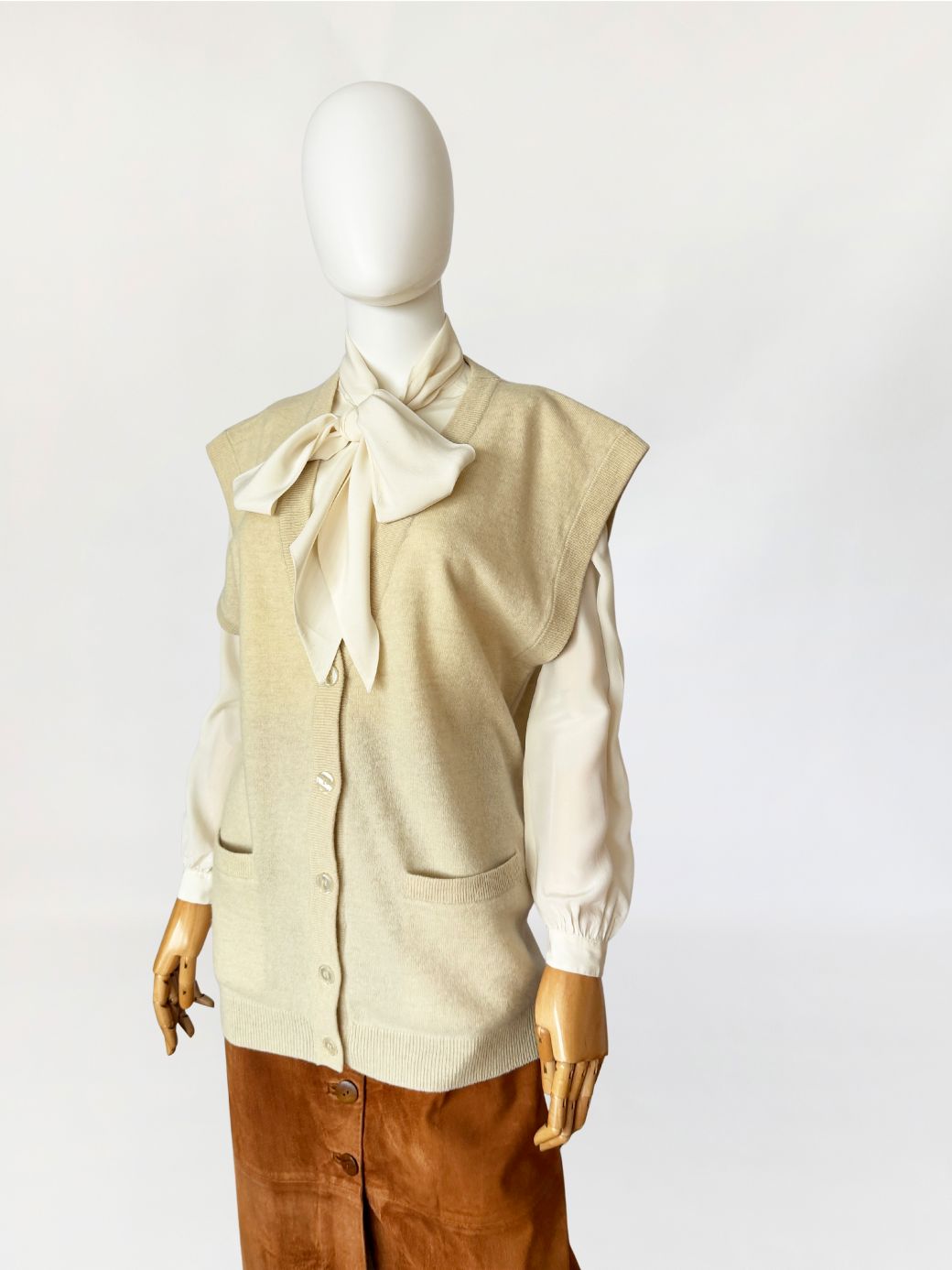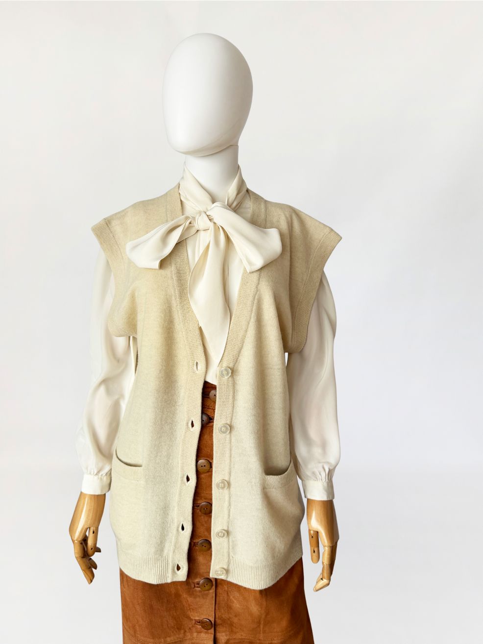 Dzianinowa kamizelka wykonana z miękkiej dzianiny wełniano-kaszmirowej. Model o wydłużonym, swobodnym kroju z głębokim dekoltem w kształcie litery V. Zapięcie na cztery jasne guziki. W dolnej partii przodu dwie naszywane kieszenie o zaokrąglonych dolnych krawędziach. Linia ramion delikatnie wydłużona, bez rękawów. Dół oraz listwa przy dekolcie wykończone elastycznym ściągaczem o drobnym splocie.