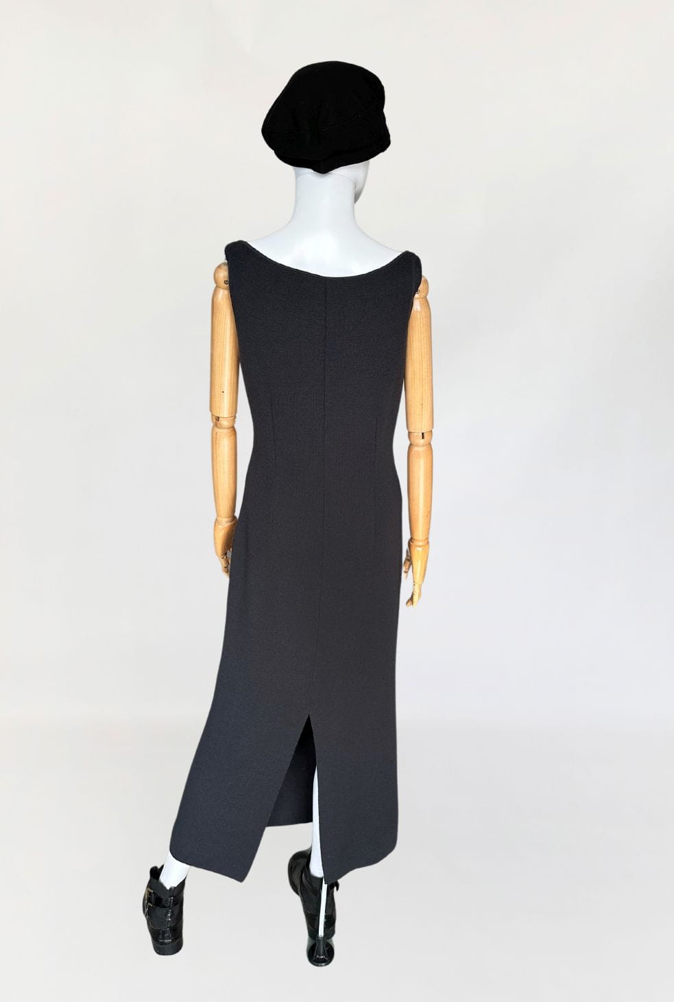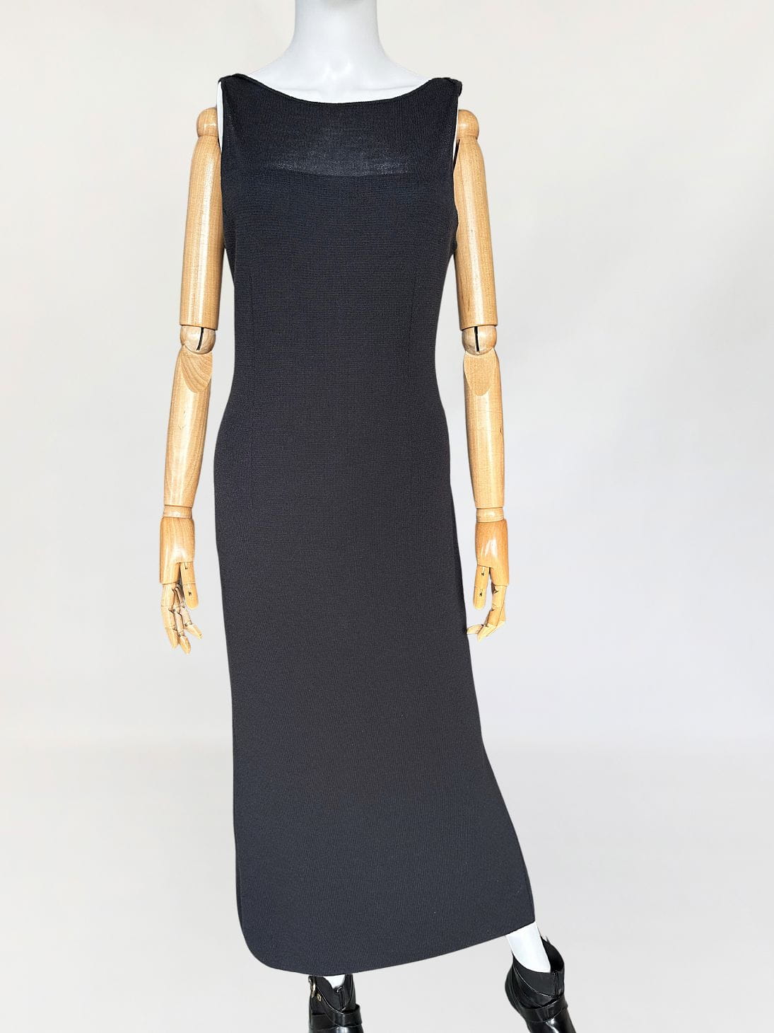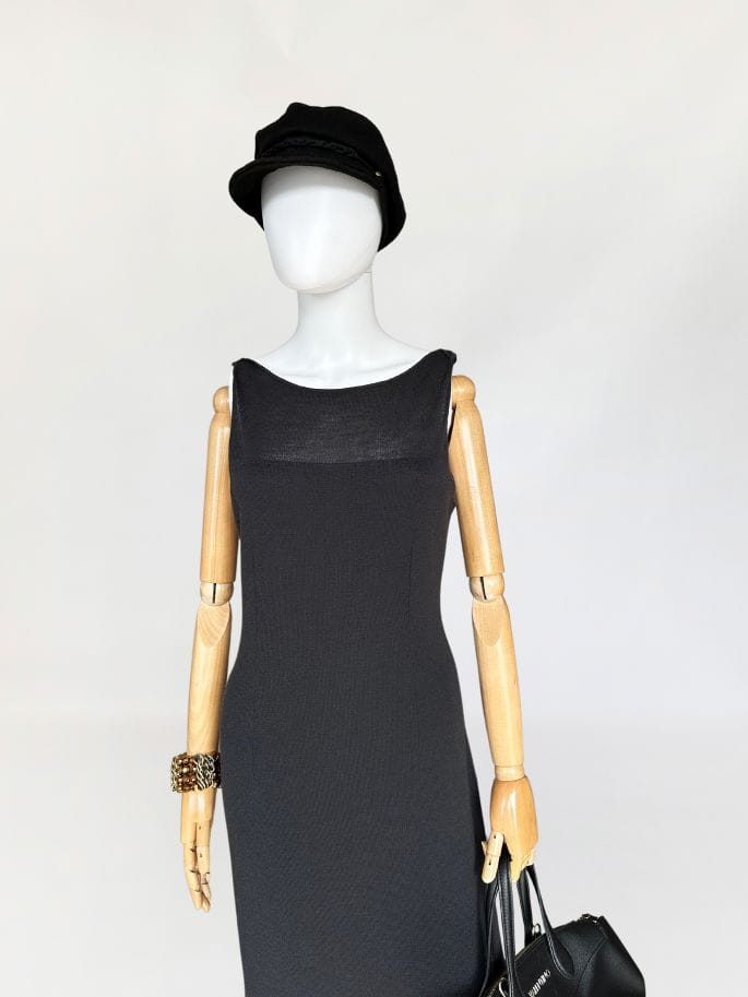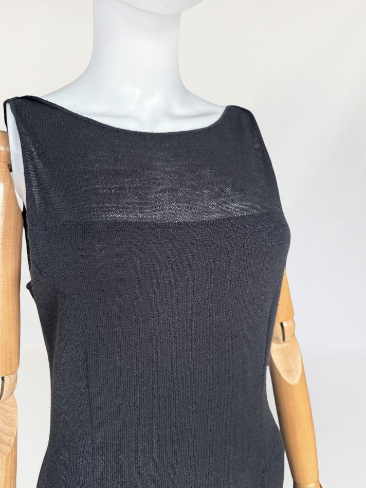 Sukienka vintage wykonana z elastycznej dzianiny. Model o długości maxi z zabudowaną górą bez rękawów. Z tyłu wysoki rozporek. Nie ma podszewki.
