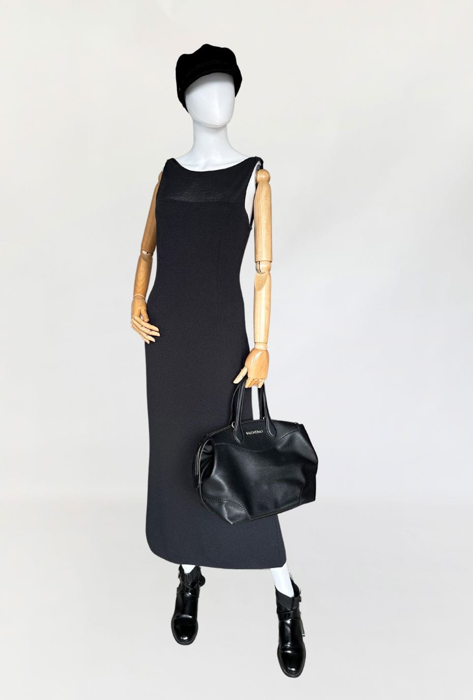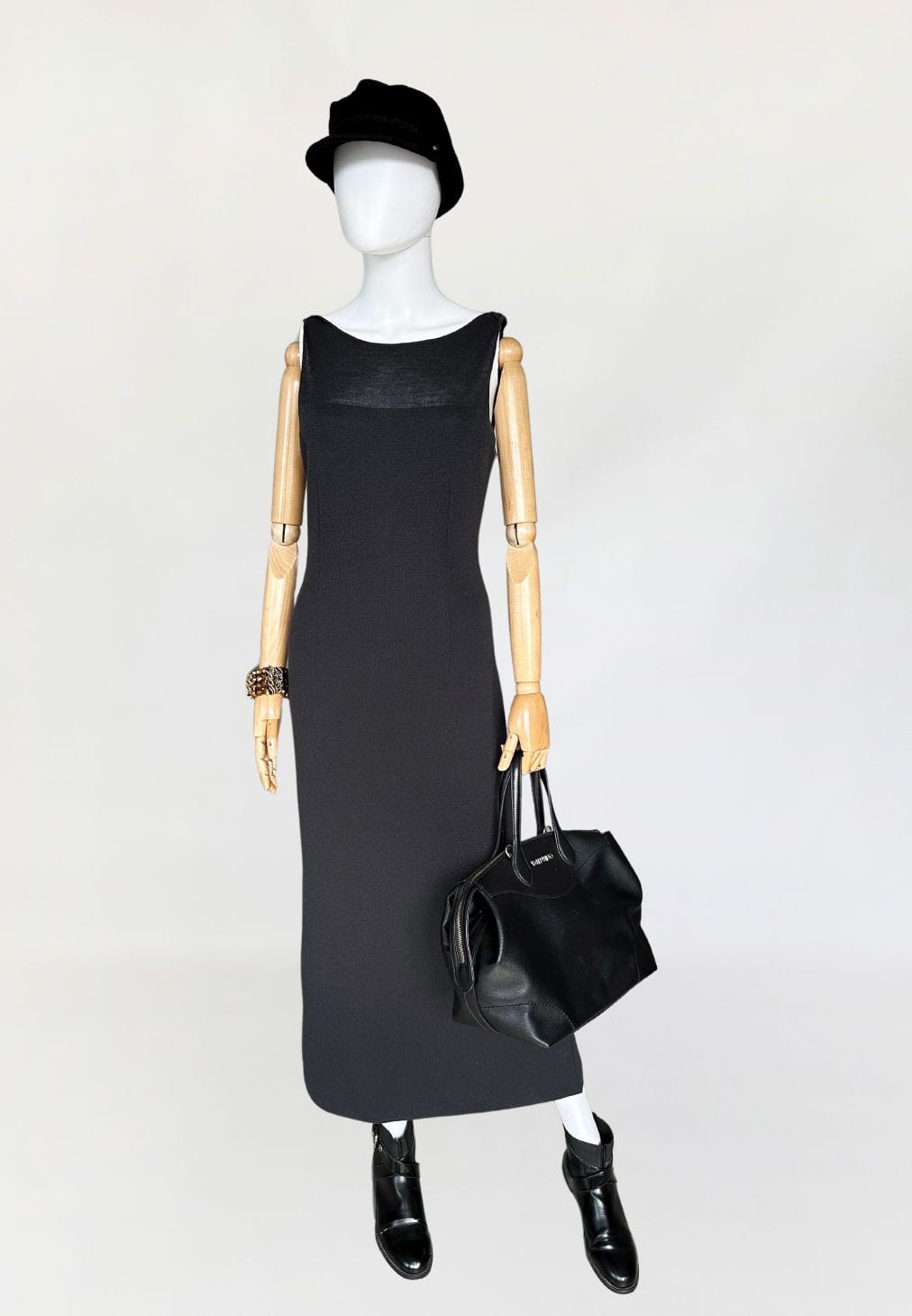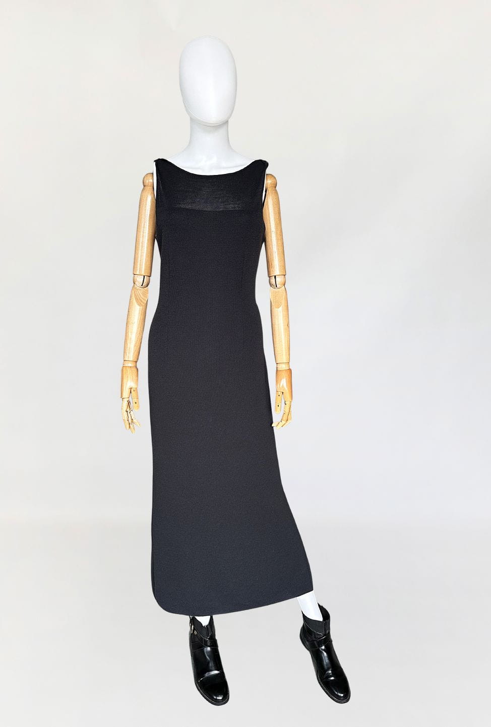 Sukienka vintage wykonana z elastycznej dzianiny. Model o długości maxi z zabudowaną górą bez rękawów. Z tyłu wysoki rozporek. Nie ma podszewki.