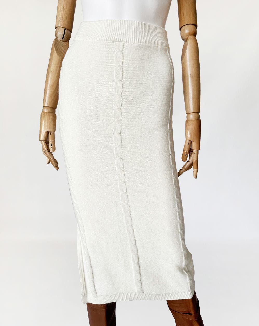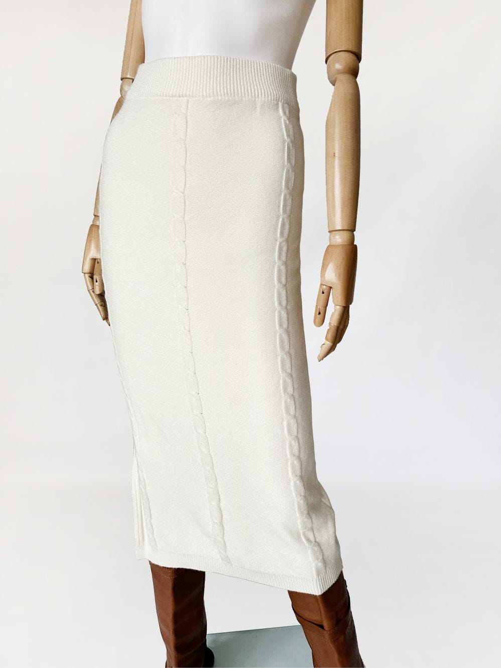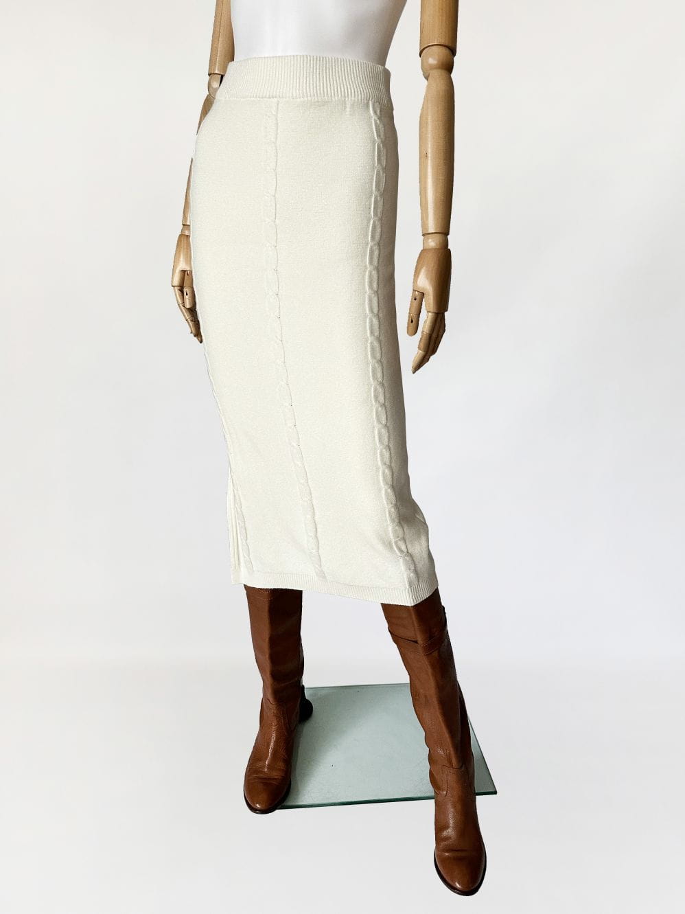 Nieużywana, z papierową metką. Spódnica midi uszyta z elastycznej miękkiej dzianiny w kolorze kremowym. Na całości pionowe plecione wstawki.