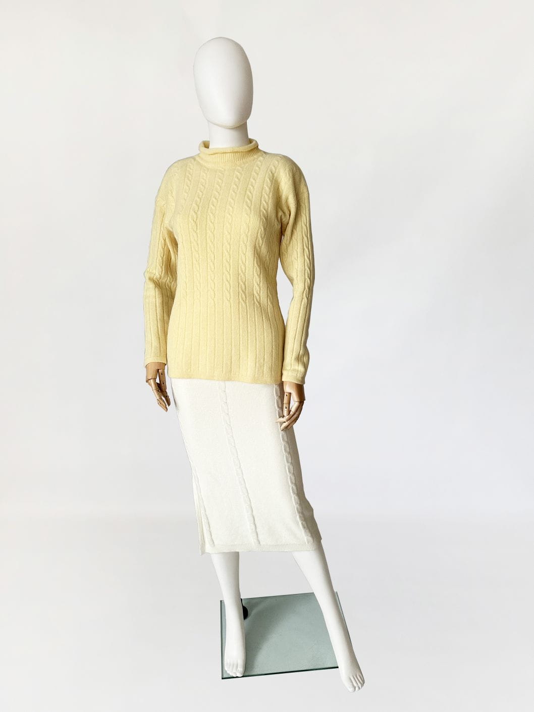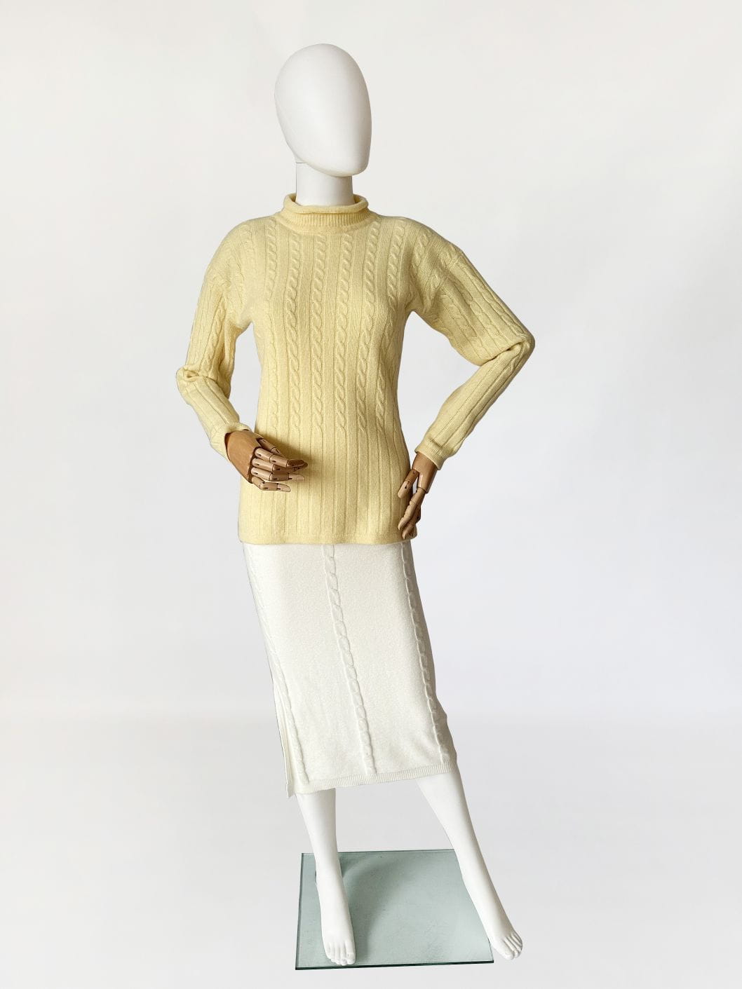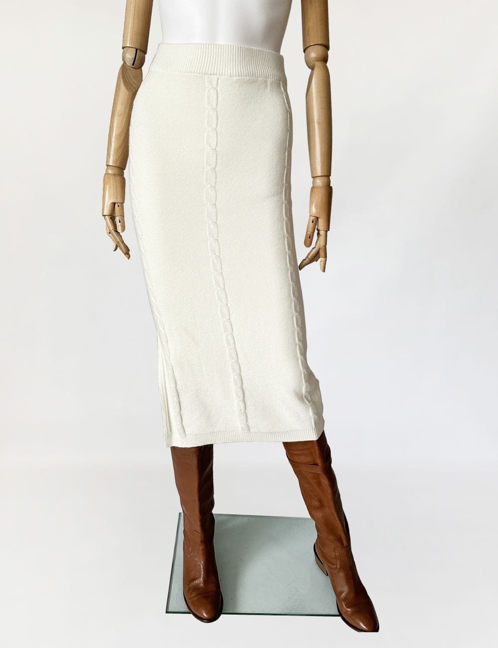 Nieużywana, z papierową metką. Spódnica midi uszyta z elastycznej miękkiej dzianiny w kolorze kremowym. Na całości pionowe plecione wstawki.