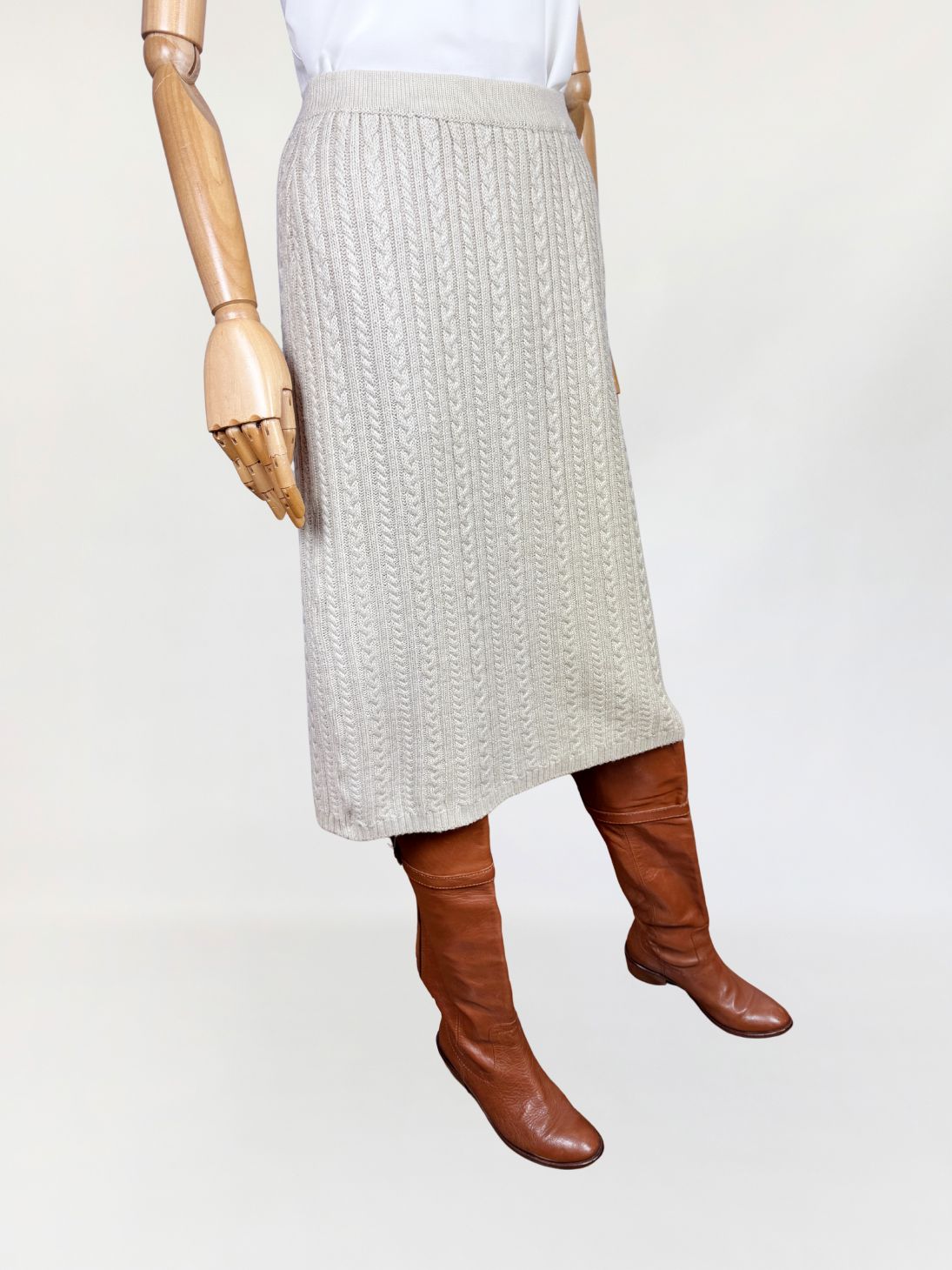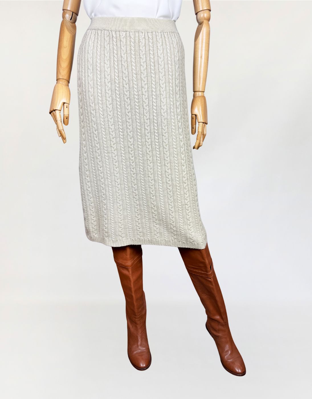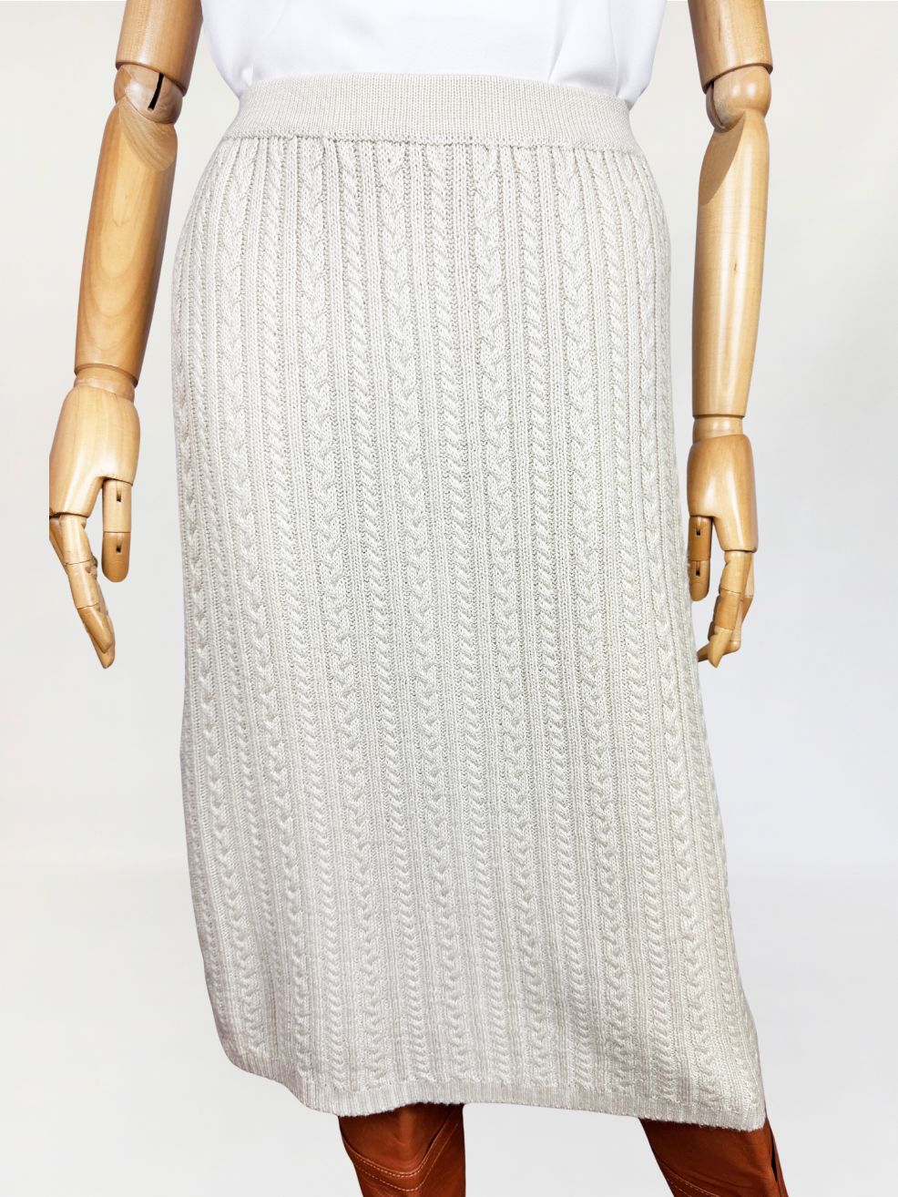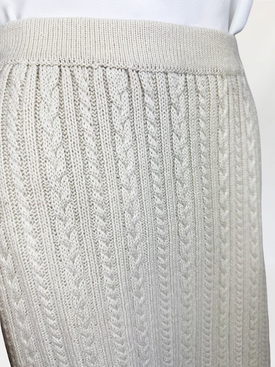 Ołówkowa spódnica wykonana z miękkiej dzianiny o wyraźnym, pionowym splocie warkoczowym. Model o długości za kolano, z elastyczną talią. Dzianina w odcieniu jasnego beżu, od wewnątrz na podszewce.