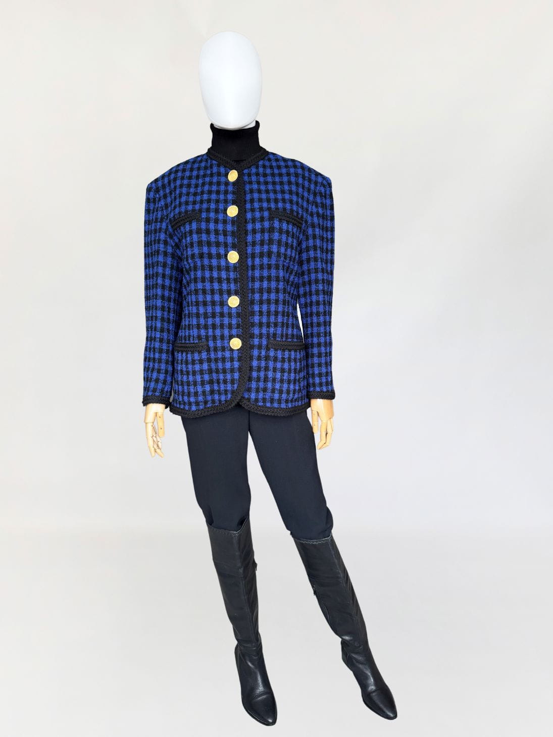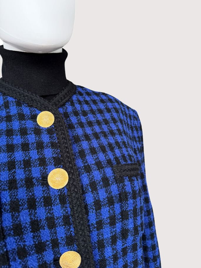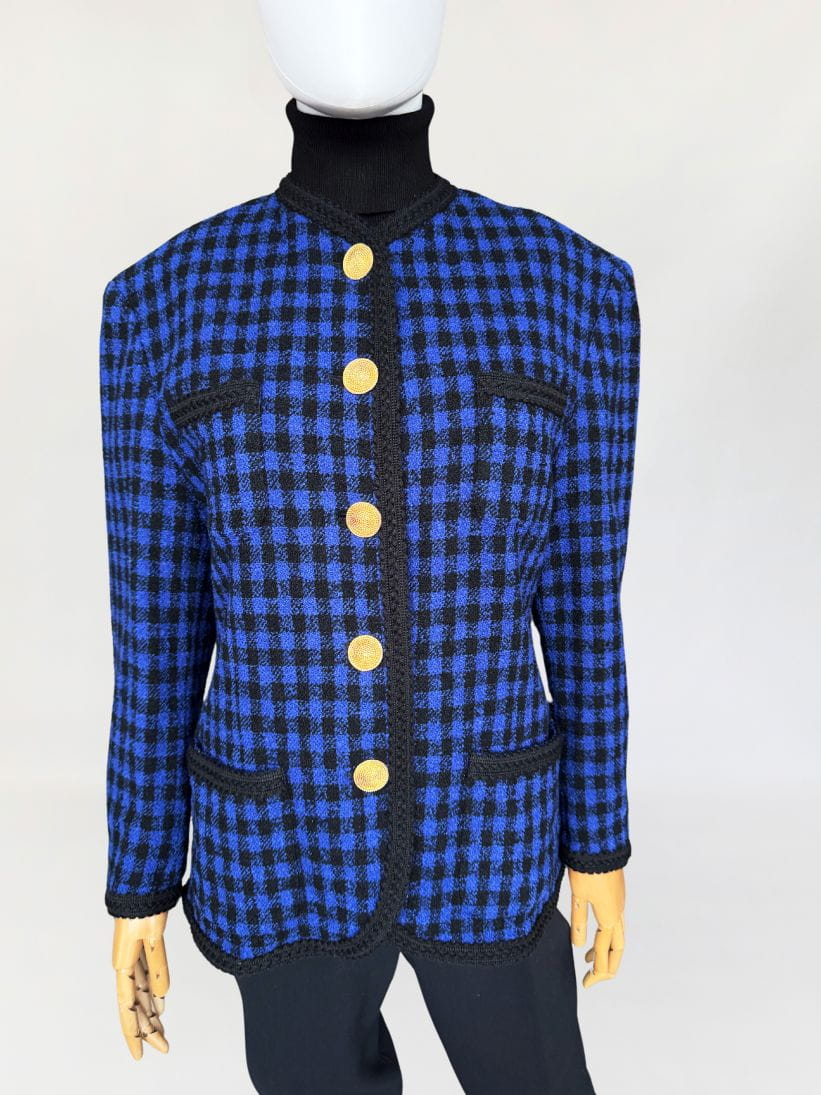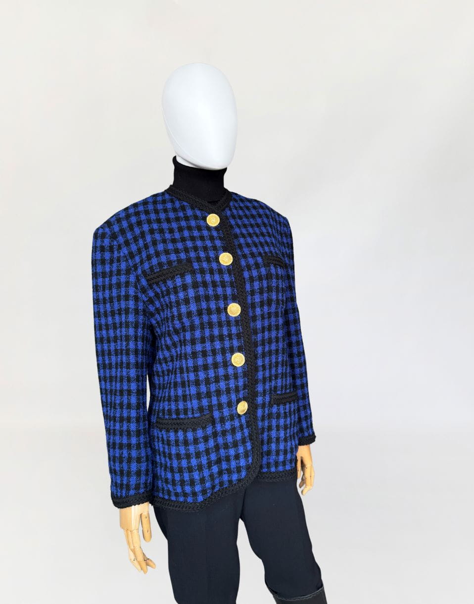 Marynarka w stylu old money, vintage z lat 90-tych marki Elegance z linii Prestige. Wykonana z wełnianej tkaniny boucle o deseniu w kratę. Zapinana na biżuteryjne złote duże guziki. Wykończona czarną dekoracyjną lamówką.