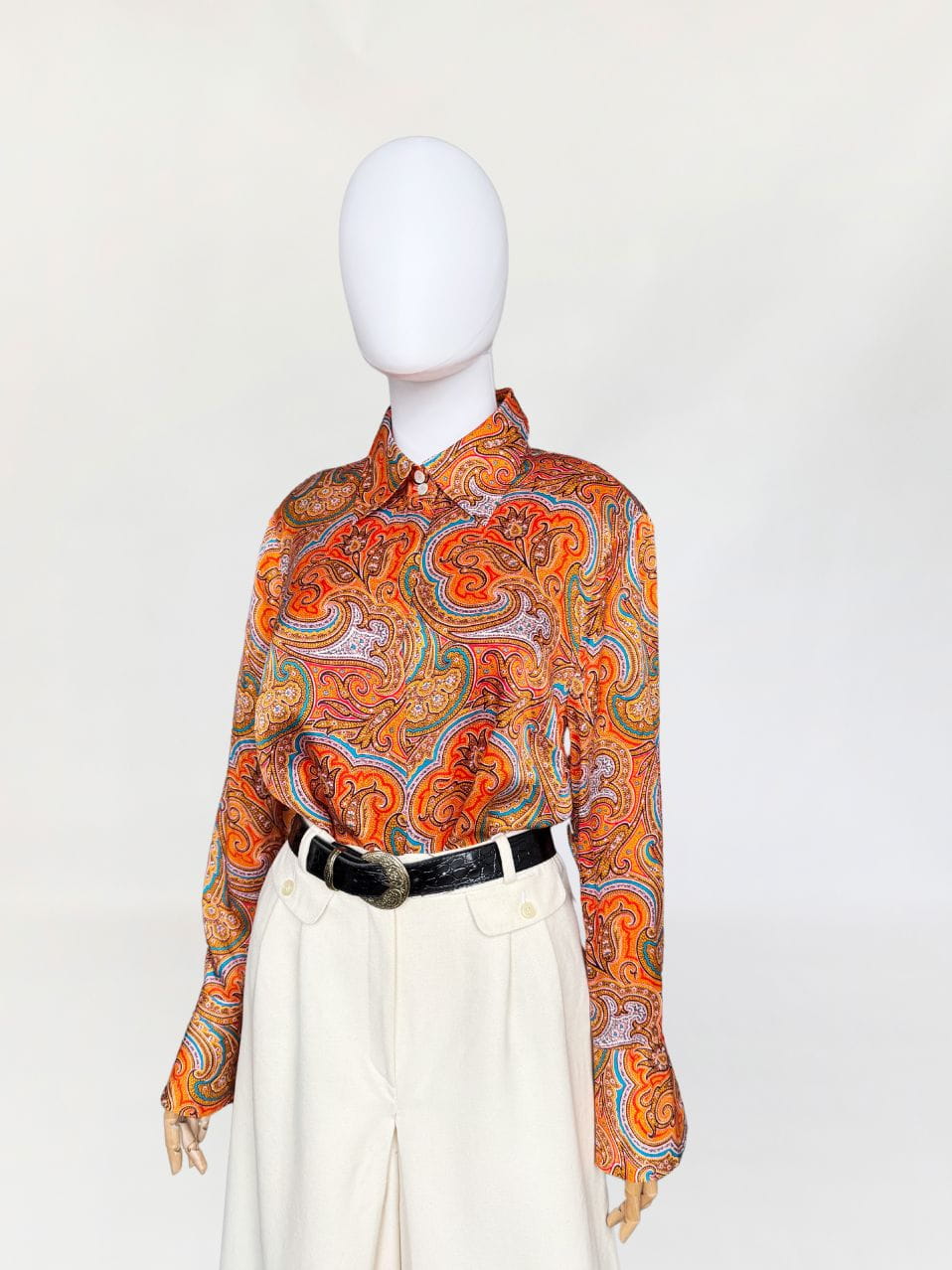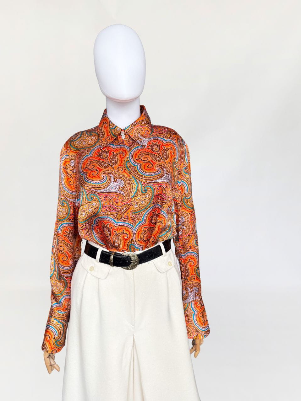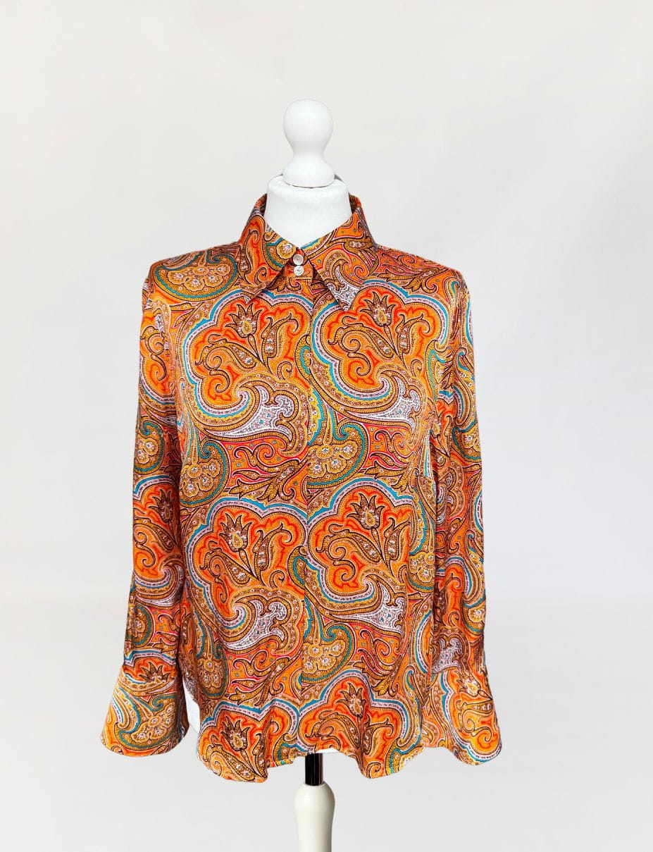 Koszula z linii Prestige marki Elegance. Wykonana z jedwabnej satyny w energetyczne wzory. Klasyczny fason z długimi rękawami. Zapinana na guziki pod plisą maskującą.