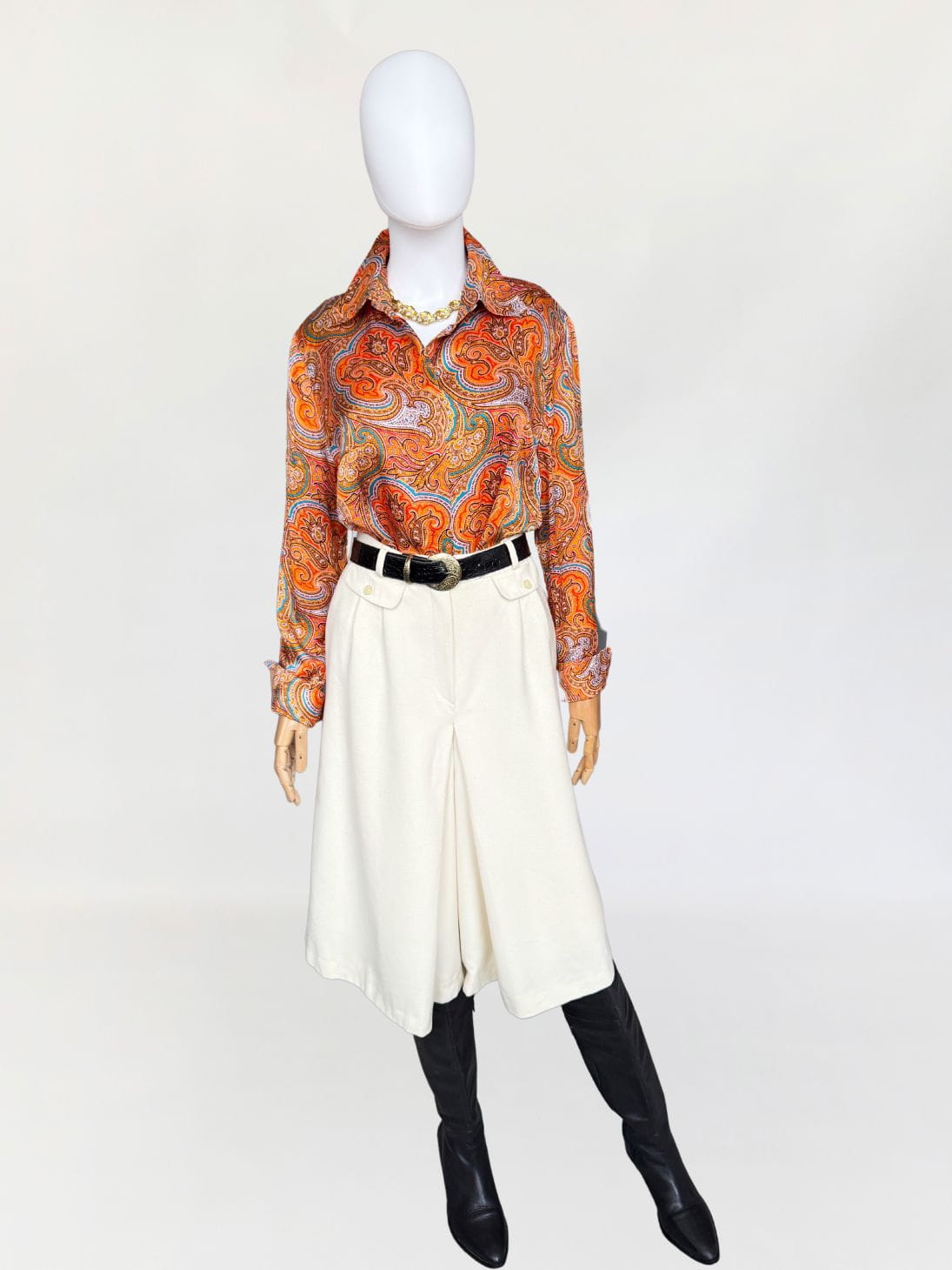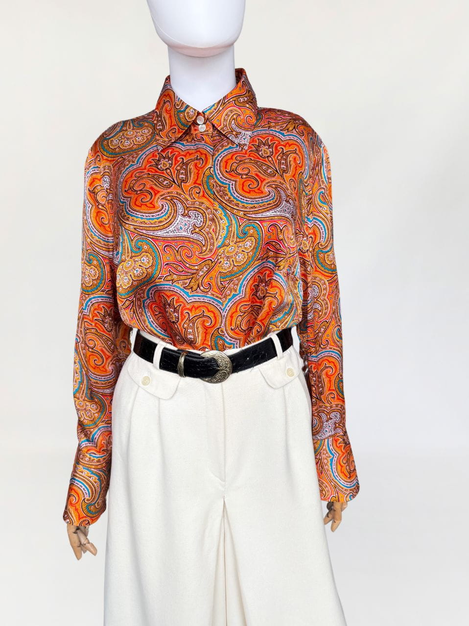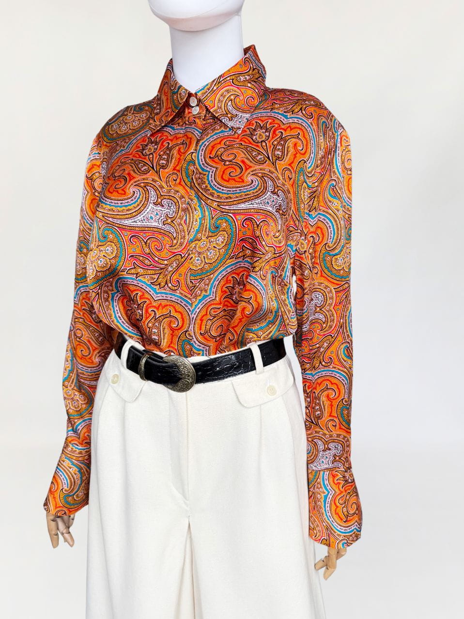 Koszula z linii Prestige marki Elegance. Wykonana z jedwabnej satyny w energetyczne wzory. Klasyczny fason z długimi rękawami. Zapinana na guziki pod plisą maskującą.