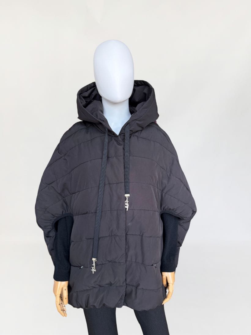 Oryginalna pikowana kurtka marki Elisabetta Franchi. Model loose fit o swobodnym fasonie z wypustkami na ręce. Zapinana na napy. U góry kaptur zakończone rypsowymi wstążkami z charmsami - inicjałami marki. W dolnej części zasuwane kieszenie. Cena regularna nowej ok 500 euro