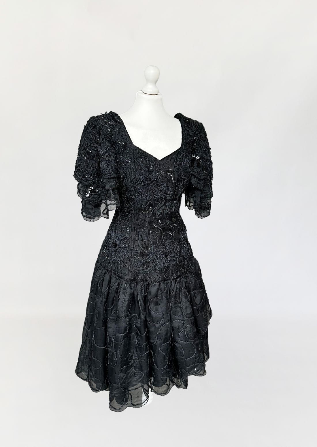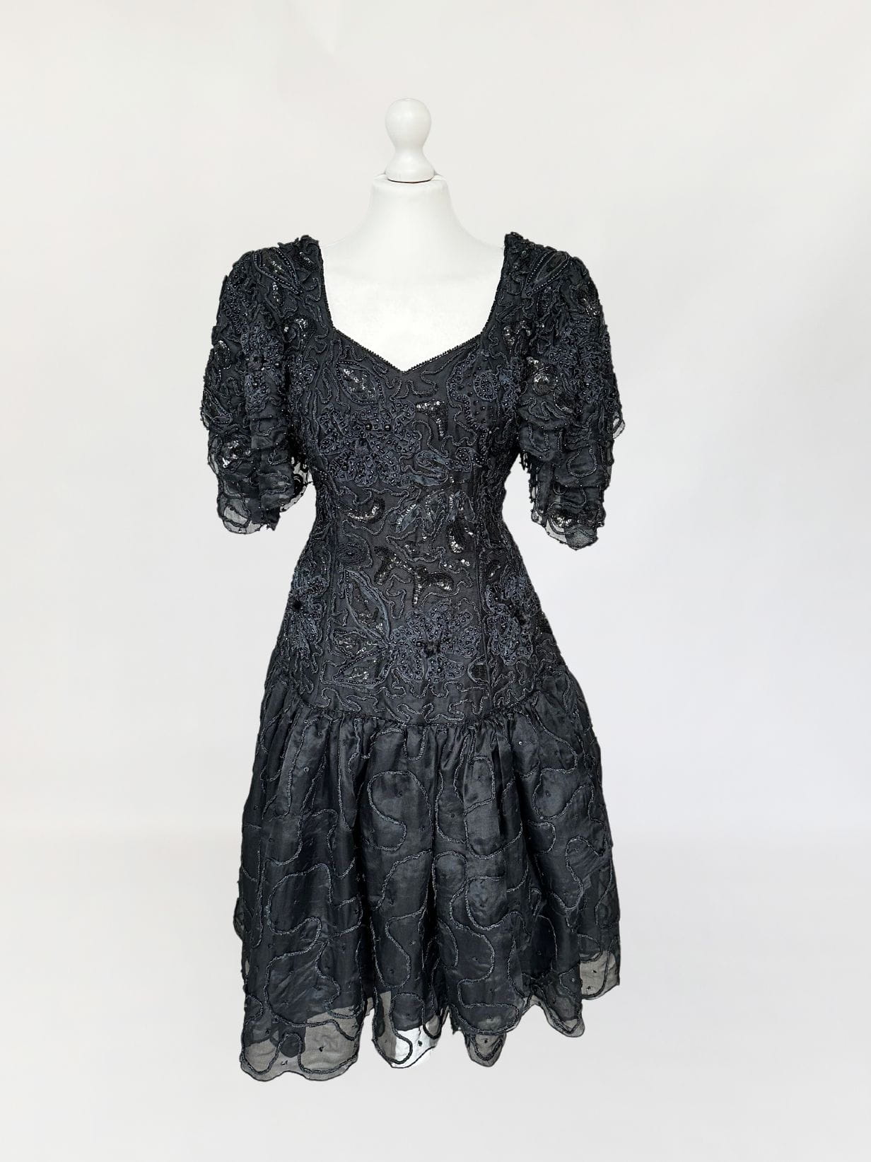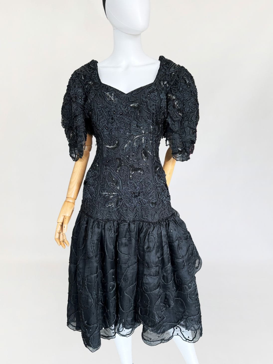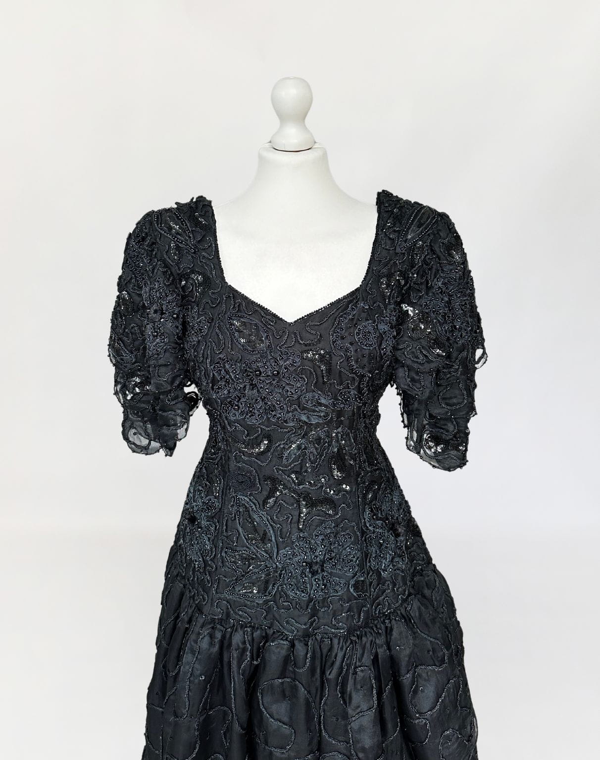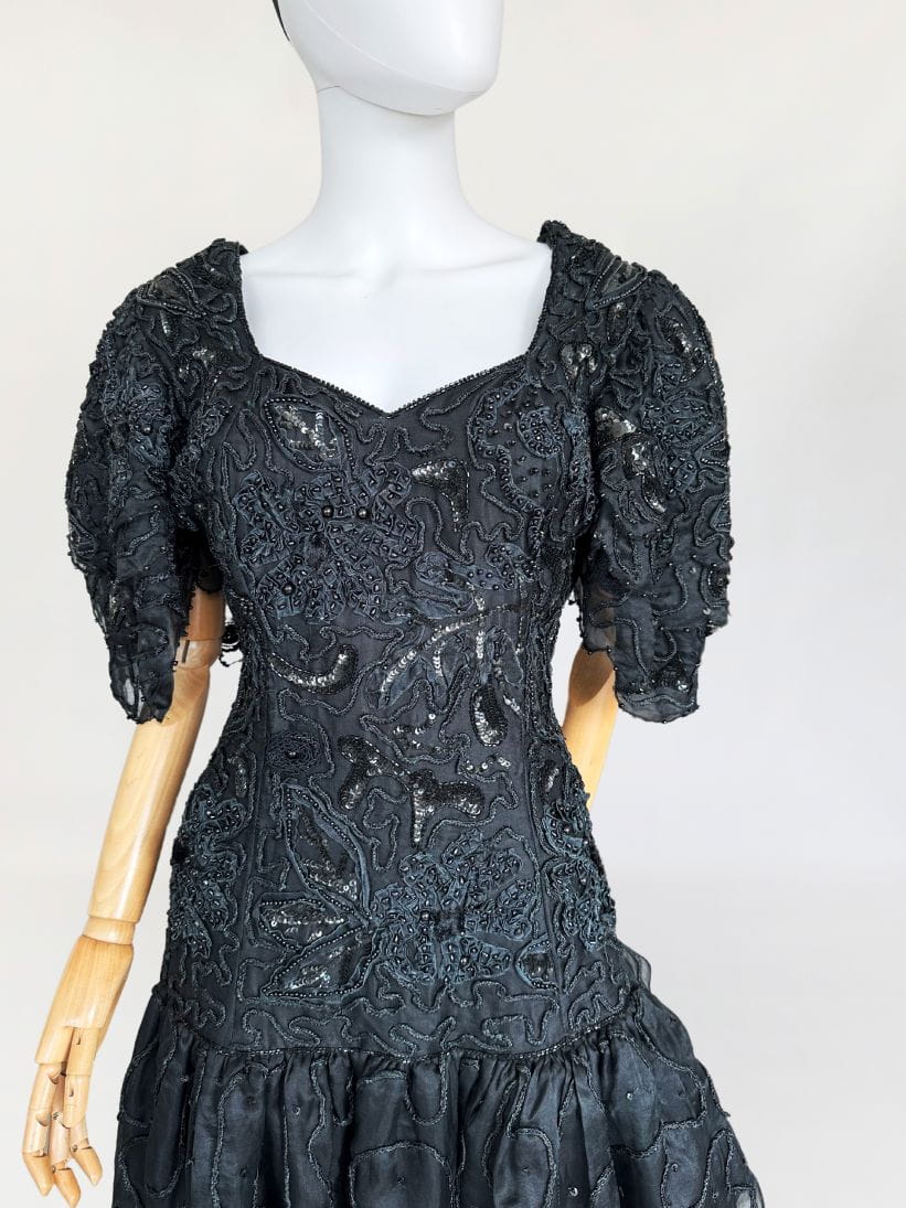 Zjawiskowa wieczorowa sukienka vintage z lat 80-tych, kultowej marki Ella Singh. Wspaniała kreacja wykonana z naturalnego jedwabiu który w całości zdobią, charakterystyczne dla projektantki misterne ręczne zdobienia. Góra o dopasowanym fasonie, z lekko obniżonym pasem. Ramiona wzmocnione poduszkami, a na nich efektowne, dostojne rękawy. Dół rozkloszowany, falbaniasty. Prawdziwe dzieło sztuki z dekady przepychu. Ceny modeli projektantki osiągają zawrotne kwoty.