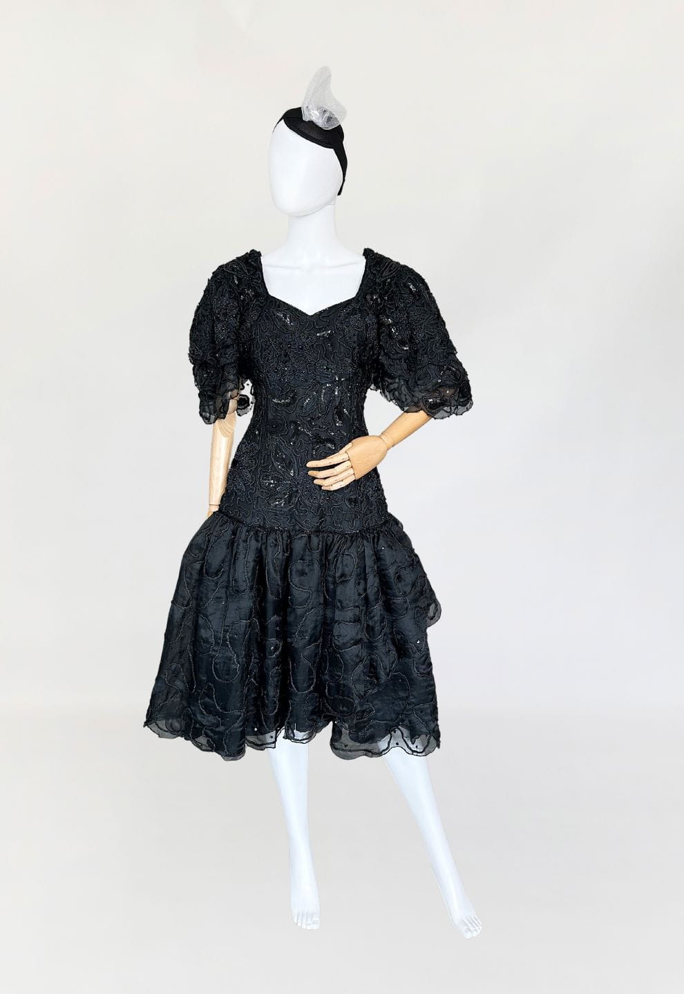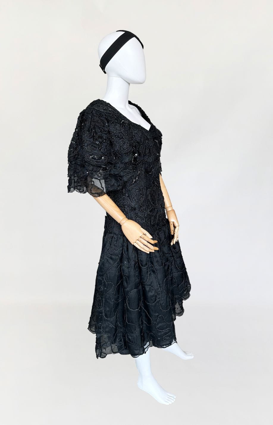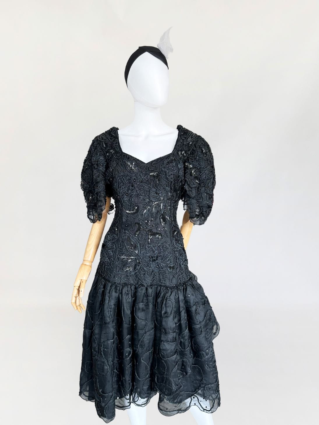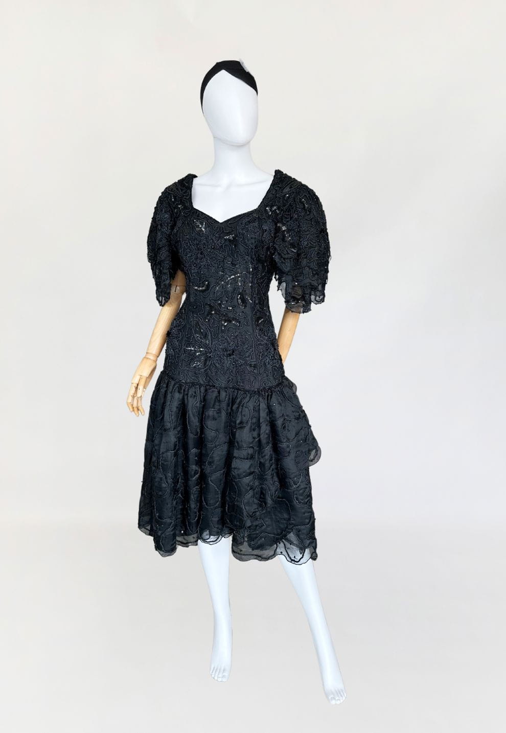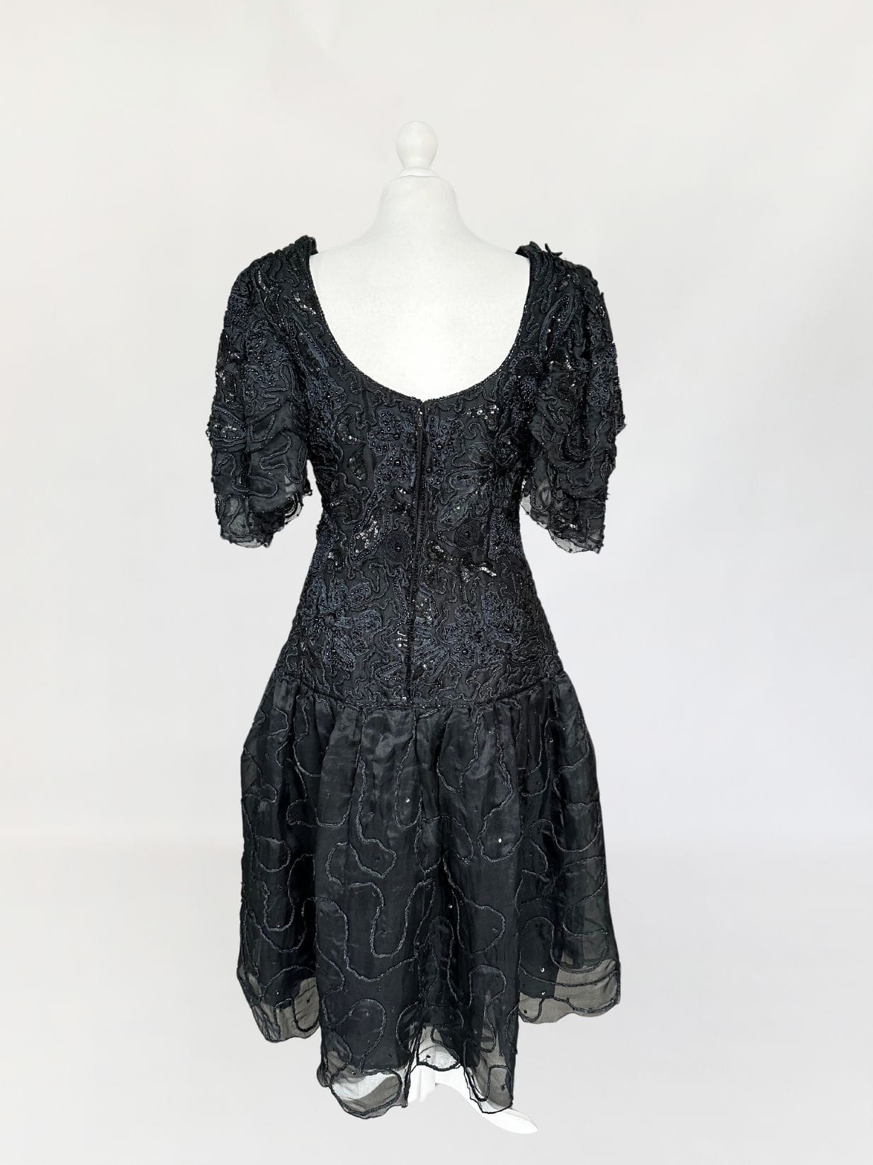 Zjawiskowa wieczorowa sukienka vintage z lat 80-tych, kultowej marki Ella Singh. Wspaniała kreacja wykonana z naturalnego jedwabiu który w całości zdobią, charakterystyczne dla projektantki misterne ręczne zdobienia. Góra o dopasowanym fasonie, z lekko obniżonym pasem. Ramiona wzmocnione poduszkami, a na nich efektowne, dostojne rękawy. Dół rozkloszowany, falbaniasty. Prawdziwe dzieło sztuki z dekady przepychu. Ceny modeli projektantki osiągają zawrotne kwoty.