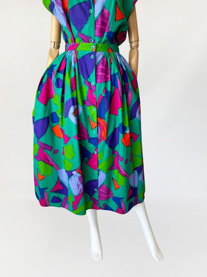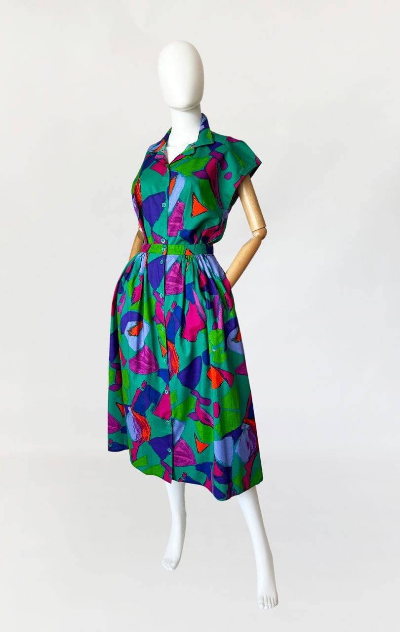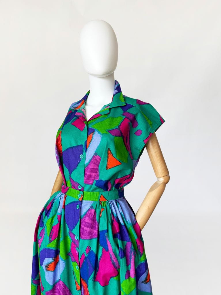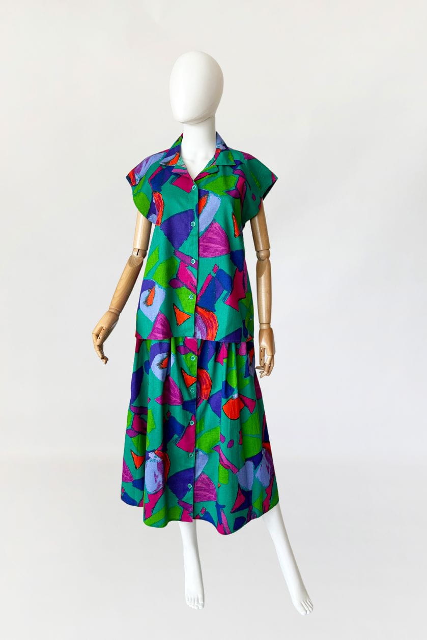 Vintage set wykonany z bawełnianego płótna we wzory w energetycznych kolorach. Na komplet składa się rozpinana koszulowa bluzka, oraz długa spódnica o rozkloszowanym fasonie. W bocznych szwach ma kieszenie. Mocna, żywa kolorystyka sprawia że nie da się przejść obok niego obojętnie.