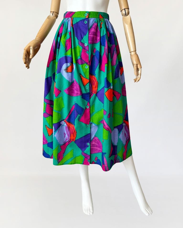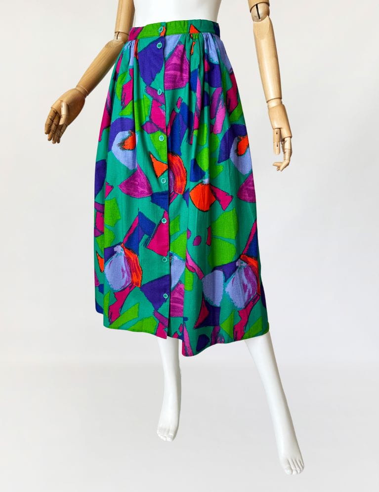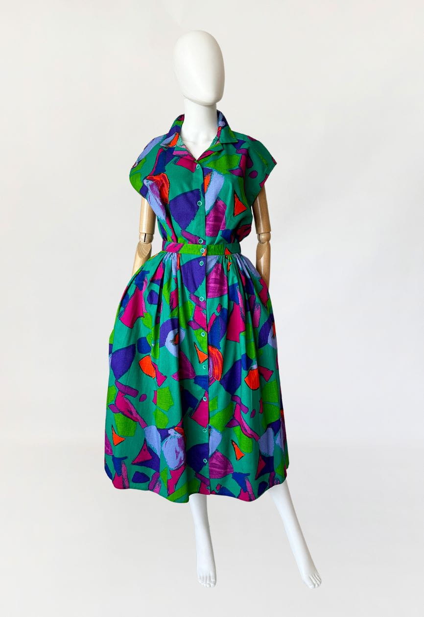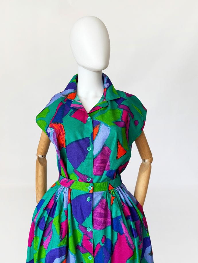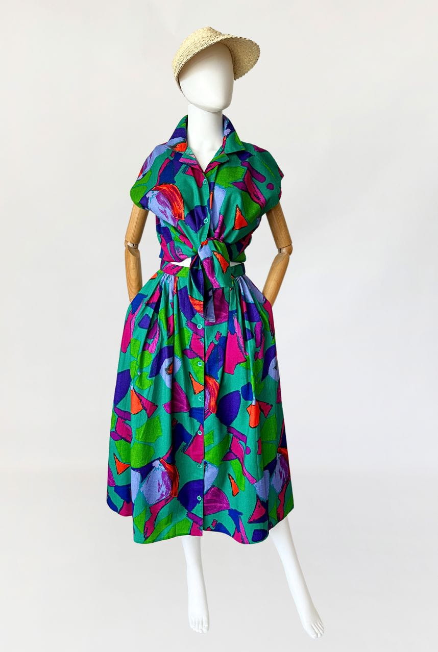 Vintage set wykonany z bawełnianego płótna we wzory w energetycznych kolorach. Na komplet składa się rozpinana koszulowa bluzka, oraz długa spódnica o rozkloszowanym fasonie. W bocznych szwach ma kieszenie. Mocna, żywa kolorystyka sprawia że nie da się przejść obok niego obojętnie.