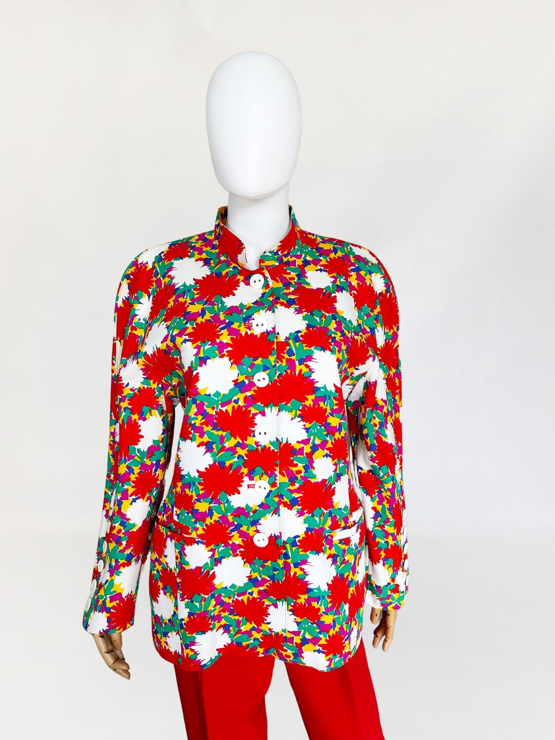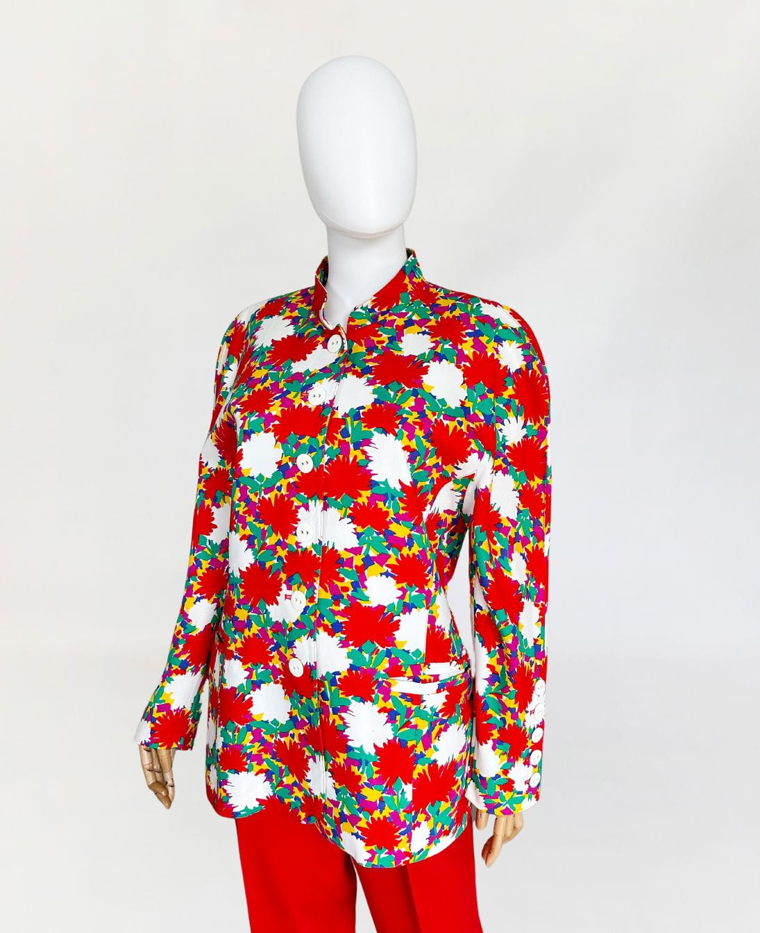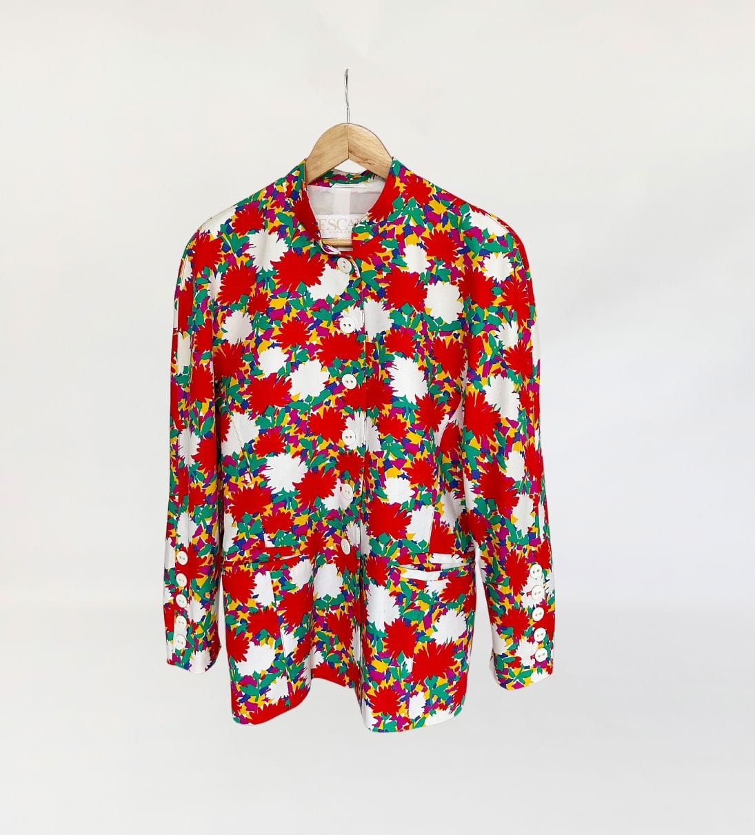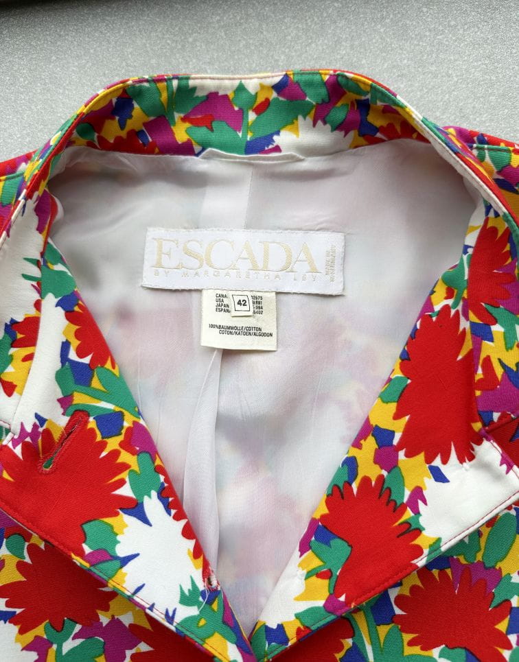 Marynarka vintage z lat 80-tych marki Escada. Wykonana z bawełnianej tkaniny w kwiatowe kolory w świeżych, mocnych barwach. Dłuższy fason z raglanowymi rękawami, u góry stójka. Zapinana na duże mleczne guziki.