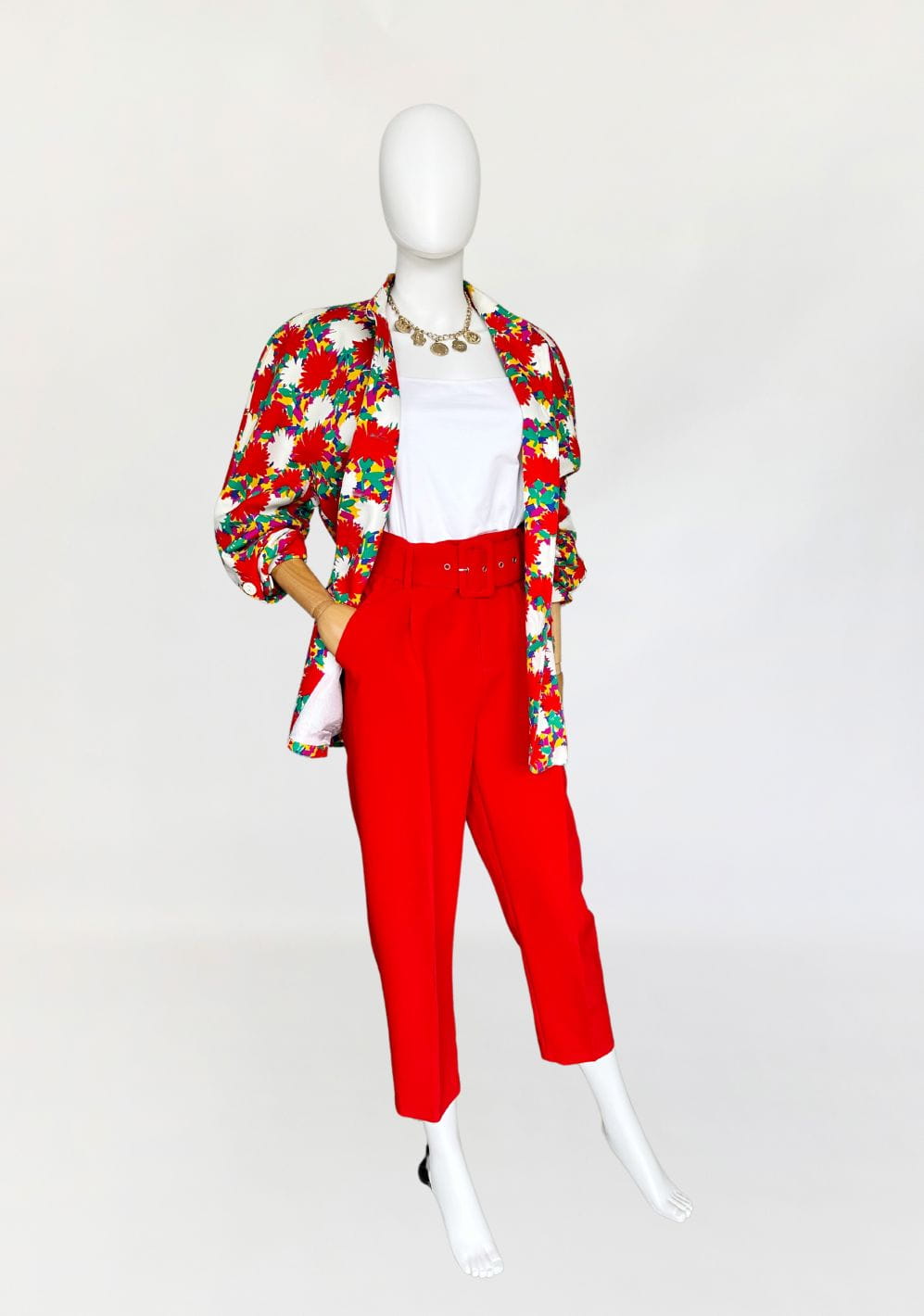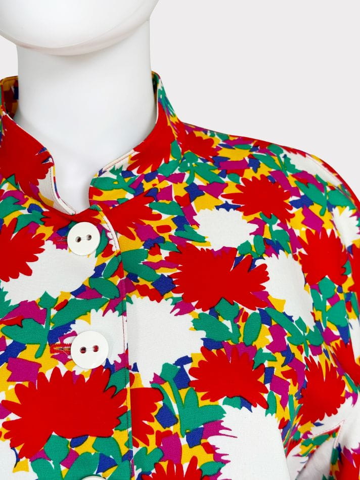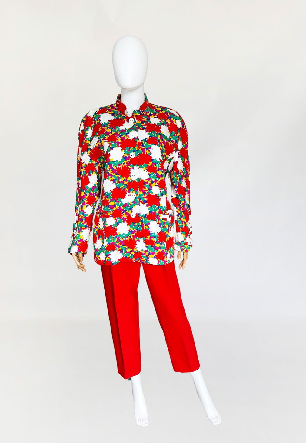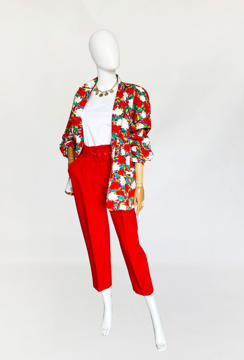 Marynarka vintage z lat 80-tych marki Escada. Wykonana z bawełnianej tkaniny w kwiatowe kolory w świeżych, mocnych barwach. Dłuższy fason z raglanowymi rękawami, u góry stójka. Zapinana na duże mleczne guziki.