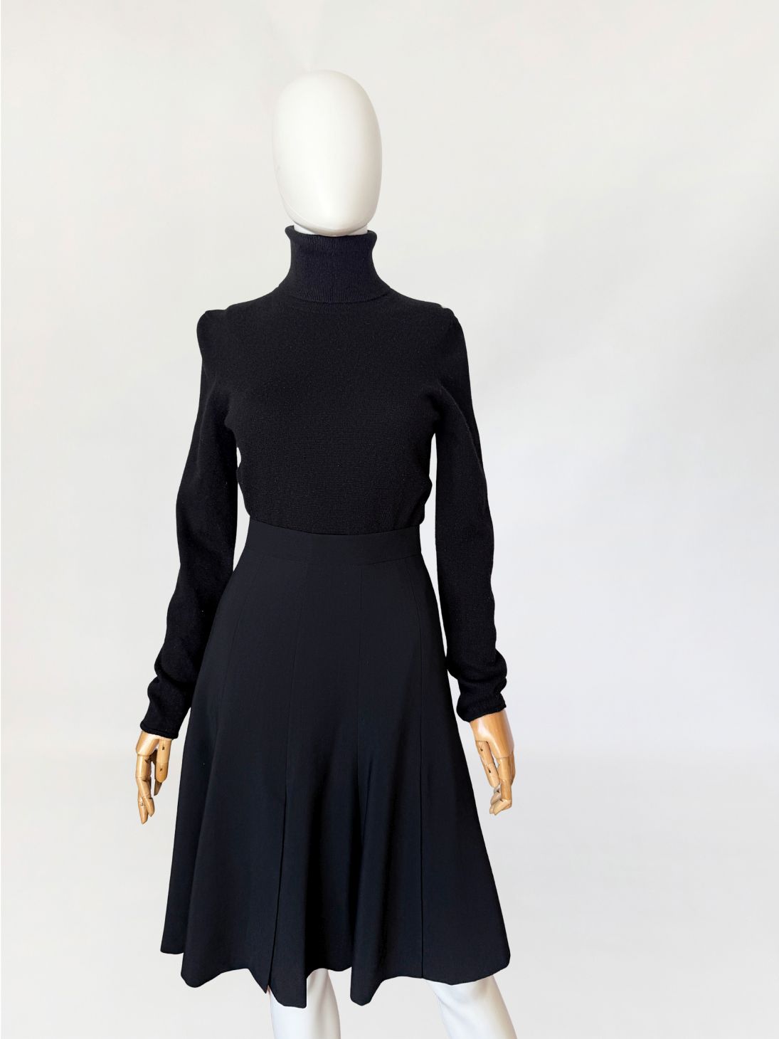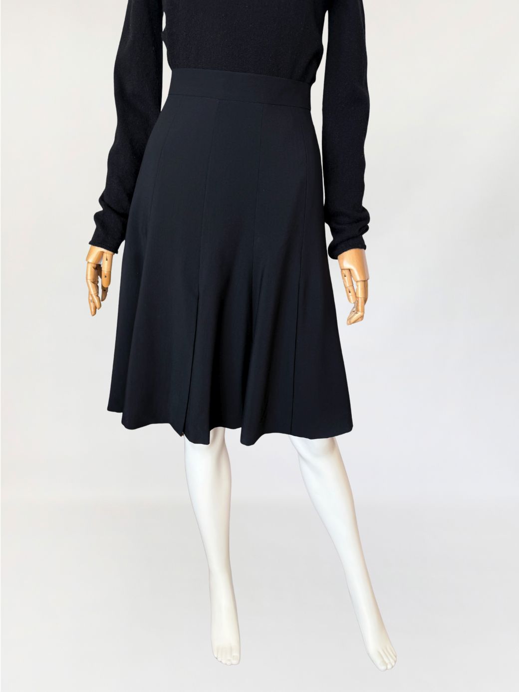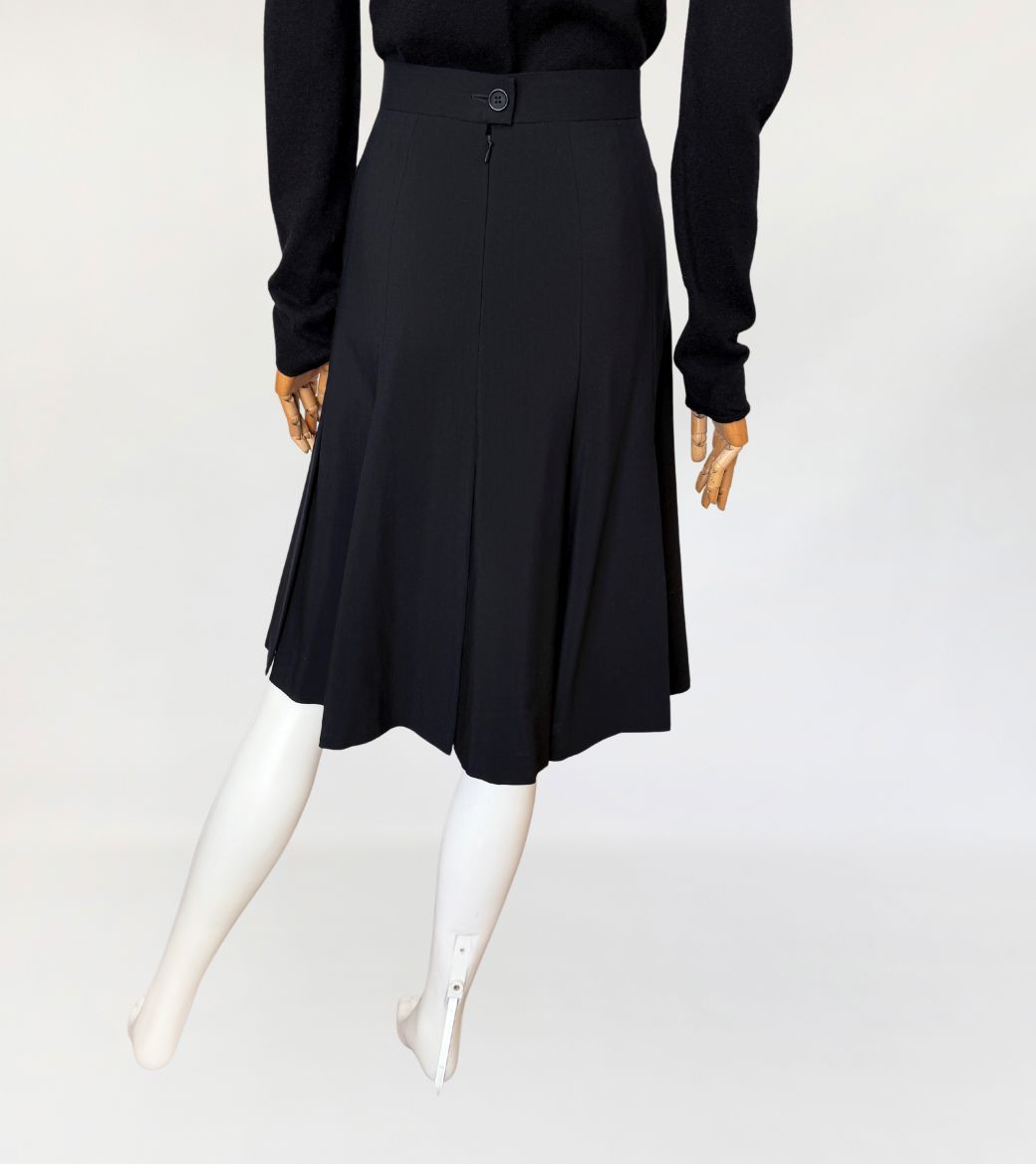 Spódnica vintage marki Escada wykonana z lekkiej tkaniny wełnianej w głębokim czarnym odcieniu. Fason o długości midi, z wysokim stanem i dopasowaną linią talii, płynnie rozszerzający się ku dołowi. Konstrukcja oparta na pionowych cięciach modelujących, przechodzących w miękko układające się kliny nadające formie rozłożenie objętości. Talia wykończona gładkim paskiem, zapinana na guzik oraz kryty zamek.