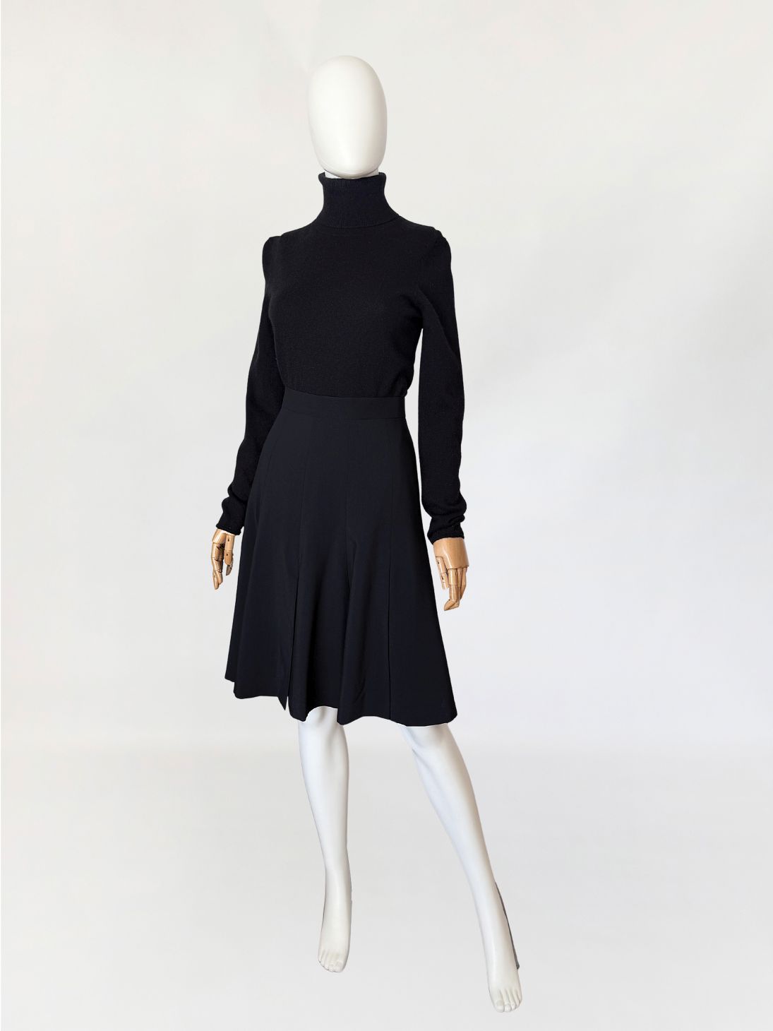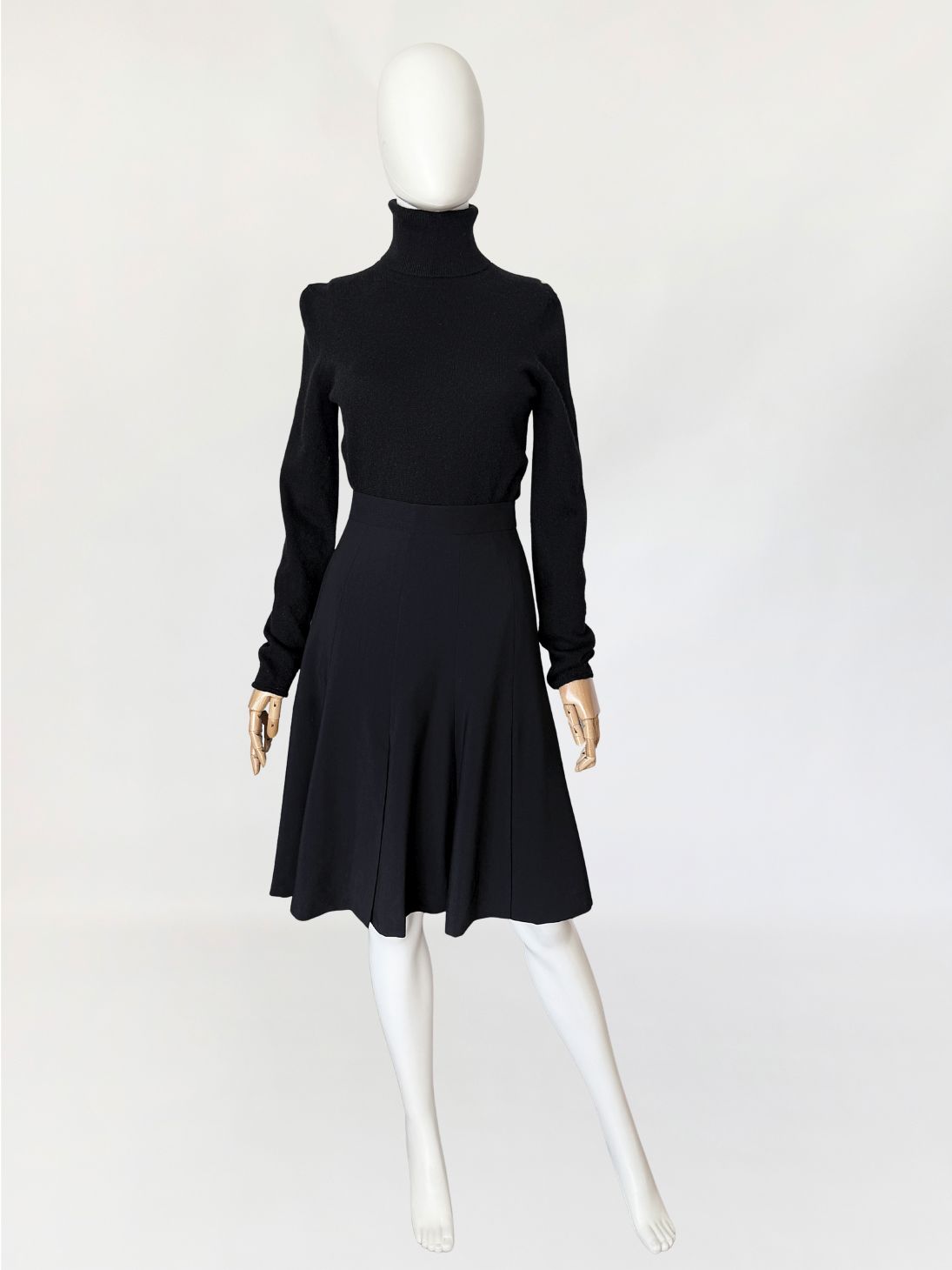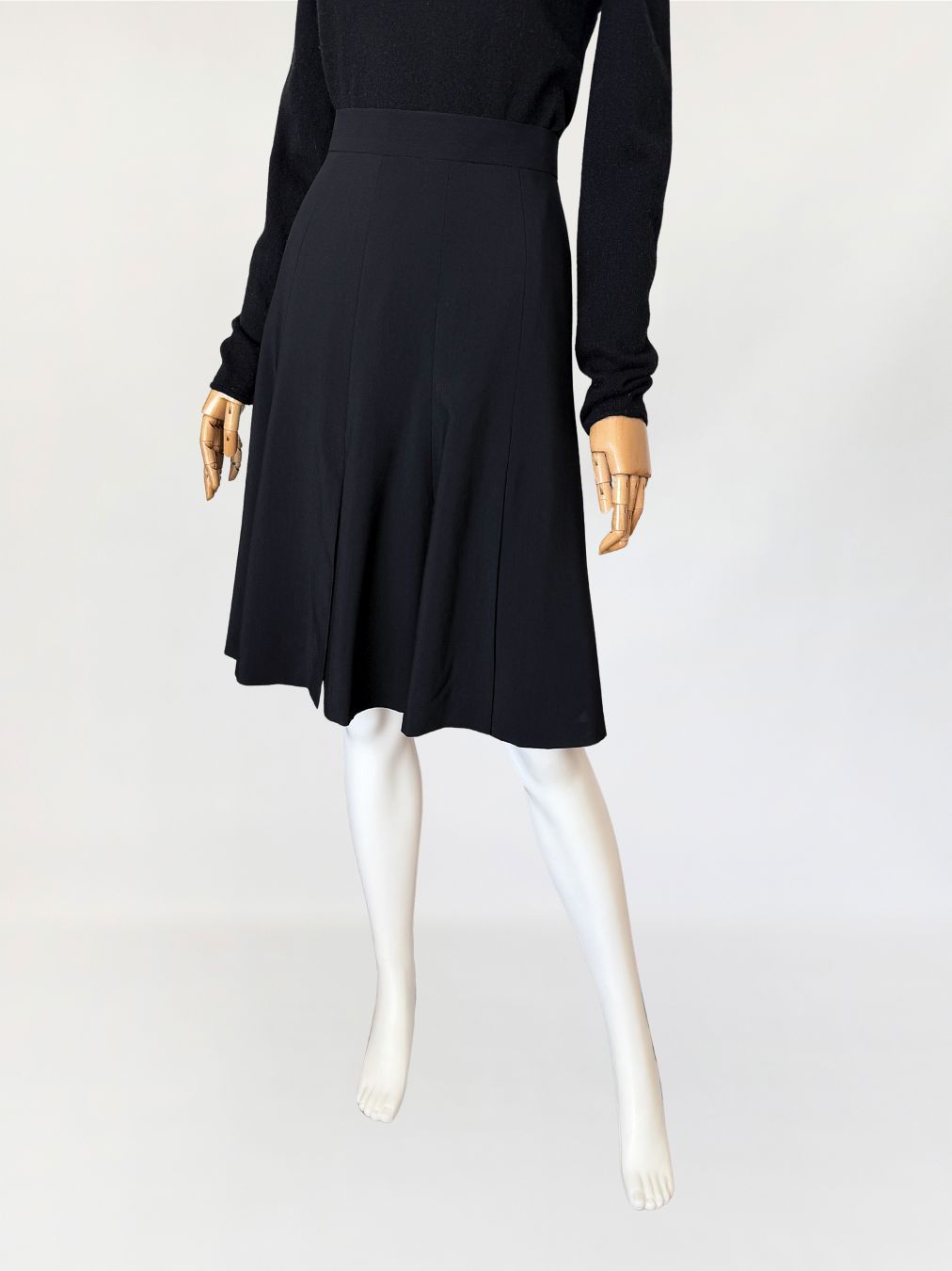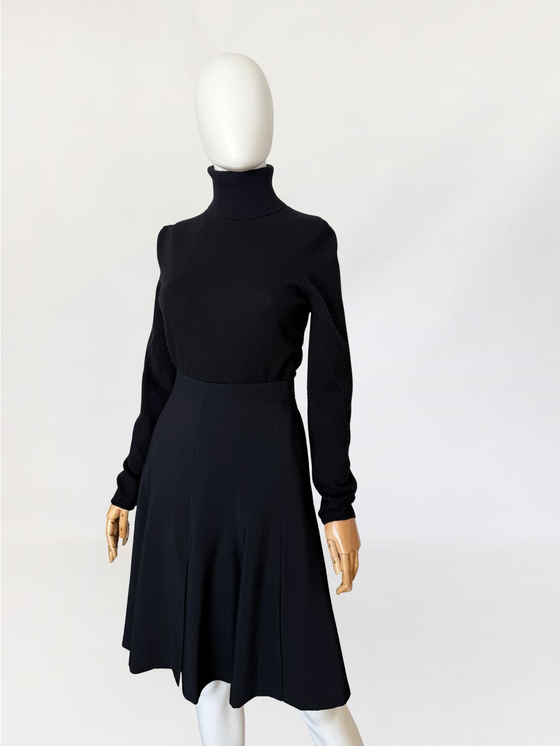 Spódnica vintage marki Escada wykonana z lekkiej tkaniny wełnianej w głębokim czarnym odcieniu. Fason o długości midi, z wysokim stanem i dopasowaną linią talii, płynnie rozszerzający się ku dołowi. Konstrukcja oparta na pionowych cięciach modelujących, przechodzących w miękko układające się kliny nadające formie rozłożenie objętości. Talia wykończona gładkim paskiem, zapinana na guzik oraz kryty zamek.