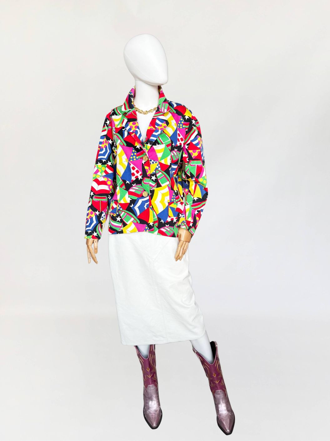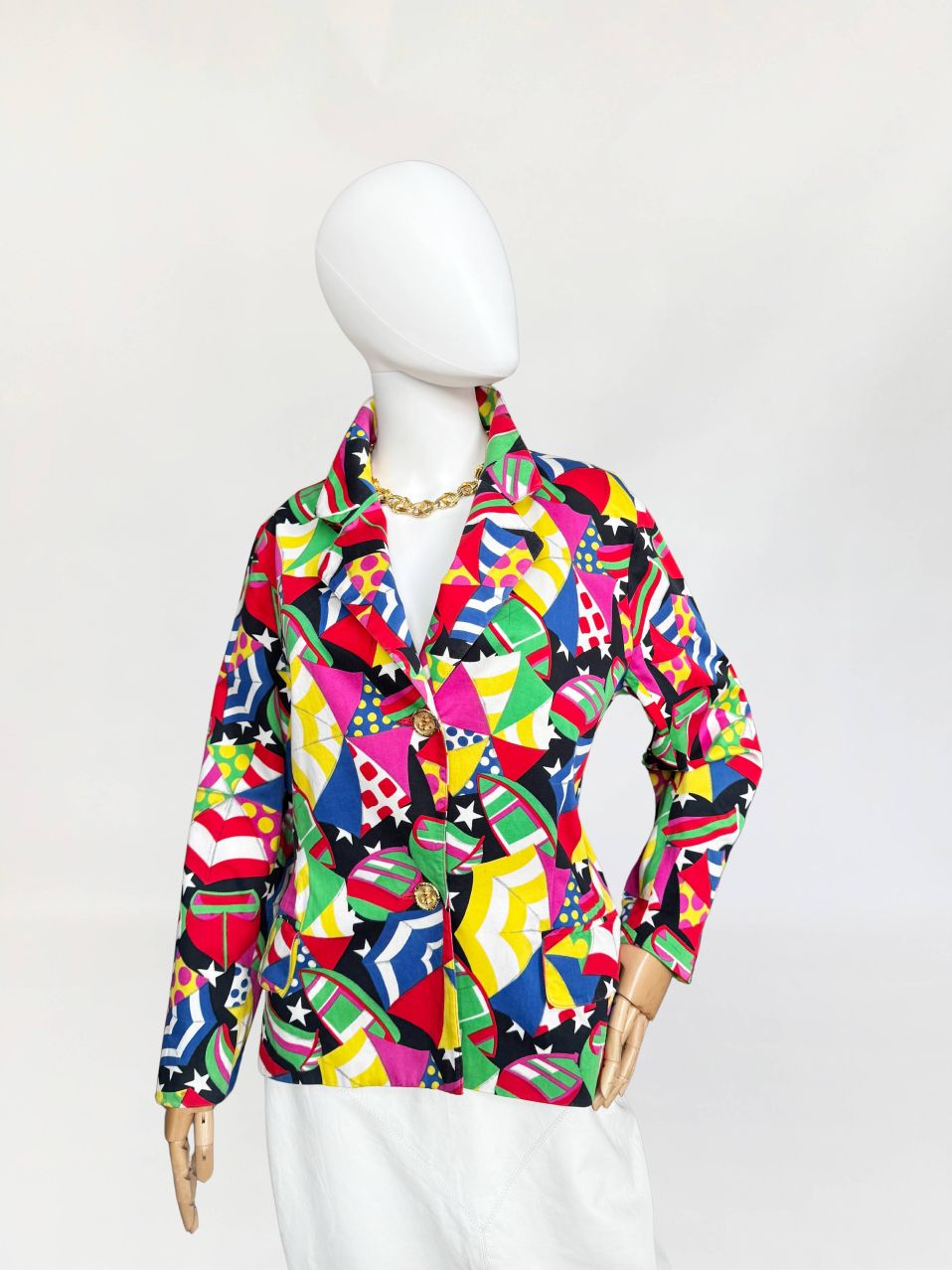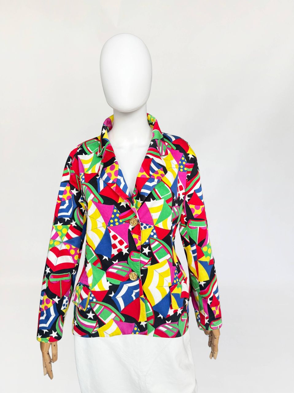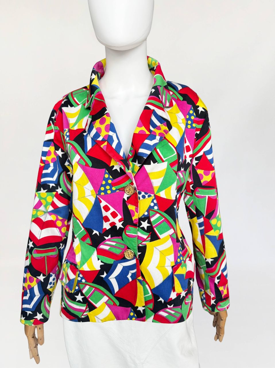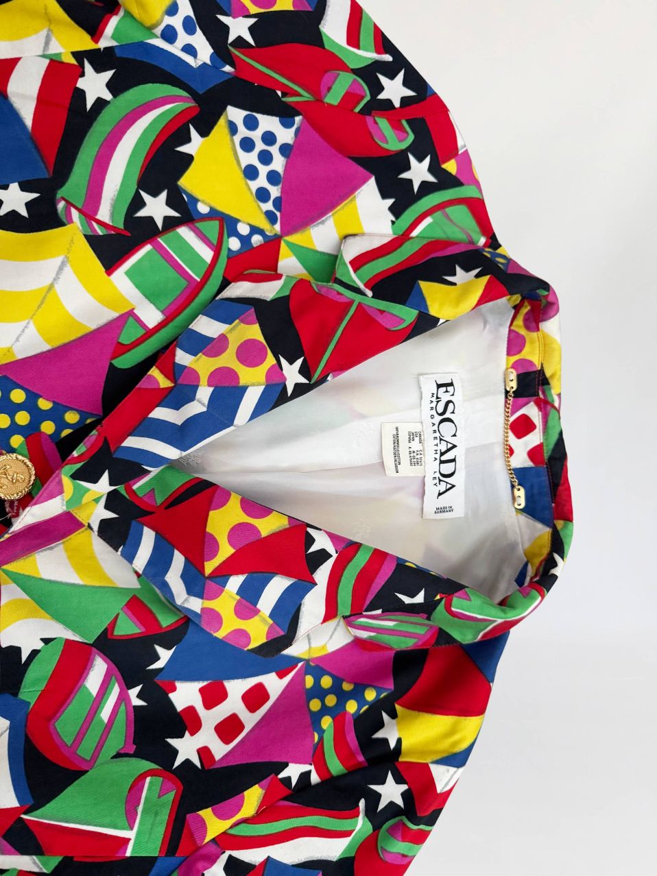 Multikolorowa marynara vintage z lat 90-tych marki Escada. Uszyta z bawełnianej tkaniny o wzorzystym, szalonym deseniu. Jednorzędowy klasyczny fason. Zapinana na złote grawerowane guziki. W dolnej części kieszenie z klapami. Od wewnątrz na logowanej podszewce.