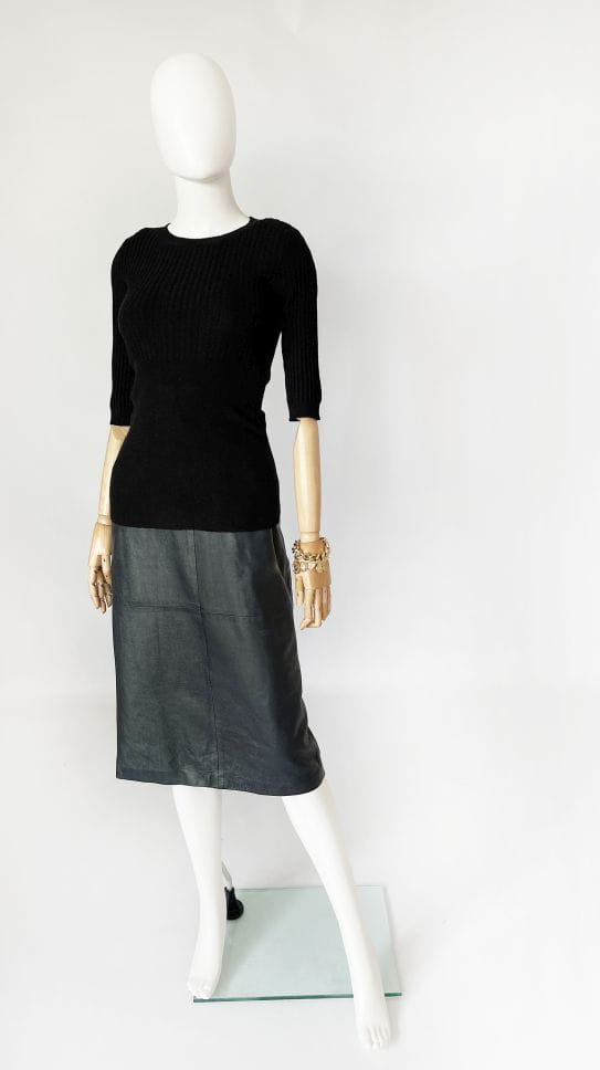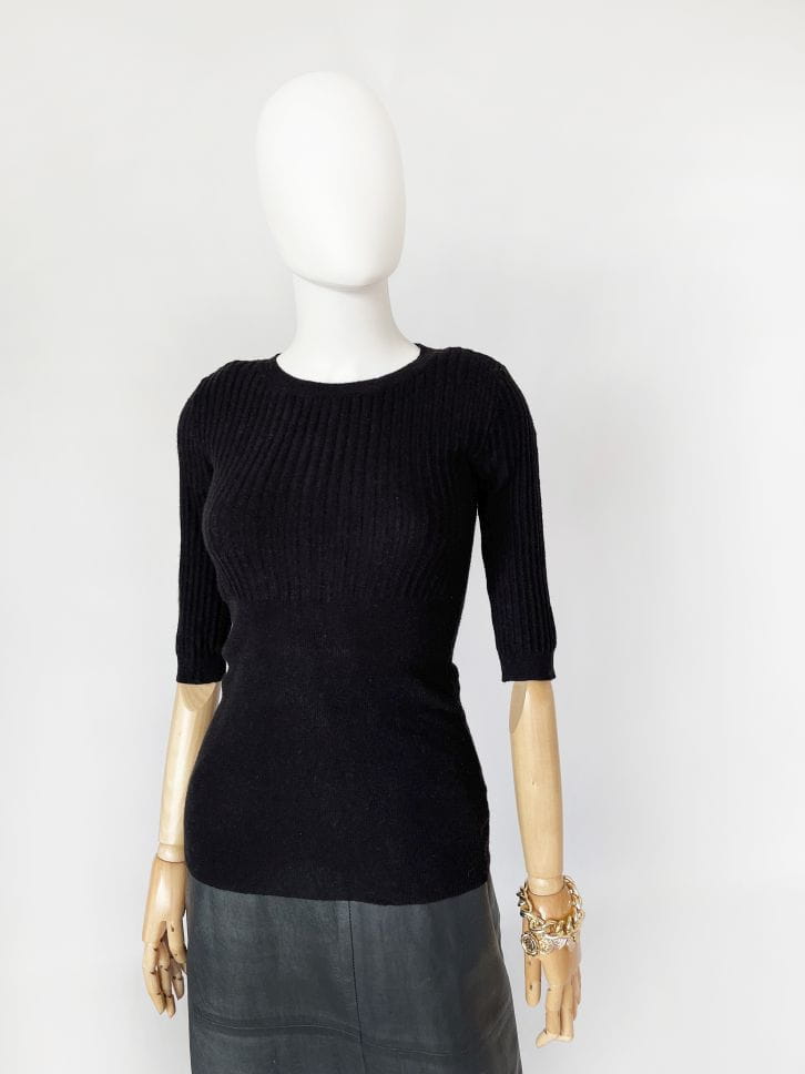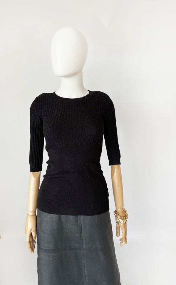 Czarna bluzka Eva Minge wykonana z elastycznej dzianiny. Dopasowany fason z prążkowaną górą i wysokim ściągaczem u dołu. Rękawy 3/4.