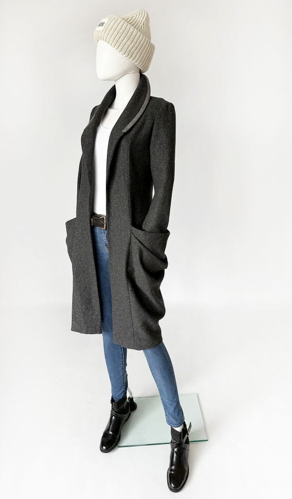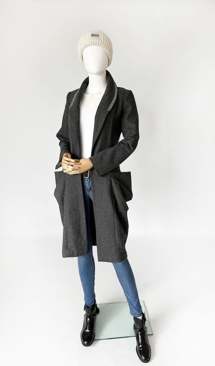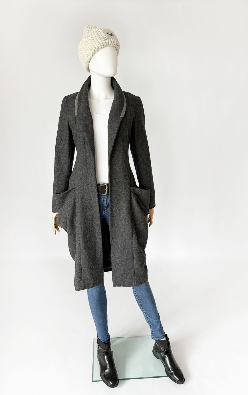 Oryginalny wiosenny płaszcz Ferré (linia własna należąca do koncernu Gianfranco Ferré) wykonany w całości z wełny. Fason open front z niedużym kołnierzem i otwartymi połami. Na wysokości bioder, po bokach kieszenie w wersji XXL, które stanowią także element dekoracyjny. Całość w stonowanym szarym kolorze, z jasnoszarą lamówką na kołnierzu. Wewnątrz na podszewce. Doskonały na nadchodzącą wiosnę.