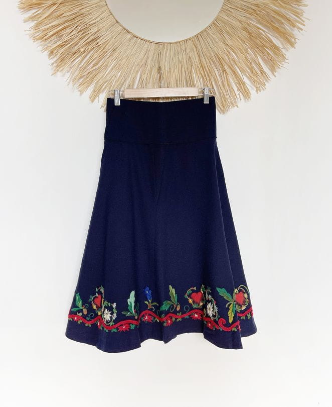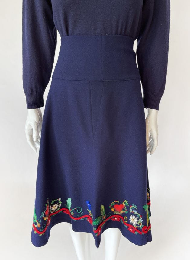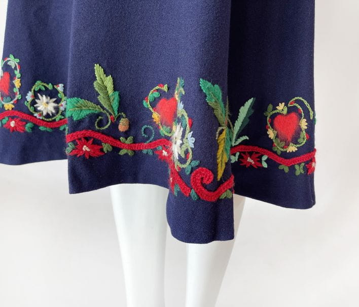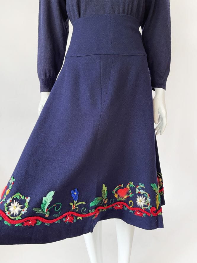 Przepiękna spódnica vintage w folkowym stylu. Model z lat 40-tych, lub 70-tych stylizowana na 40-ste. Zasuwana na zamek (zachował się oryginalny, metalowy), oraz przepinana na haftki. Cały dół wyszywany efektownymi haftowanymi aplikacjami z wełny i angory.
