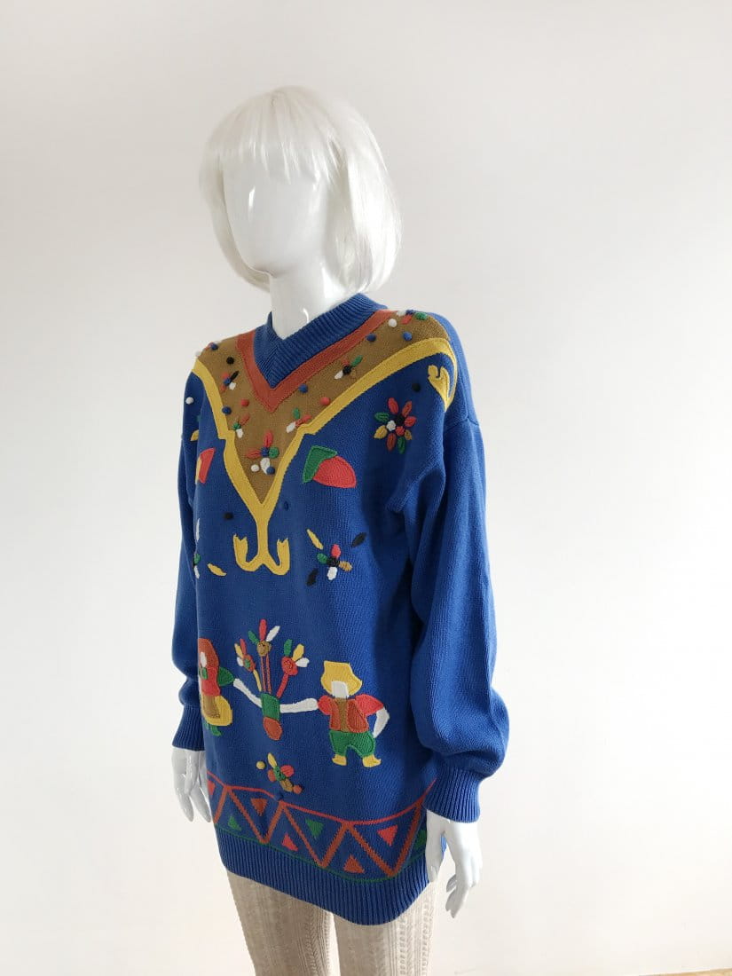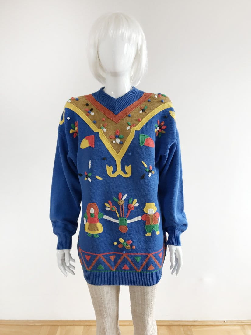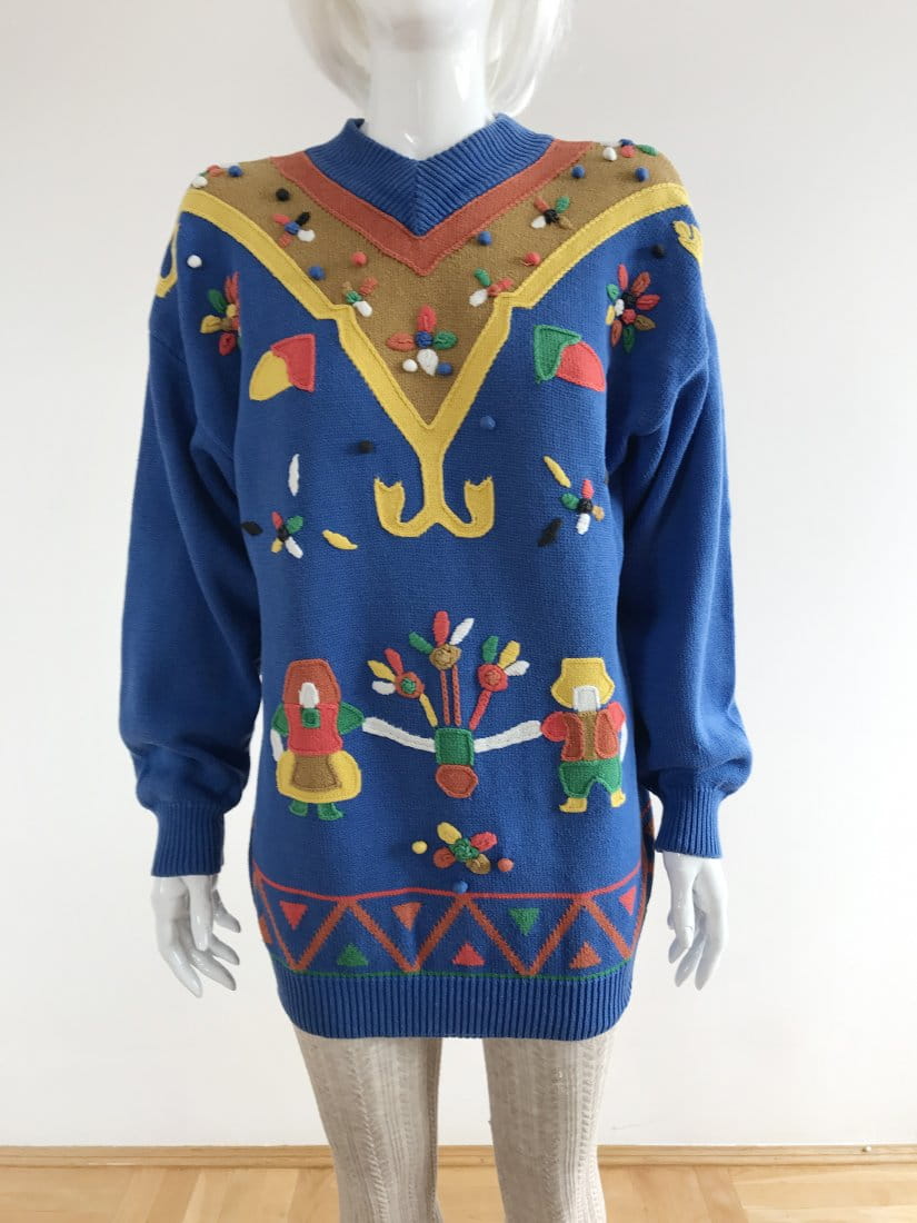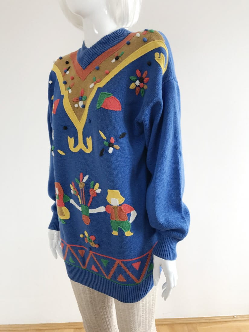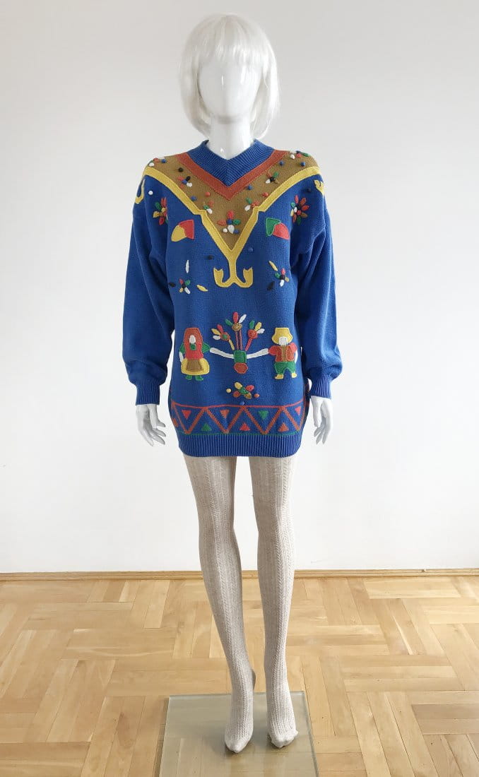 Kapitalny sweter vintage w haftowane folkowe wzory. Wykonany z elastycznej dzianiny. Długi krój z płytkim dekoltem i długimi rękawami. Tył gładki bez aplikacji.