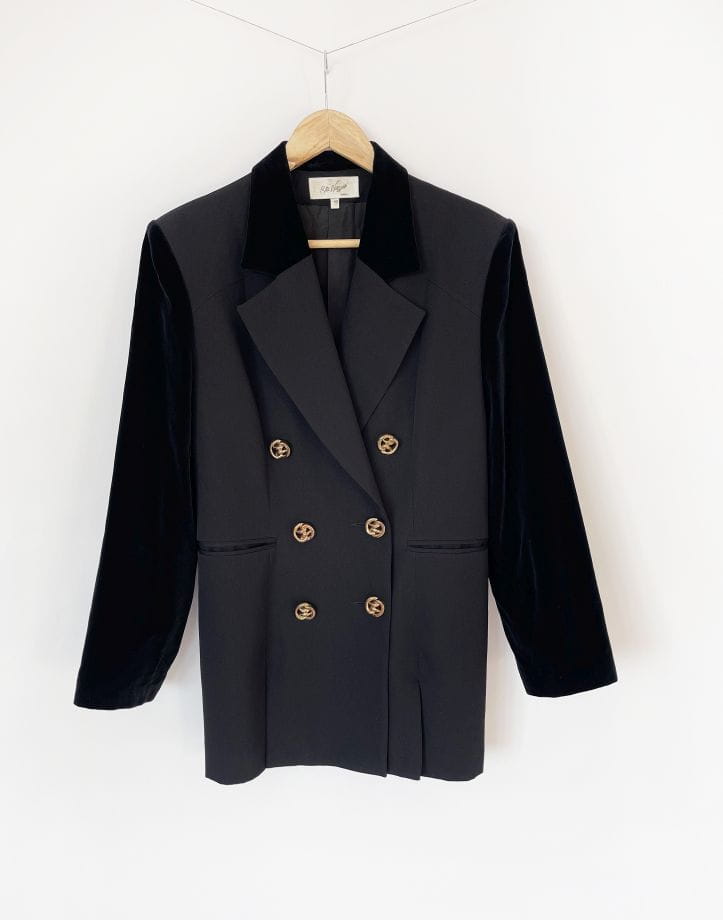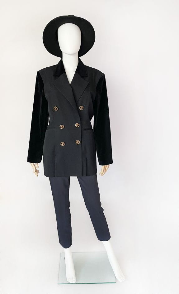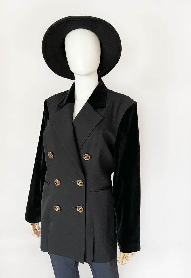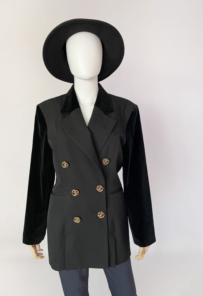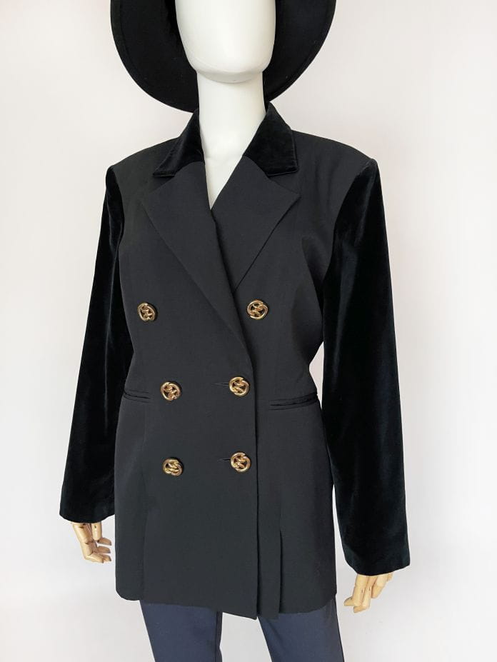 Przepiękna marynarka vintage z lat 80-tych marki Rita Nazzari Paris. Wykonana z wysokogatunkowej wełny, z aksamitnym kołnierzem i rękawami. Dłuższy, lekko taliowany fason. Zapinana dwurzędowo na duże guziki, w klimacie klipsów modnych w dekadzie 80's. U dołu krótkie rozporki. Doskonale skrojona, stylowa rzecz na lata.