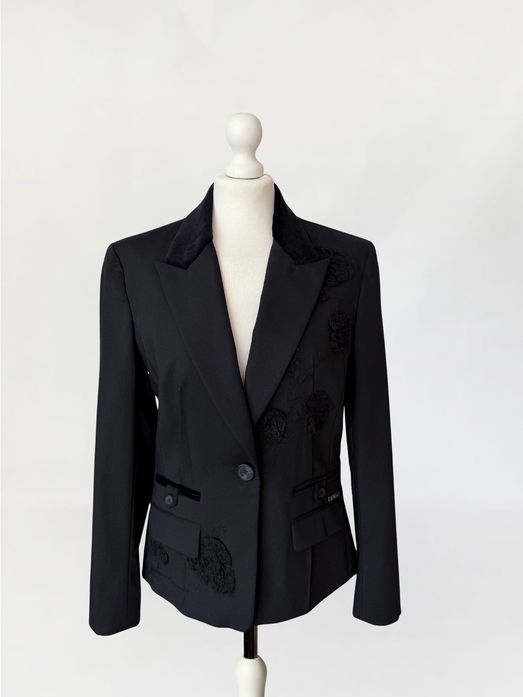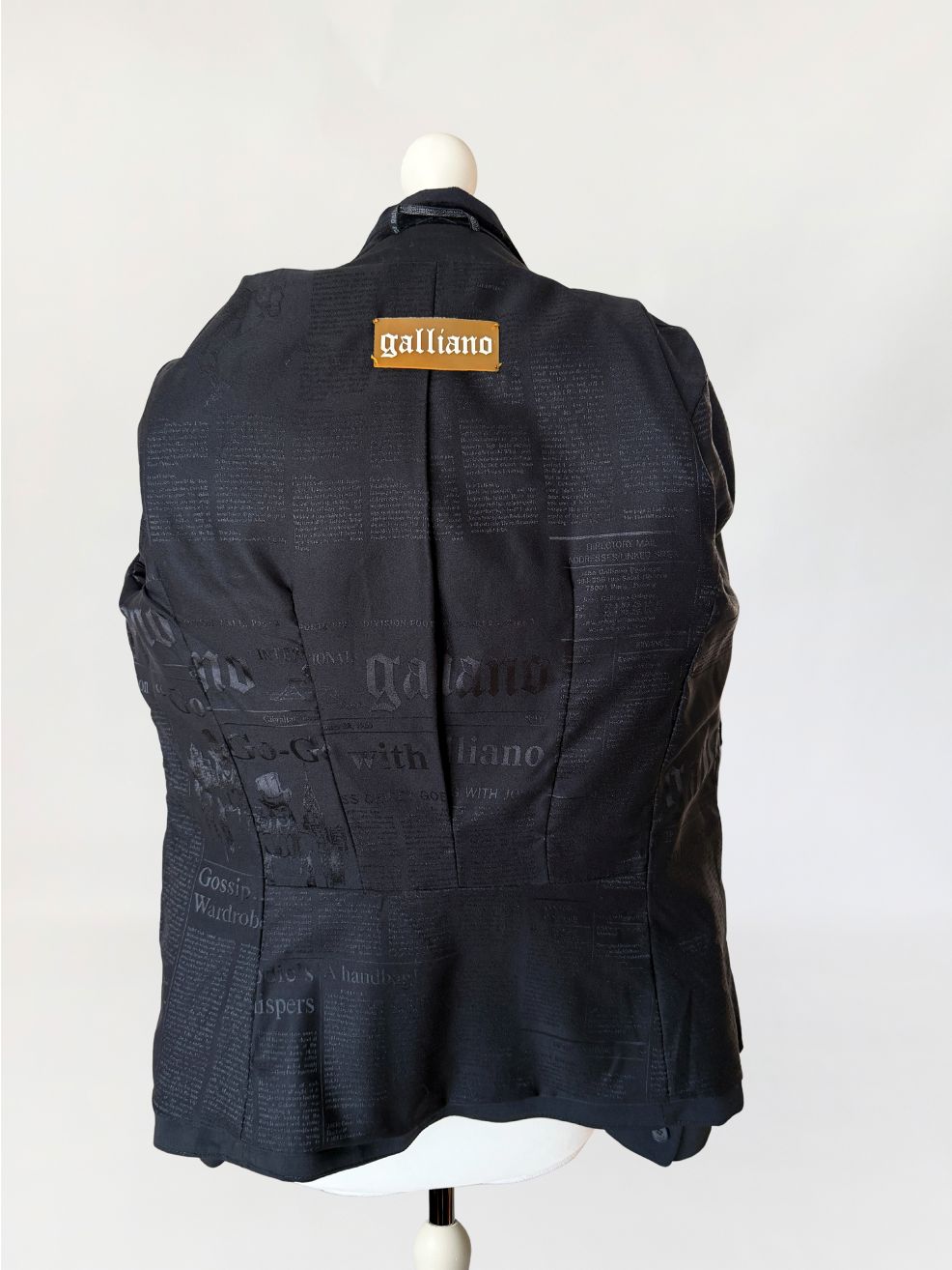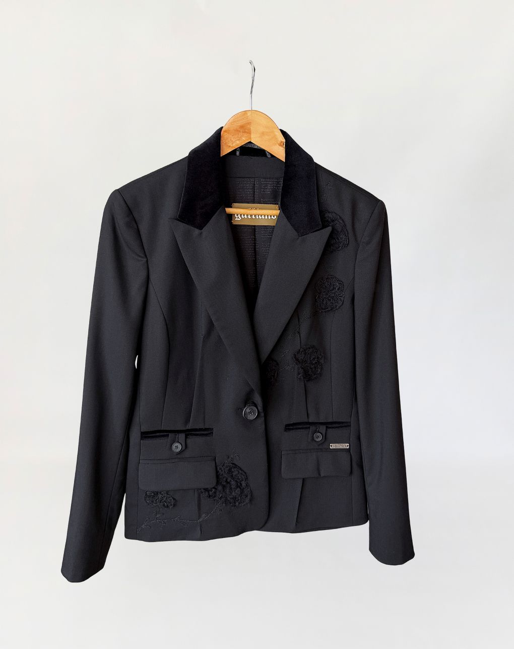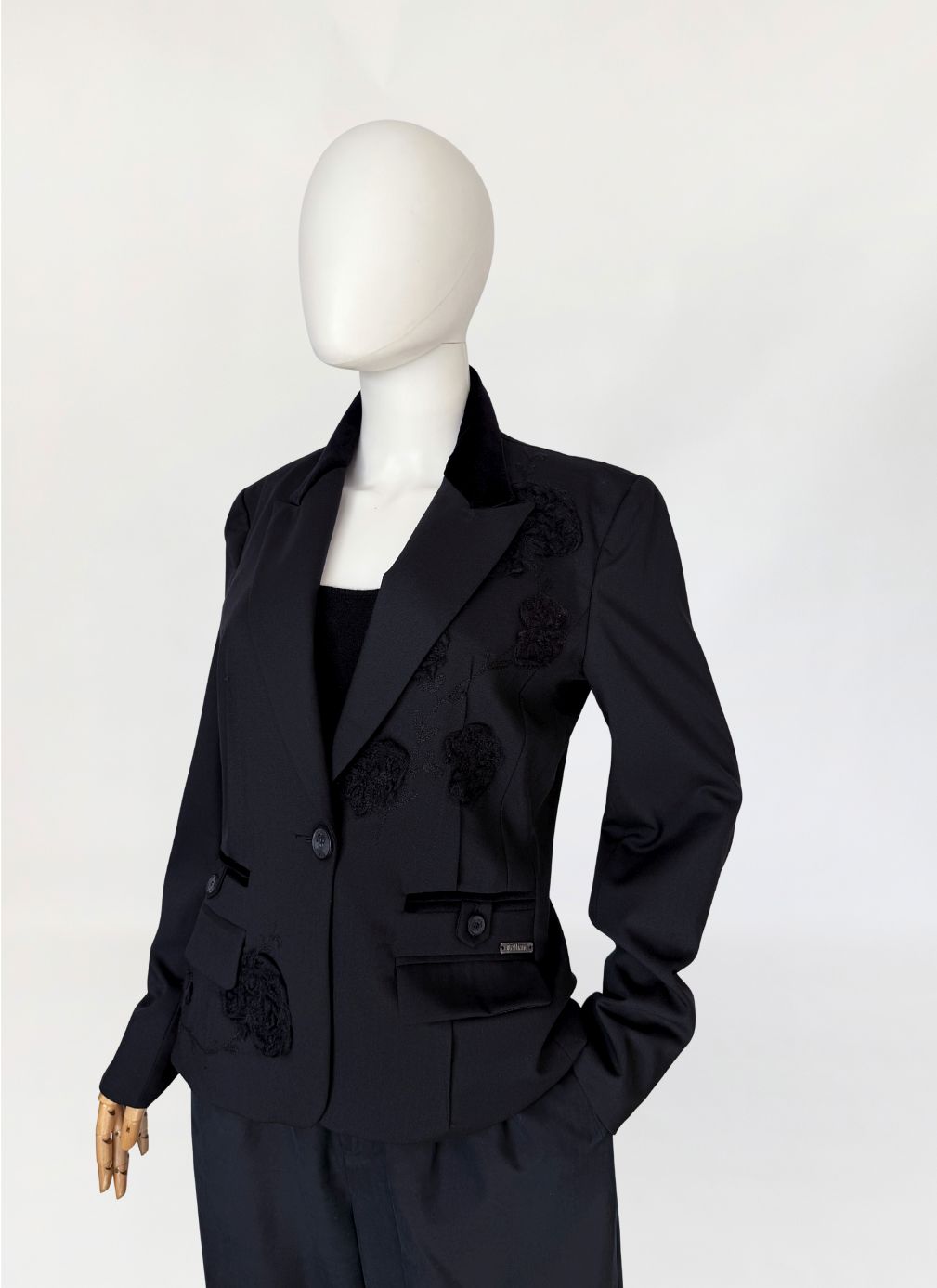 Marynarka vintage Galliano wykonana z tkaniny w kolorze czerni, o dopracowanej konstrukcji modelującej sylwetkę poprzez pionowe cięcia oraz wyraźnie zaznaczoną talię. Zapięcie jednorzędowe na jeden logowany guzik. Kołnierz z szerokimi, wydłużonymi klapami wykończonymi kontrastową tkaniną o aksamitnym wykończeniu. Na przodzie rozmieszczone aplikacje haftowane w formie wypukłych, tonalnych motywów roślinnych. Dolna część przodu z dodatkowymi aplikacjami w tej samej technice. Kieszenie z patkami, wykończone wąską lamówką w kontrastowym materiale, z dekoracyjnymi logowanymi guzikami. Przy prawej kieszeni metalowa plakietka z oznaczeniem marki. Rękawy proste, zakończone mankietem z rozcięciem i guzikiem. Wnętrze wykończone podszewką z nadrukiem tekstowym charakterystycznym dla projektów Galliano, z centralnie umieszczoną metką. Rzadki, unikatowy model, z archiwalnych kolekcji Galliano, z początku lat 2000.