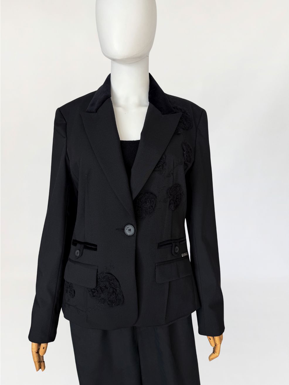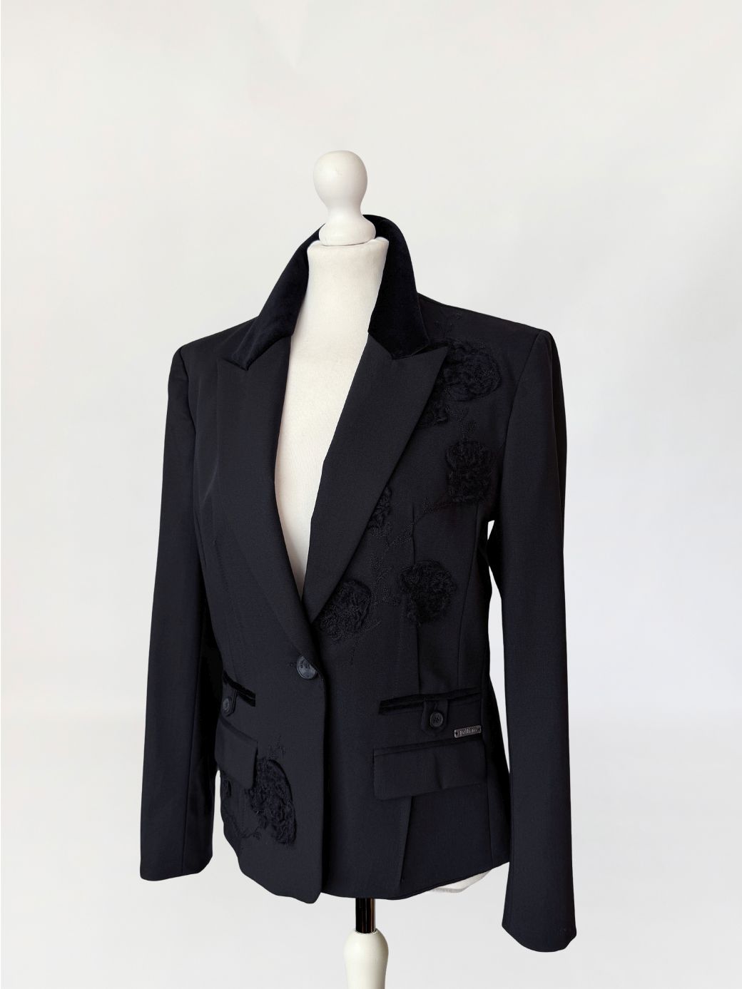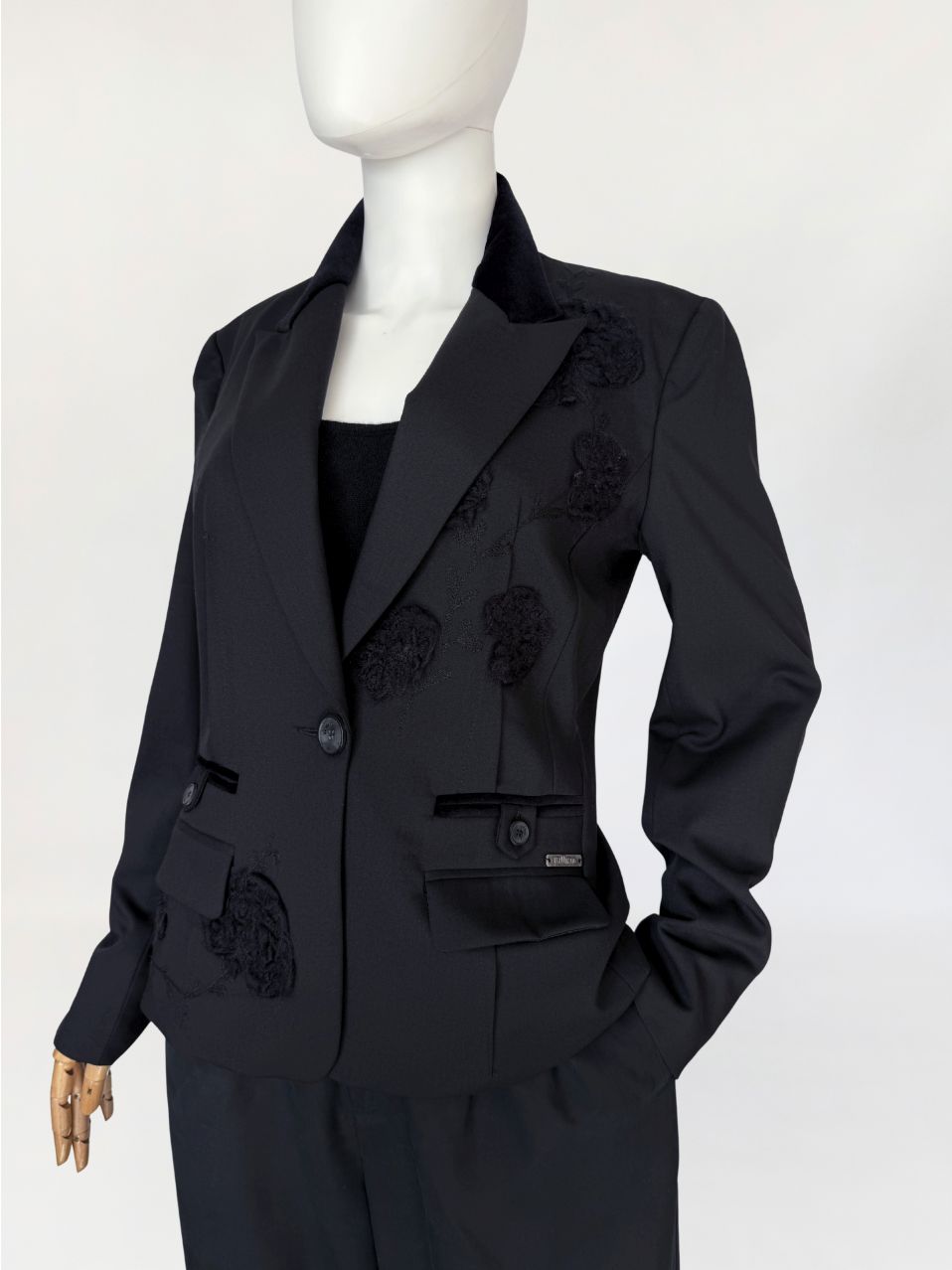Marynarka vintage Galliano wykonana z tkaniny w kolorze czerni, o dopracowanej konstrukcji modelującej sylwetkę poprzez pionowe cięcia oraz wyraźnie zaznaczoną talię. Zapięcie jednorzędowe na jeden logowany guzik. Kołnierz z szerokimi, wydłużonymi klapami wykończonymi kontrastową tkaniną o aksamitnym wykończeniu. Na przodzie rozmieszczone aplikacje haftowane w formie wypukłych, tonalnych motywów roślinnych. Dolna część przodu z dodatkowymi aplikacjami w tej samej technice. Kieszenie z patkami, wykończone wąską lamówką w kontrastowym materiale, z dekoracyjnymi logowanymi guzikami. Przy prawej kieszeni metalowa plakietka z oznaczeniem marki. Rękawy proste, zakończone mankietem z rozcięciem i guzikiem. Wnętrze wykończone podszewką z nadrukiem tekstowym charakterystycznym dla projektów Galliano, z centralnie umieszczoną metką. Rzadki, unikatowy model, z archiwalnych kolekcji Galliano, z początku lat 2000.