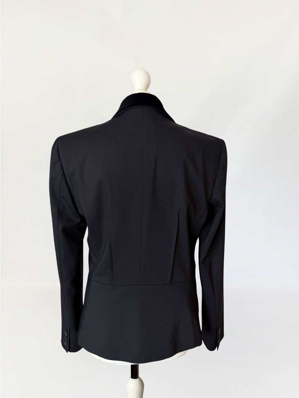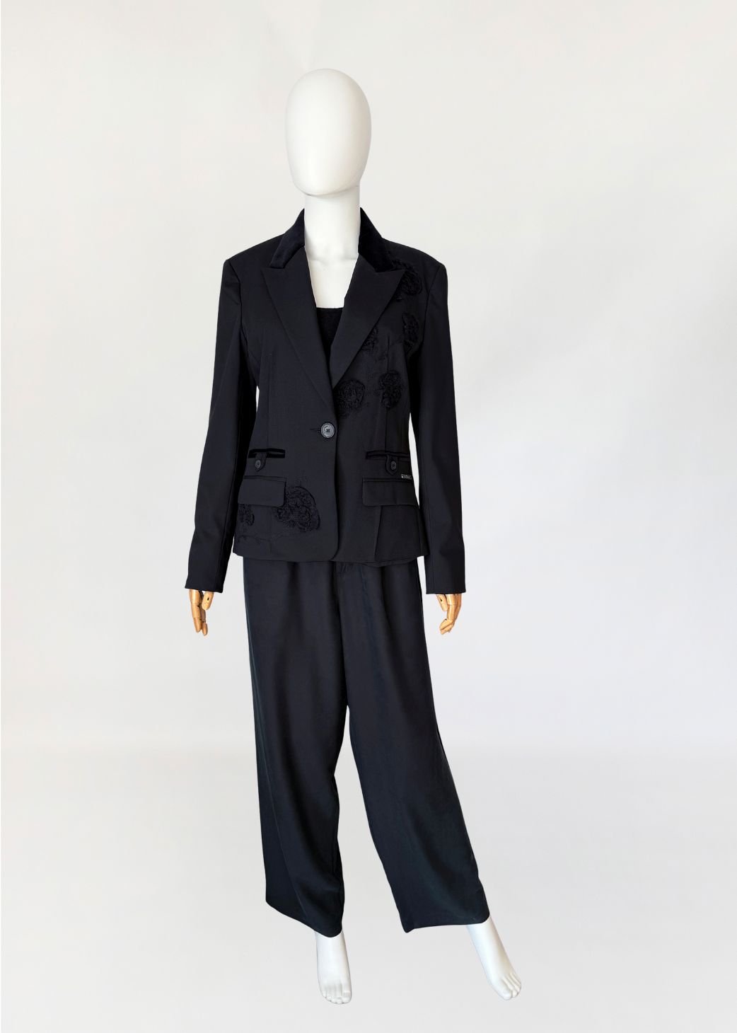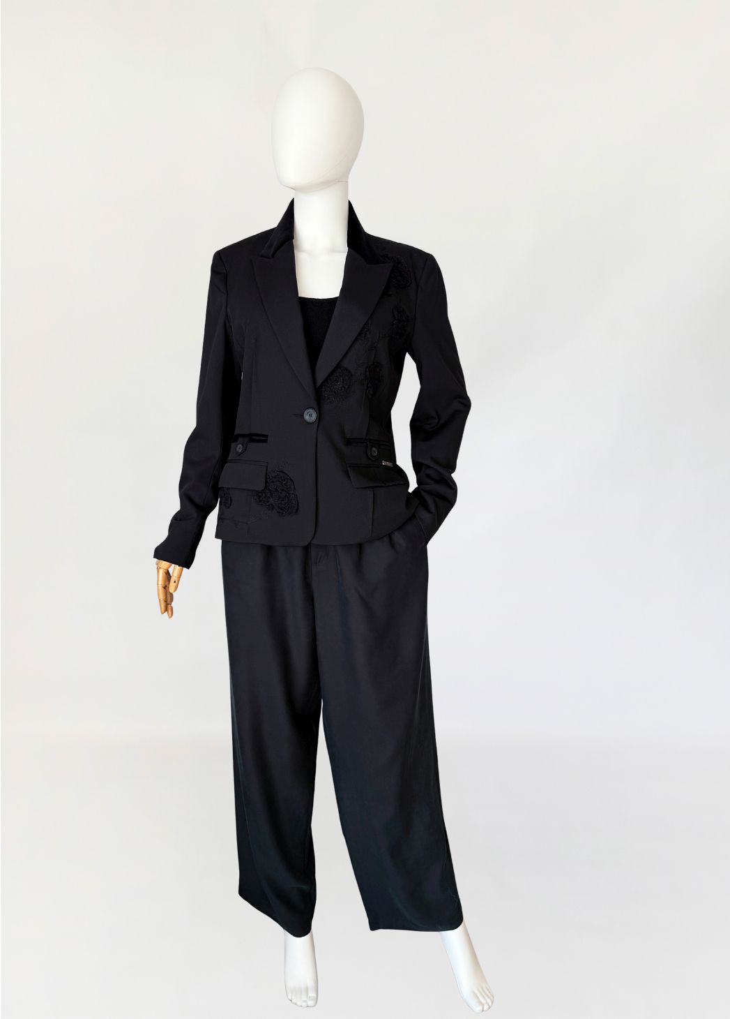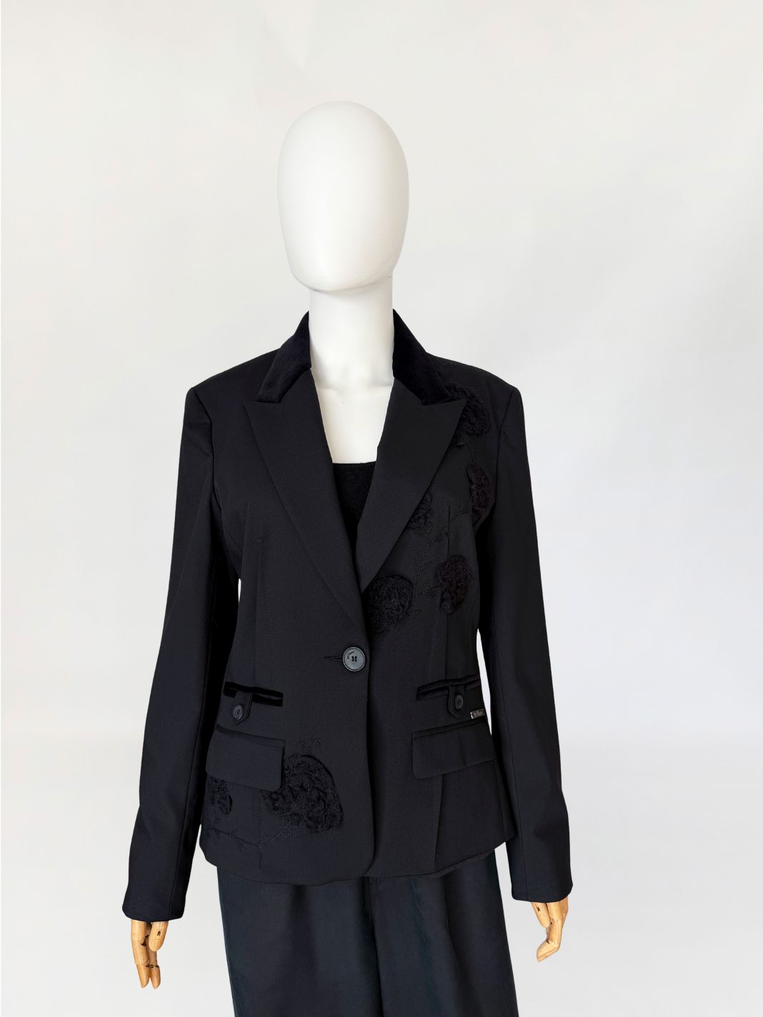 Marynarka vintage Galliano wykonana z tkaniny w kolorze czerni, o dopracowanej konstrukcji modelującej sylwetkę poprzez pionowe cięcia oraz wyraźnie zaznaczoną talię. Zapięcie jednorzędowe na jeden logowany guzik. Kołnierz z szerokimi, wydłużonymi klapami wykończonymi kontrastową tkaniną o aksamitnym wykończeniu. Na przodzie rozmieszczone aplikacje haftowane w formie wypukłych, tonalnych motywów roślinnych. Dolna część przodu z dodatkowymi aplikacjami w tej samej technice. Kieszenie z patkami, wykończone wąską lamówką w kontrastowym materiale, z dekoracyjnymi logowanymi guzikami. Przy prawej kieszeni metalowa plakietka z oznaczeniem marki. Rękawy proste, zakończone mankietem z rozcięciem i guzikiem. Wnętrze wykończone podszewką z nadrukiem tekstowym charakterystycznym dla projektów Galliano, z centralnie umieszczoną metką. Rzadki, unikatowy model, z archiwalnych kolekcji Galliano, z początku lat 2000.