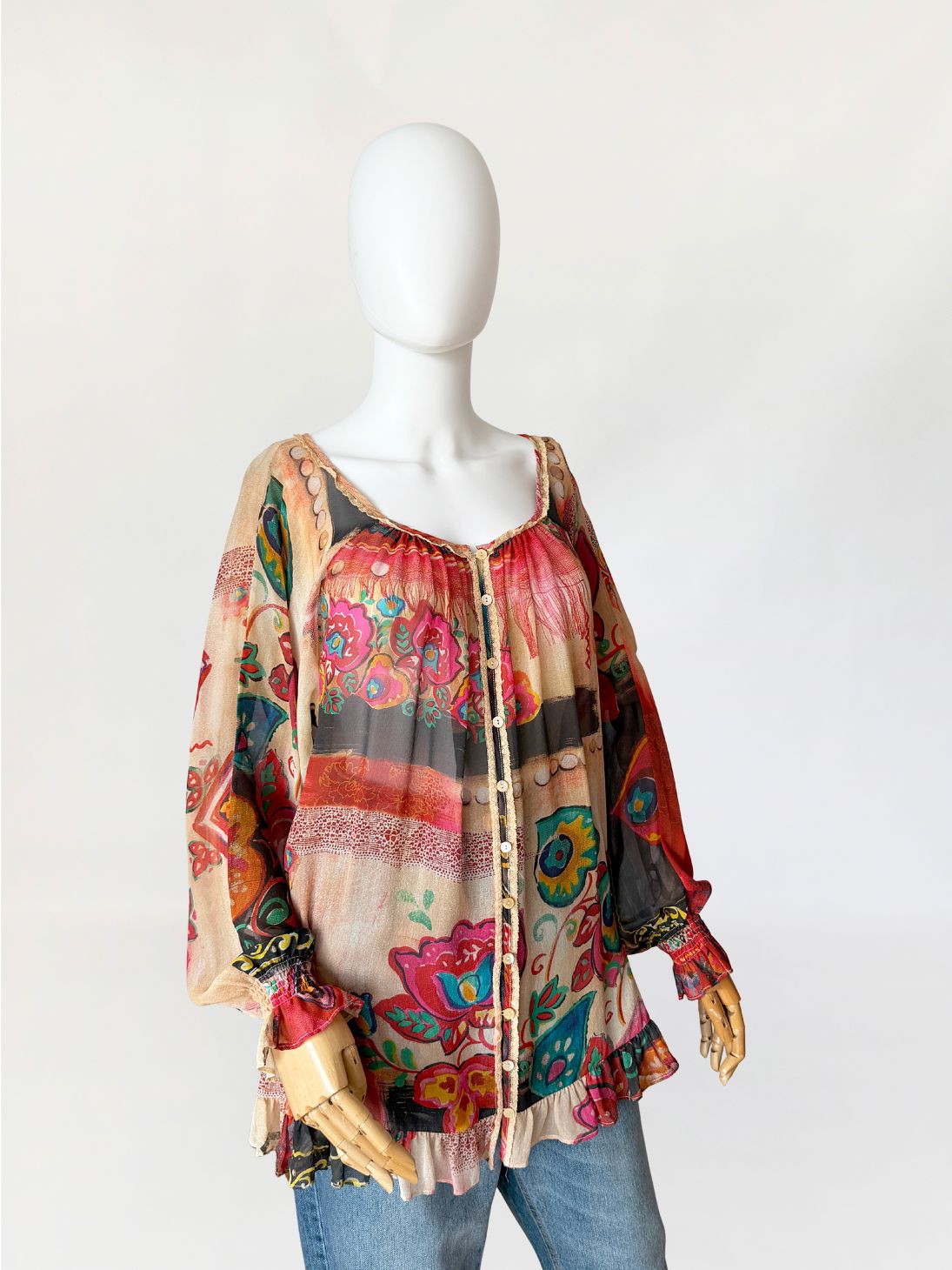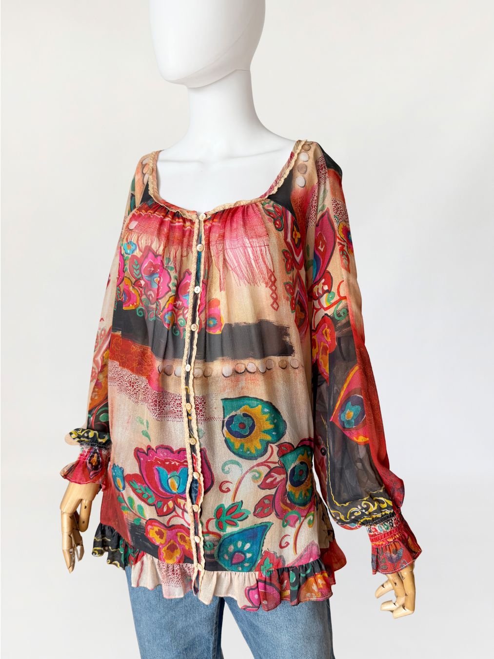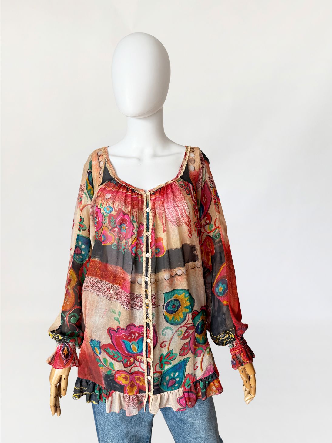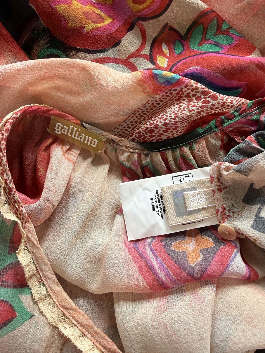 Oryginalna bluzka od Galliano wykonana w całości z naturalnego jedwabnego szyfonu o półtransparentnej strukturze, z wielobarwnym nadrukiem w odcieniach czerwieni, beżu, zieleni i czerni. Fason swobodny, dłuższy z miękkim układaniem się tkaniny. W dolnej części lekko zwężany za sprawą gumek po bokach. Szeroki dekolt z marszczeniem przy krawędzi oraz wykończeniem delikatną koronkową lamówką. Na całej długości przodu zapinana na rząd drobnych logowanych guzików. Rękawy długie, szerokie, zakończone elastycznym marszczeniem i falbaną. Dół wykończony falbaną z lekkim marszczeniem.