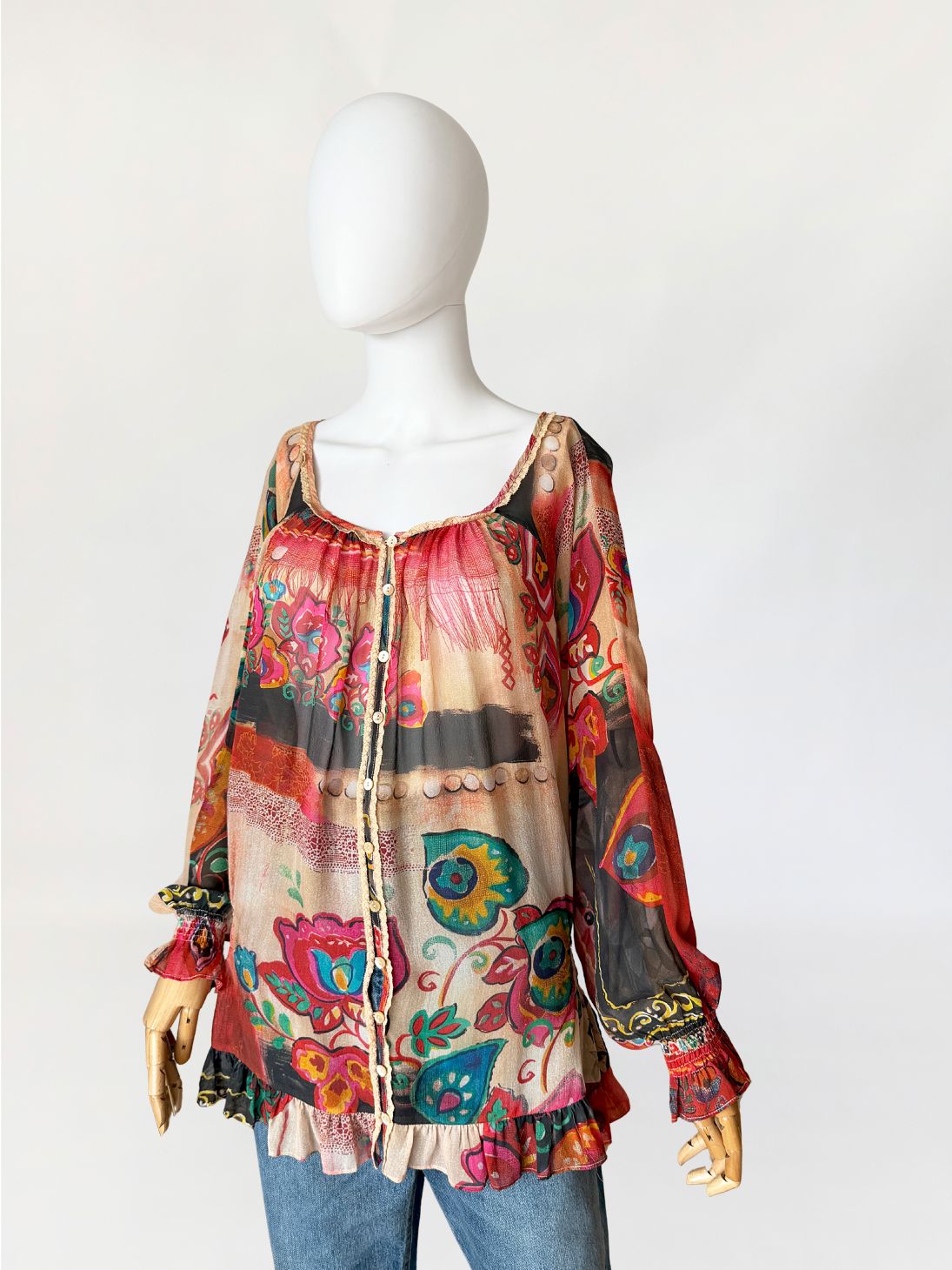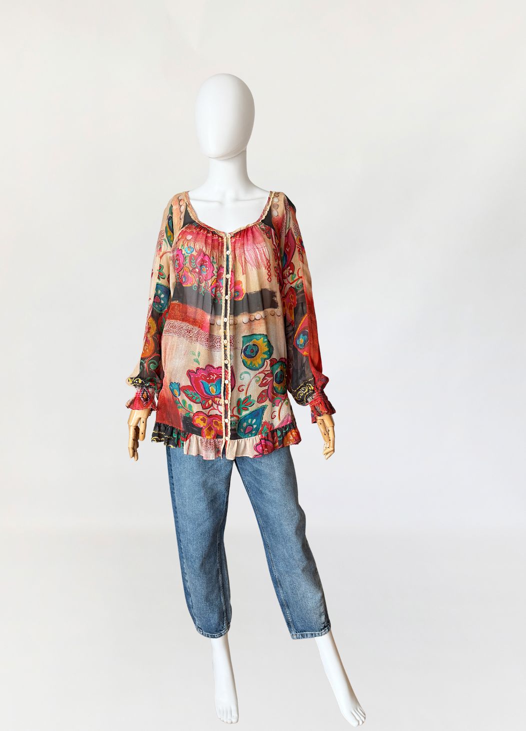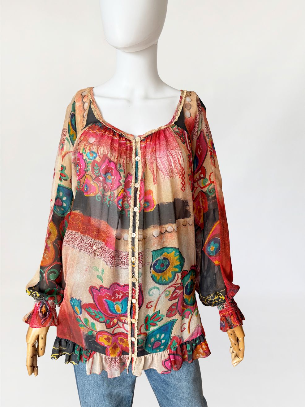 Oryginalna bluzka od Galliano wykonana w całości z naturalnego jedwabnego szyfonu o półtransparentnej strukturze, z wielobarwnym nadrukiem w odcieniach czerwieni, beżu, zieleni i czerni. Fason swobodny, dłuższy z miękkim układaniem się tkaniny. W dolnej części lekko zwężany za sprawą gumek po bokach. Szeroki dekolt z marszczeniem przy krawędzi oraz wykończeniem delikatną koronkową lamówką. Na całej długości przodu zapinana na rząd drobnych logowanych guzików. Rękawy długie, szerokie, zakończone elastycznym marszczeniem i falbaną. Dół wykończony falbaną z lekkim marszczeniem.