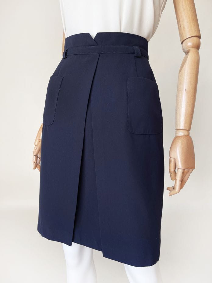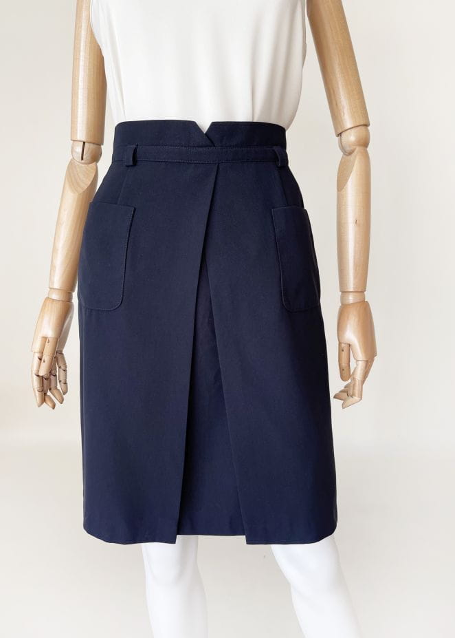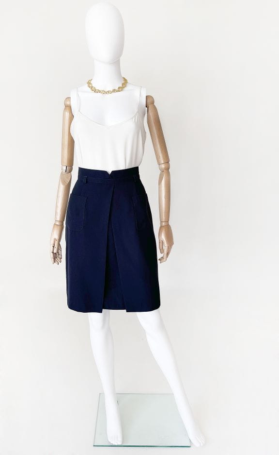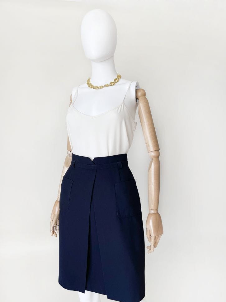 Spódnica vintage renomowanej marki Gardeur. Ołówkowy fason z wyższym stanem, z przodu kopertowe zakładki i duże kieszenie. W pasie wyhaftowany inicjał marki. Model z podszewką.