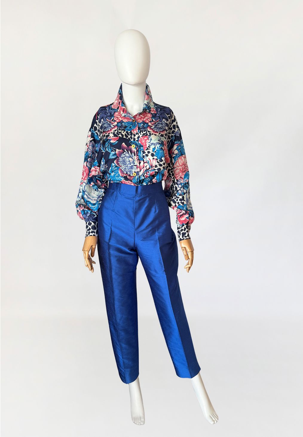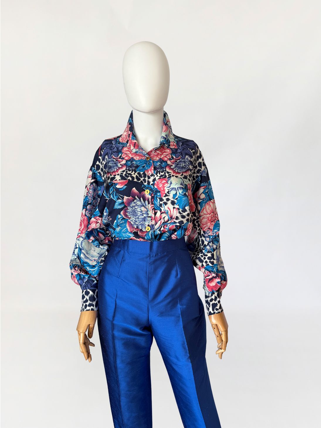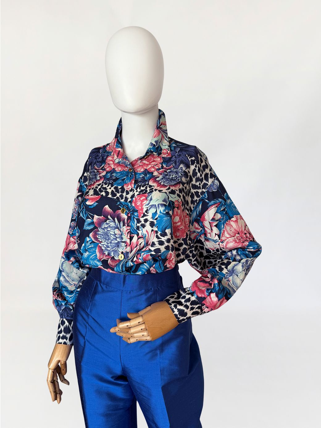 Koszula vintage luksusowej marki Genny. Wykonana w całości z jedwabiu o wielobarwnym nadruku łączącym rozbudowany motyw florystyczny z elementami zwierzęcego deseniu. Dominujące odcienie granatu, turkusu, czerwieni i różu, zestawione z partiami w kontrastowym, czarno-kremowym wzorze. Fason swobodny, wydłużony, z lekko opuszczoną linią ramion. Rękawy długie, o zwiększonej objętości, zakończone szerokimi mankietami zapinanymi na guziki.