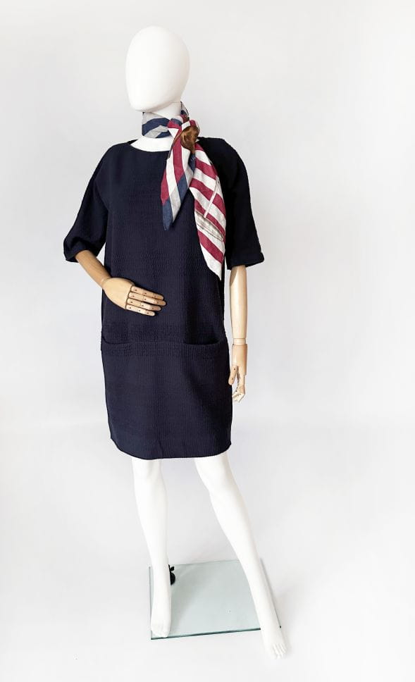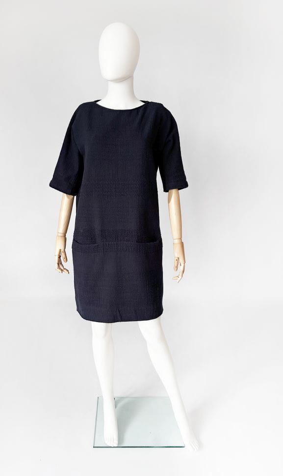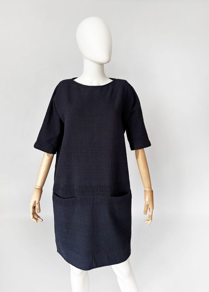 Casual'owa sukienka luksusowej francuskiej marki Gerard Darel. Wykonana z bawełnianej teksturowanej tkaniny w kolorze granatowym, z czarnymi wstawkami po bokach. Swobodny, oversize'owy fason z rękawami 3/4. W dolnej części niewielkie kieszenie.