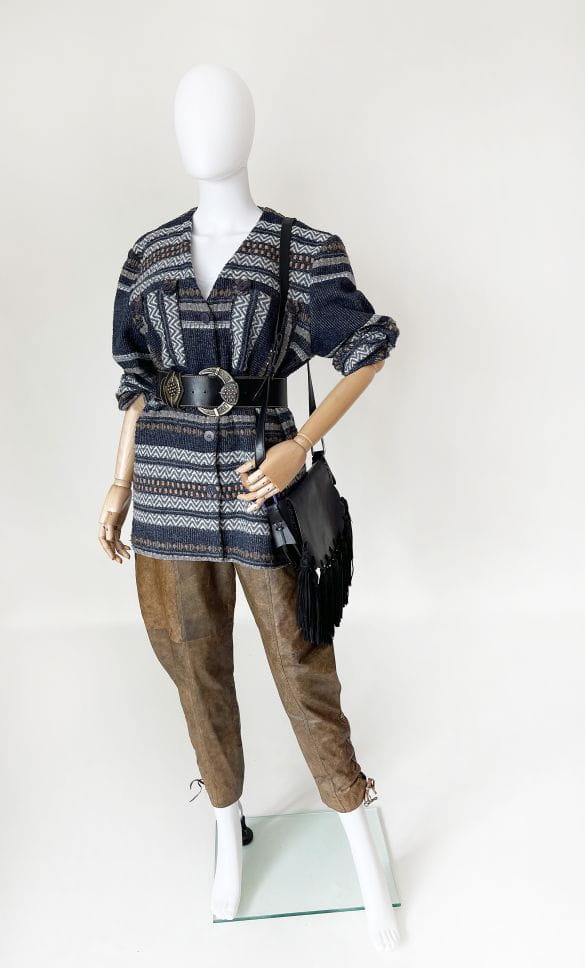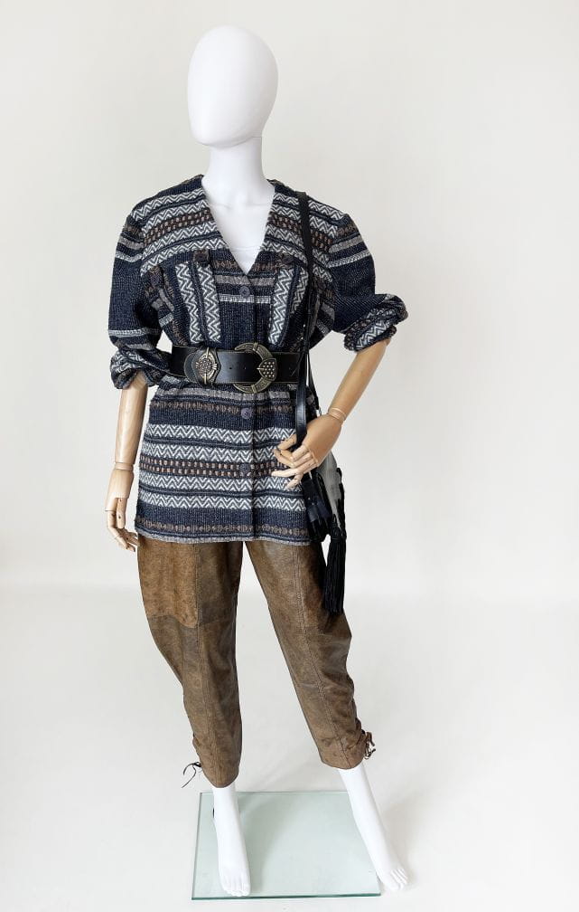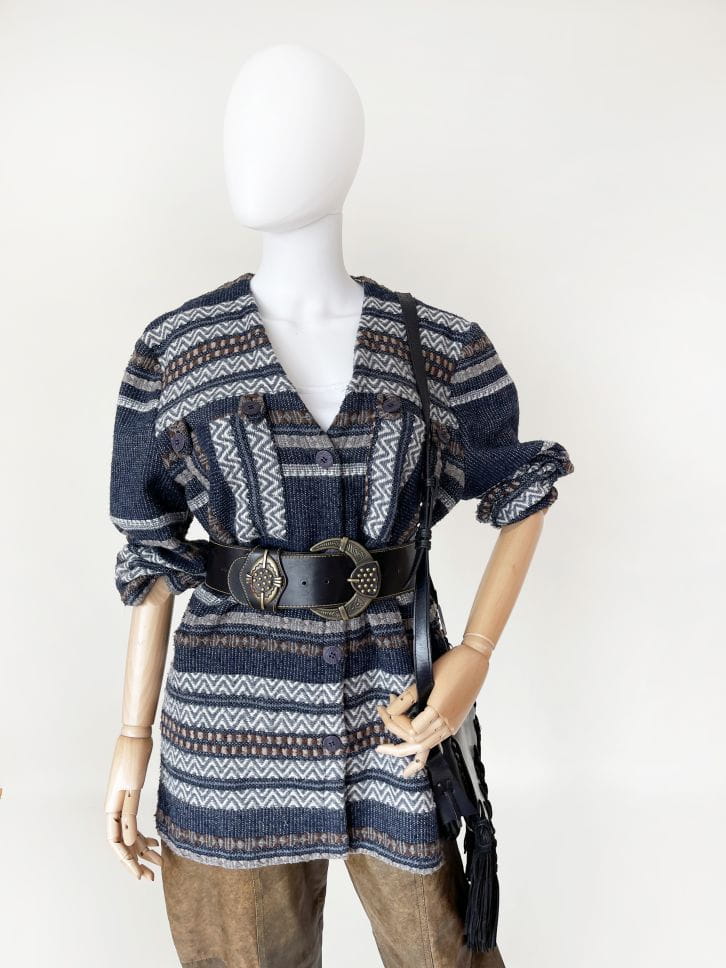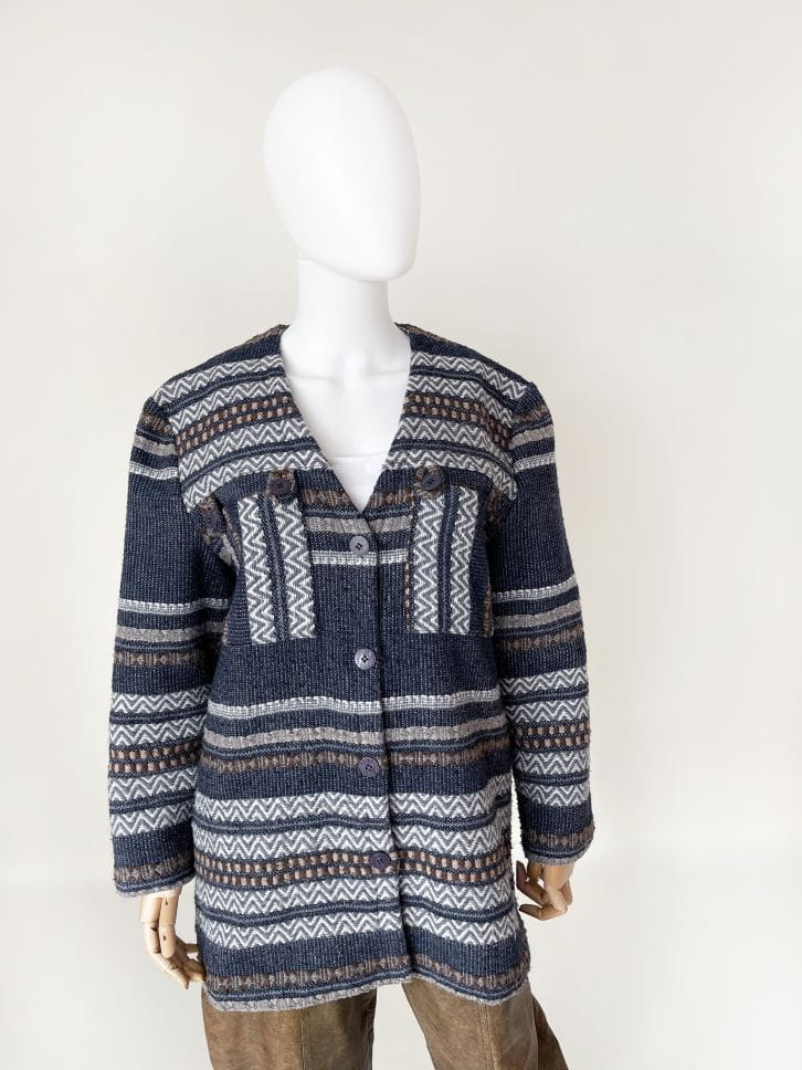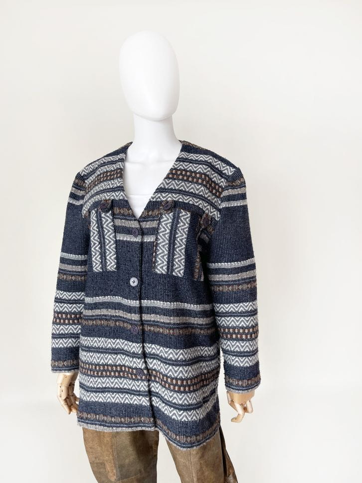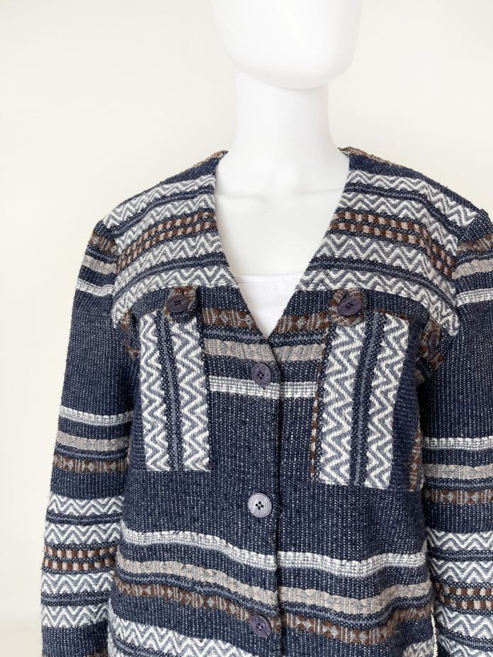 Gobelinowa kurtka w stylu etno, western. Dość lekka, wykonana z mieszanki akrylu i wełny. Prosty dłuższy fason z długimi rękawami. Mieszany deseń w stonowanych kolorach.