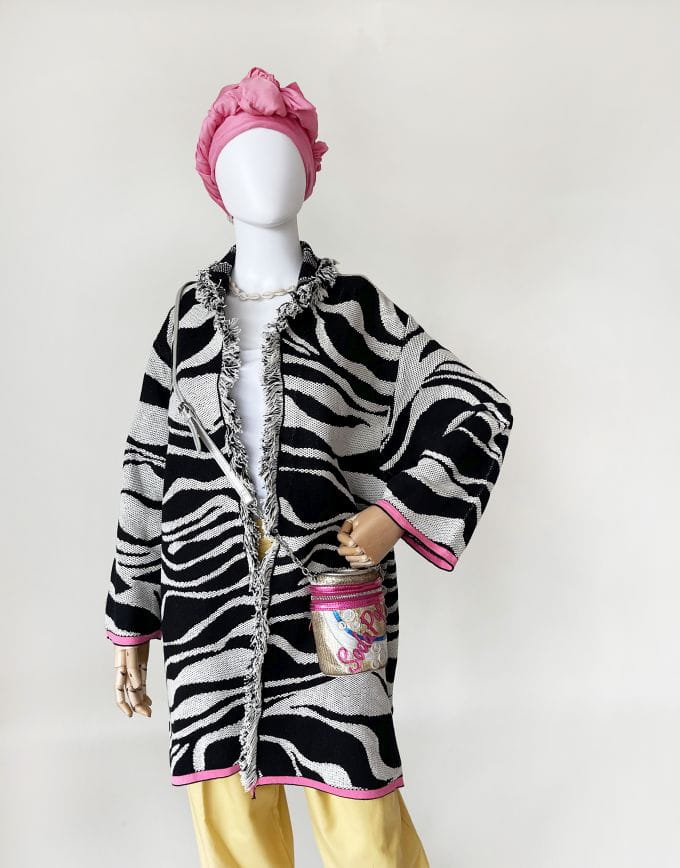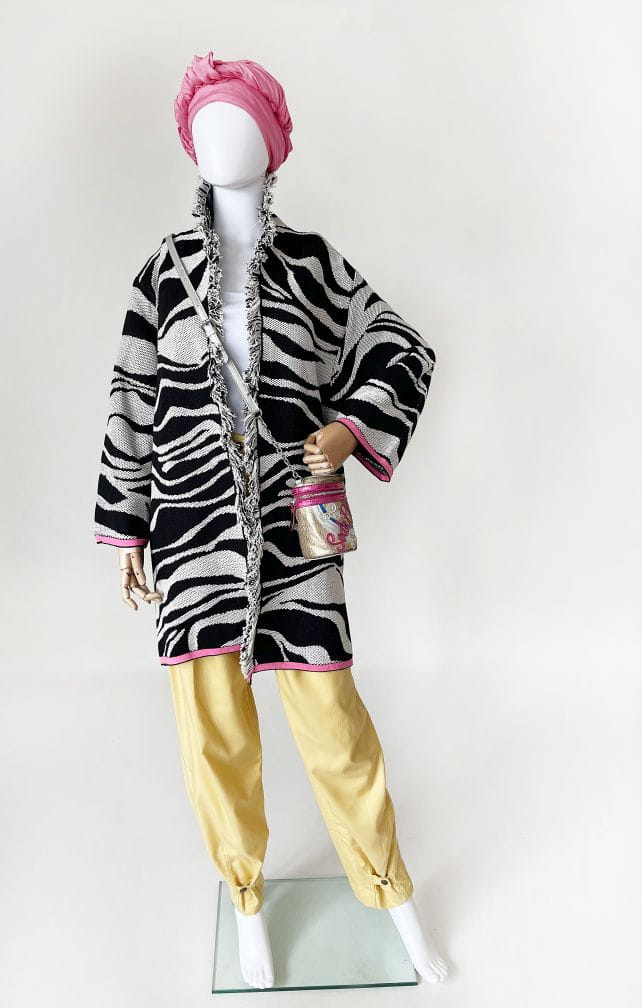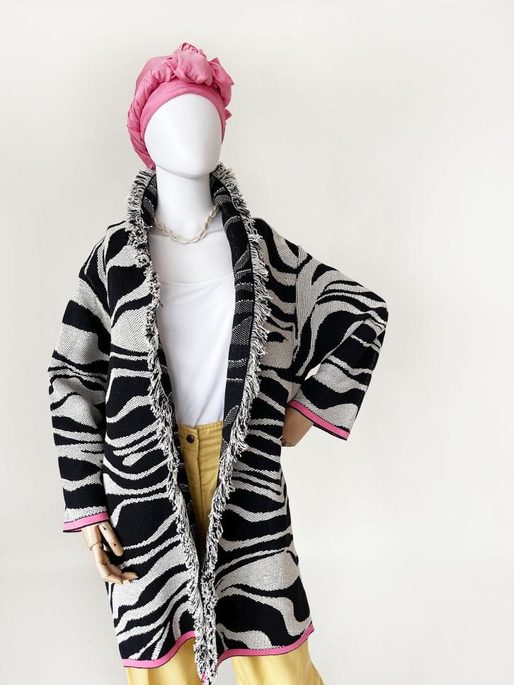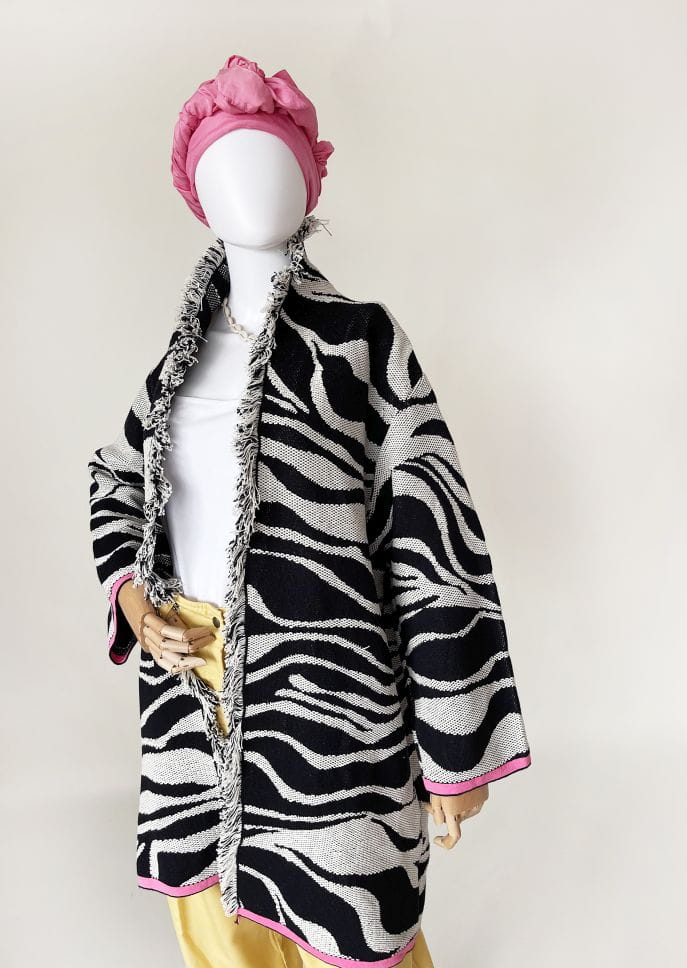Gobelinowy kardigan w stylu etno. Model projektu włoskiej marki Vicolo. Luźny otwarty fason z szerszymi rękawami. Wykonany z bawełnianej dzianiny w czarno-białe wzory, na końcach krótkie neonowe różowe ściągacze. Wykończenia z krótkim, gęstych frędzli. W cieplejsze dni z powodzeniem zastąpi płaszcz. Cena sklepowa nowego modelu ok 600 - 800 zł