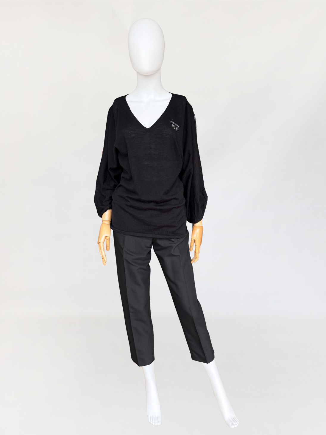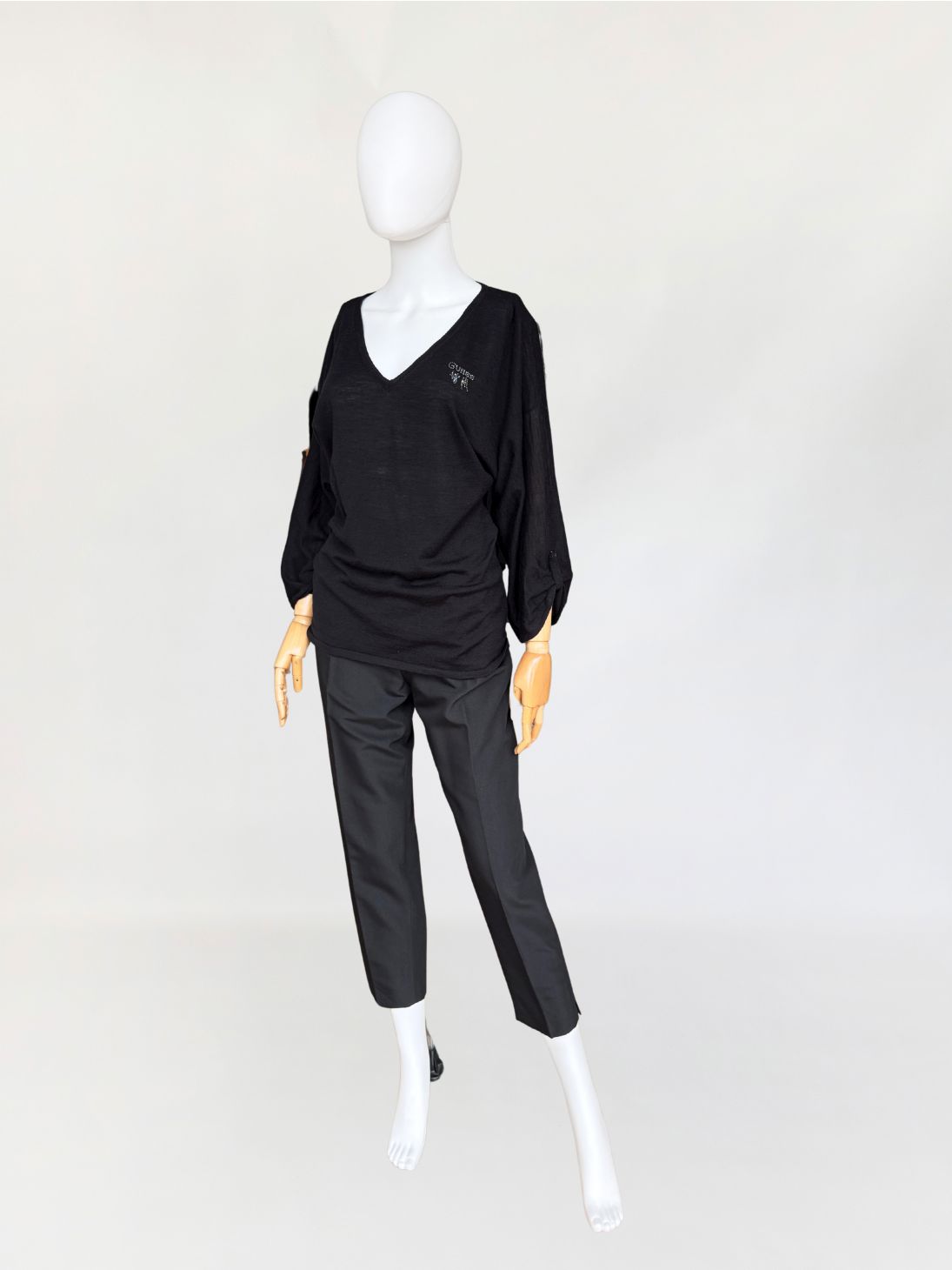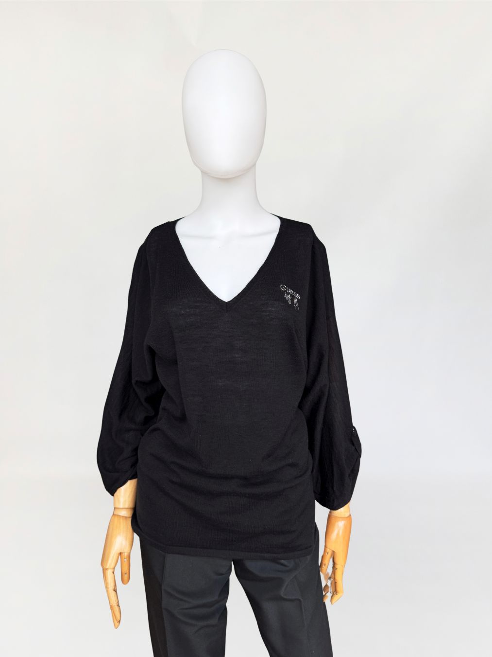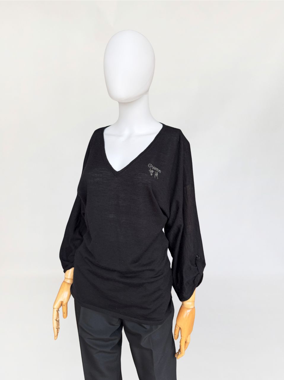 Casual'owy sweter Guess by Marciano o minimalistycznej formie. Wykonany z lekkiej wełnianej dzianiny. Luźniejsza forma z dekoltem v-neck i długimi, podwijanymi rękawami. Przy dekolcie aplikacja z logo marki wysadzana cyrkoniami.