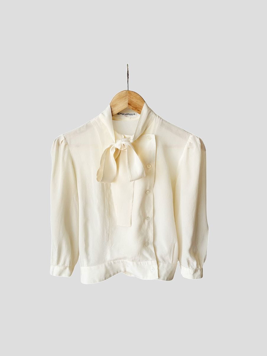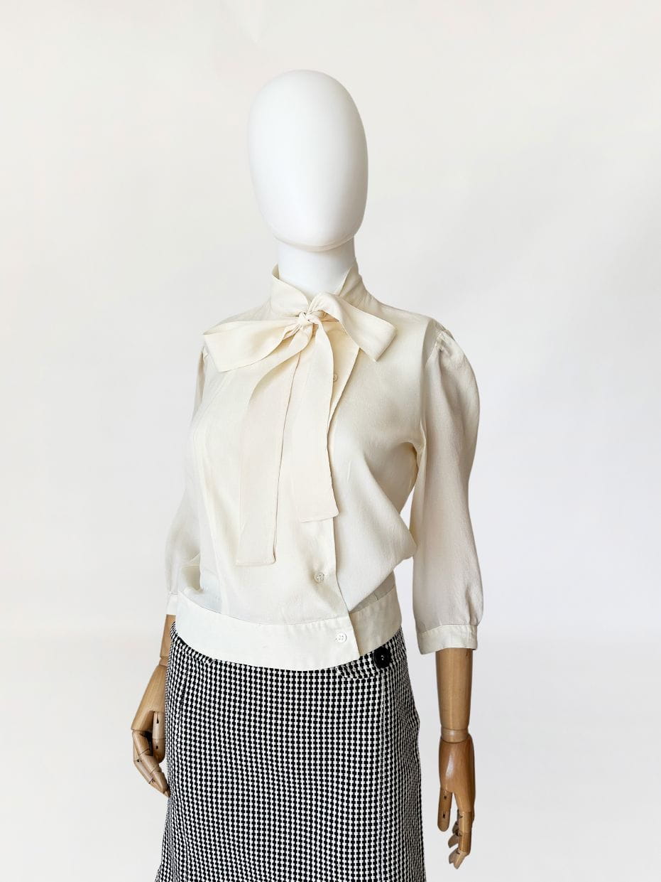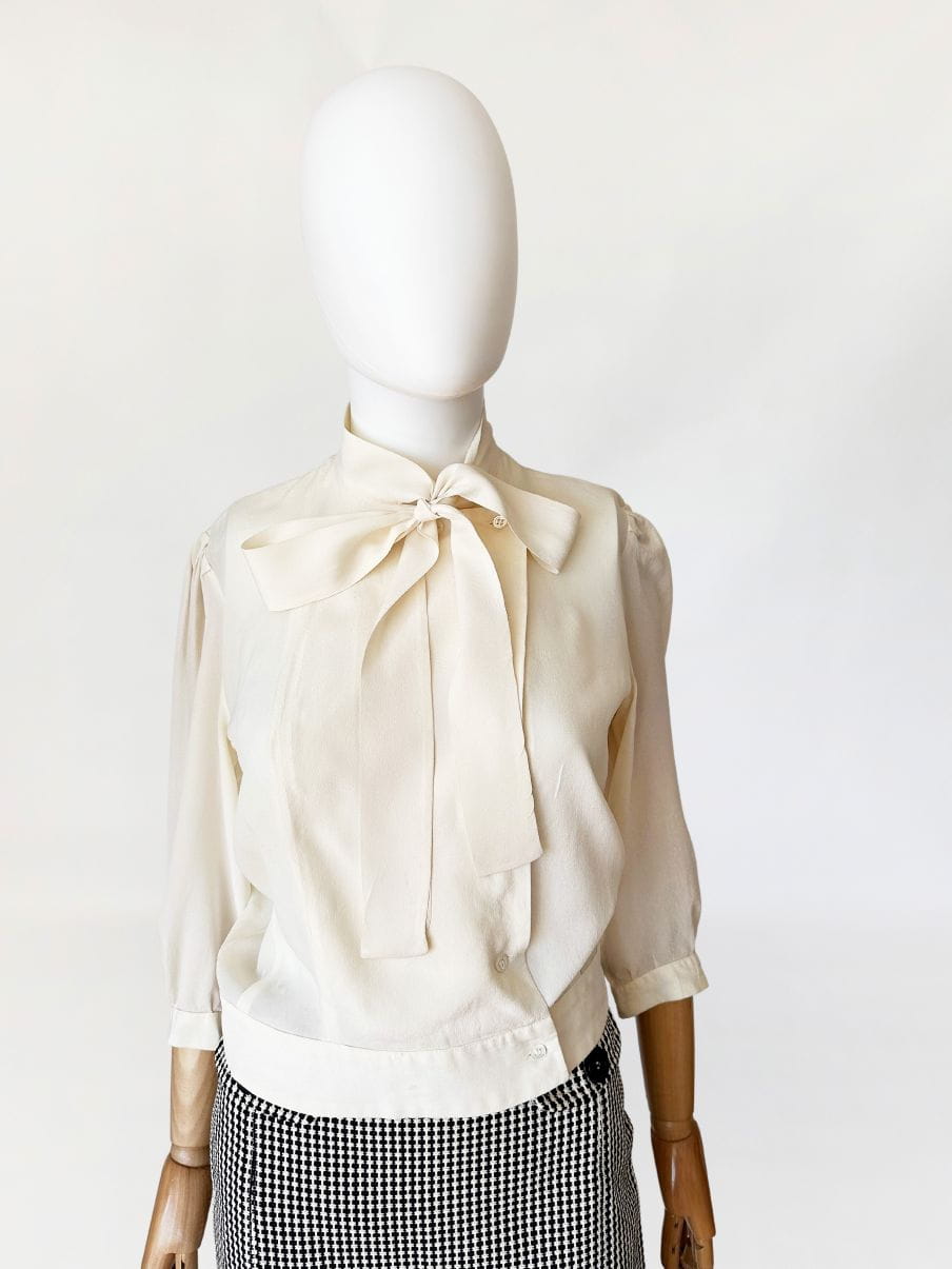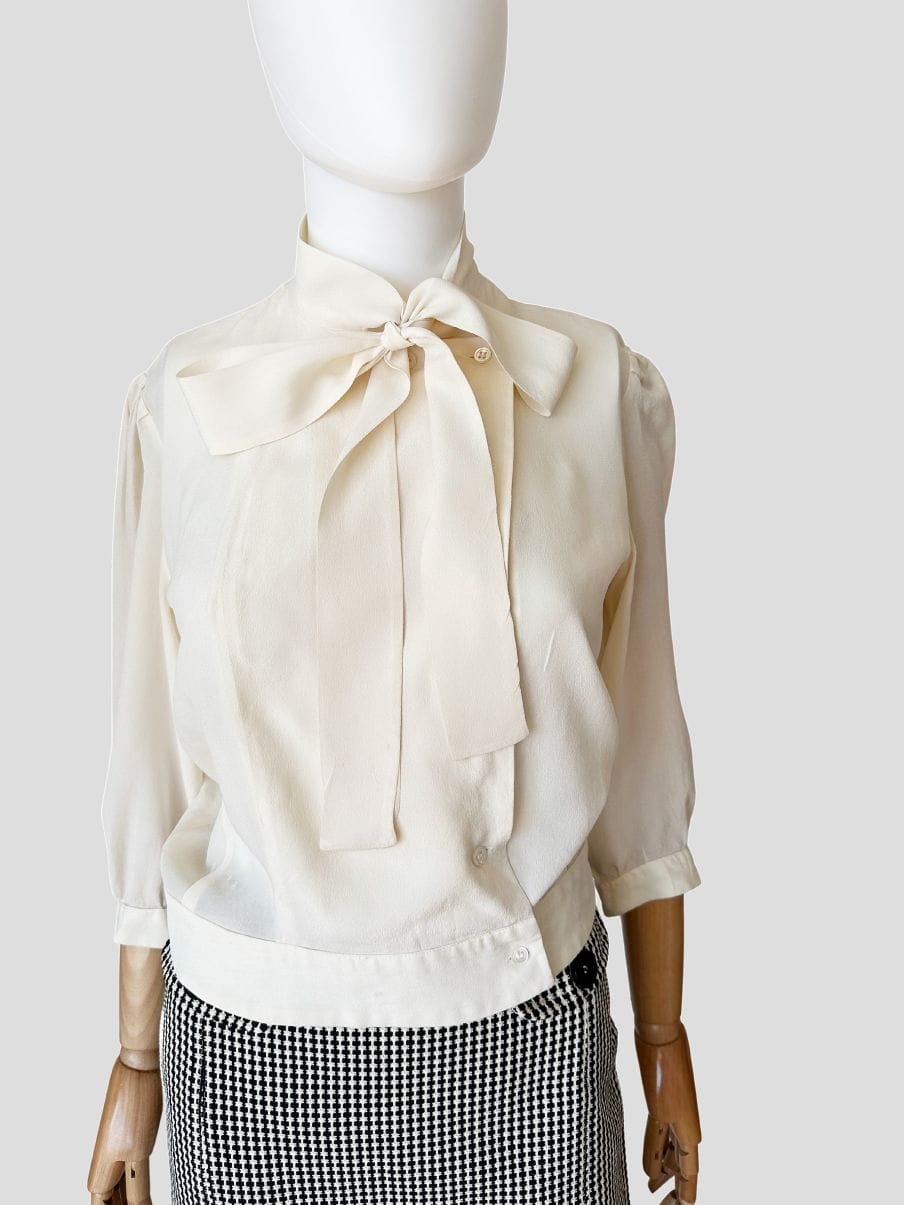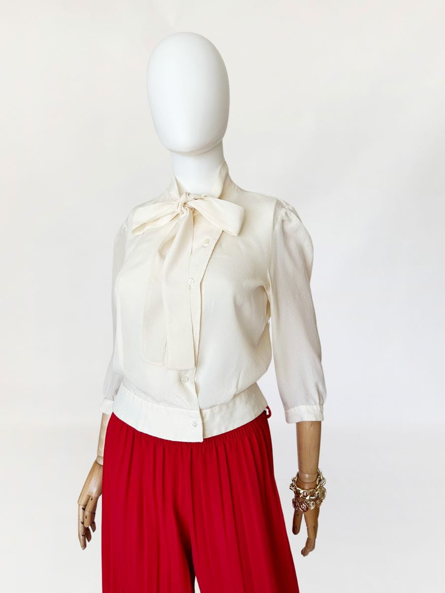 Koszulowa vintage z lat 70-tych marki Guy Laroche. Wykonana w całości z naturalnego jedwabiu w kolorze ecru. Krótki fason z rękawami 3/4. Asymetryczne zapięcie na ciąg drobnych guzików. Szalowy przewiązywany kołnierz. Swobodny fason z węższym wykończeniem u dołu.