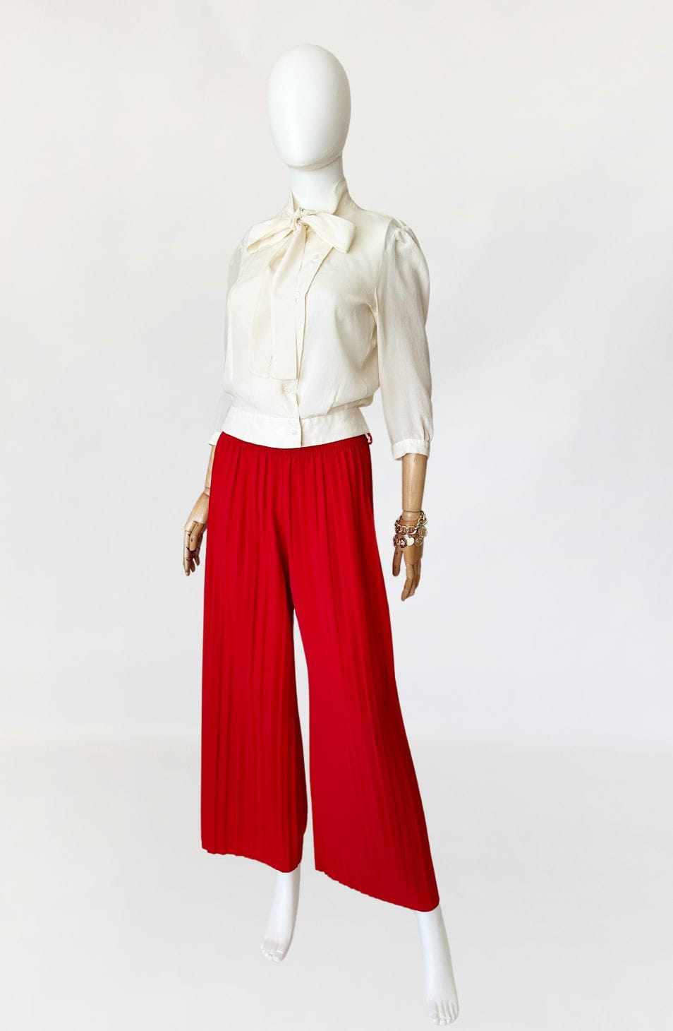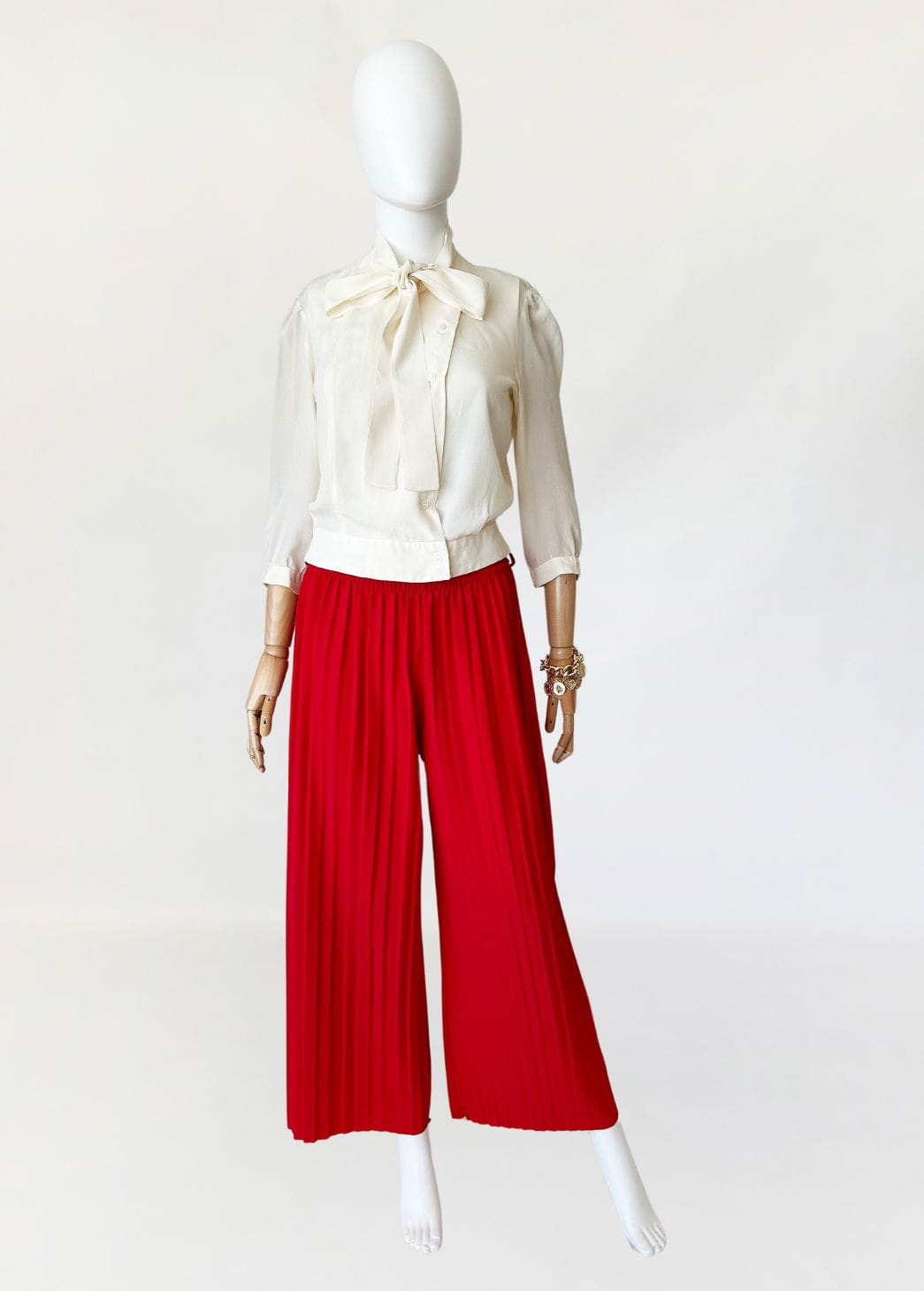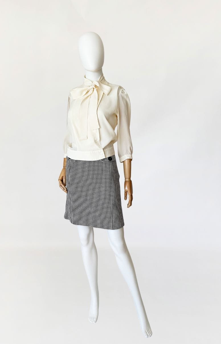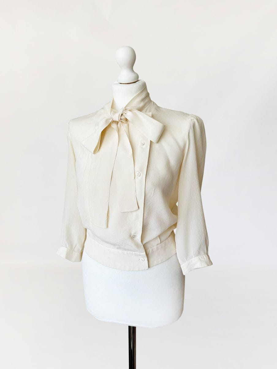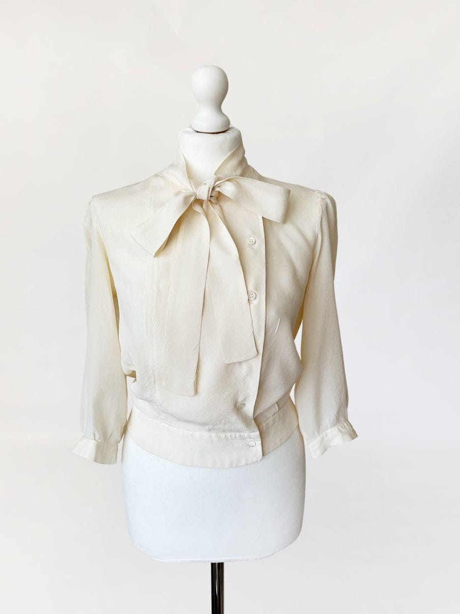 Koszulowa vintage z lat 70-tych marki Guy Laroche. Wykonana w całości z naturalnego jedwabiu w kolorze ecru. Krótki fason z rękawami 3/4. Asymetryczne zapięcie na ciąg drobnych guzików. Szalowy przewiązywany kołnierz. Swobodny fason z węższym wykończeniem u dołu.