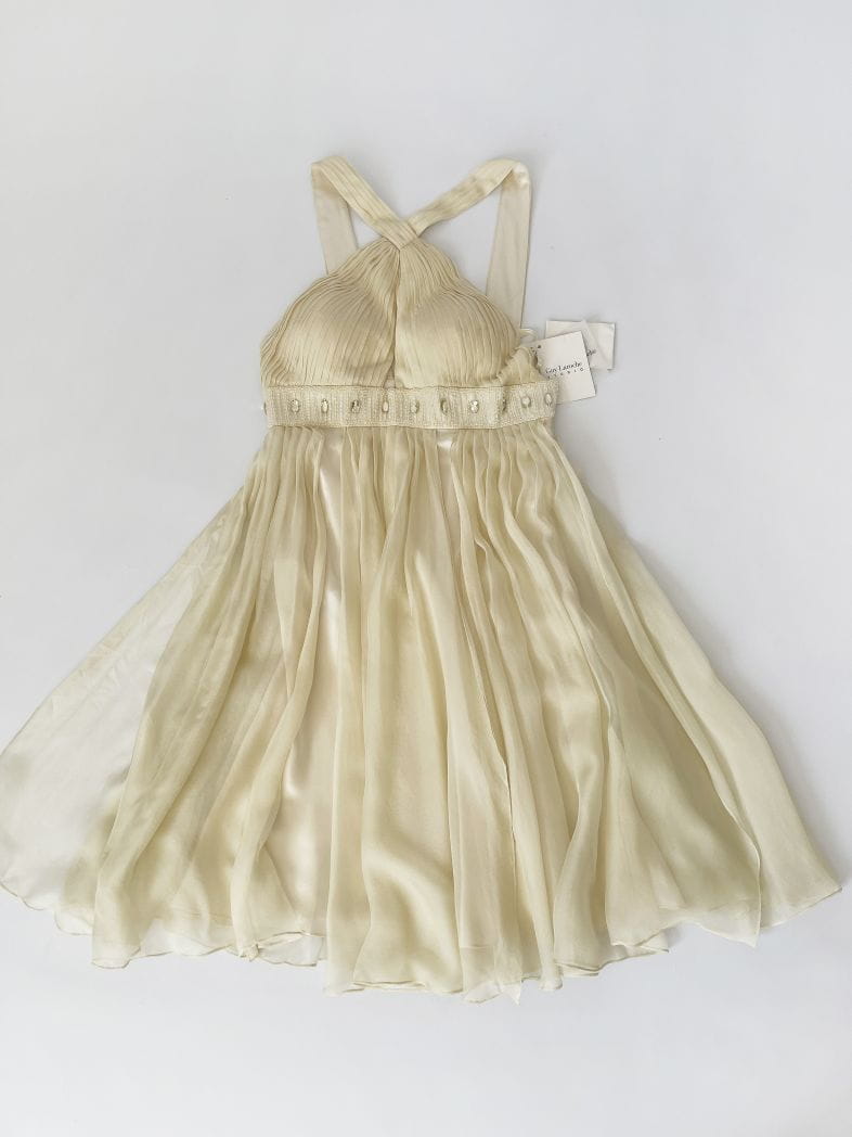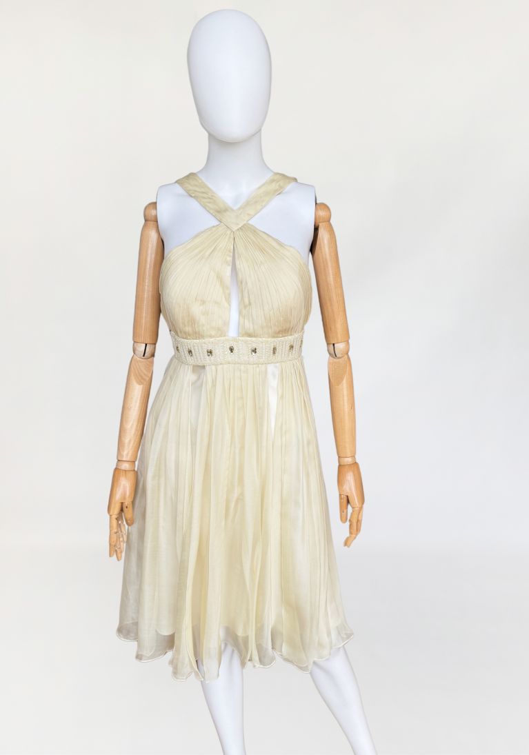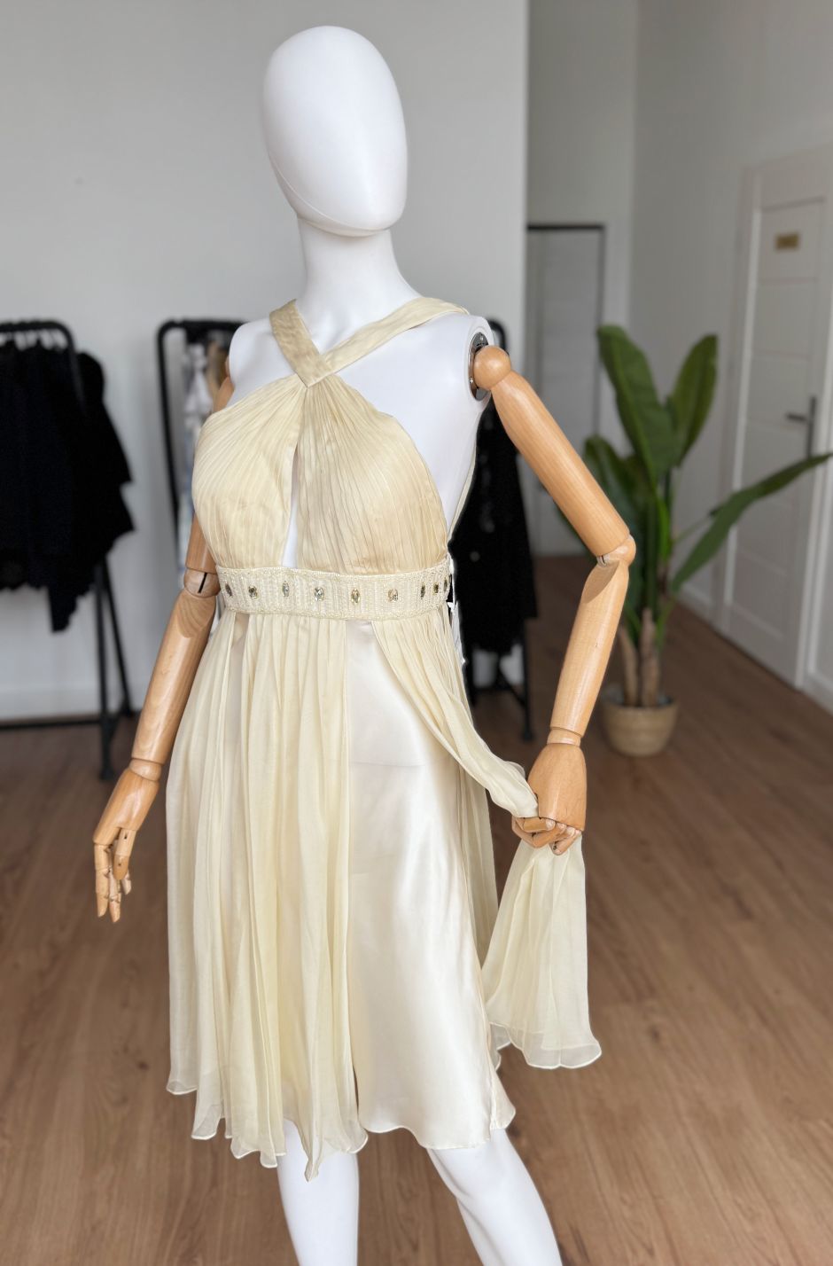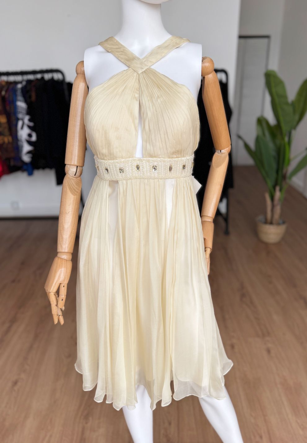 Nieużywana, z kompletem papierowych metek. Oryginalna sukienka luksusowej francuskiej marki Guy Laroche. Koktajlowy model wykonany w całości z naturalnego jedwabiu. Plisowana góra z usztywnianymi miseczkami i krzyżującymi się ramiączkami. Talia dopasowana, wysadzana stylowymi biżuteryjnymi aplikacjami. Dół z jedwabnej satyny z plisowanymi, swobodnymi pasami materiału z wierzchu.