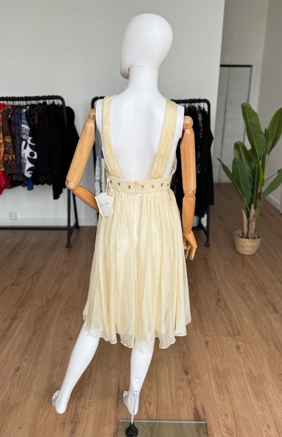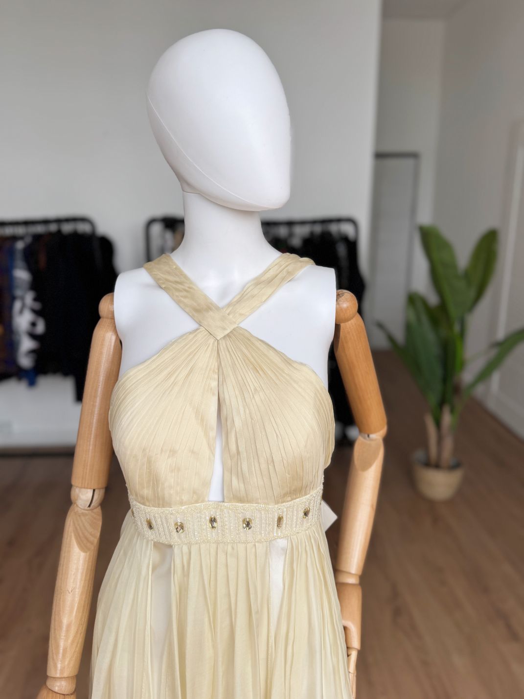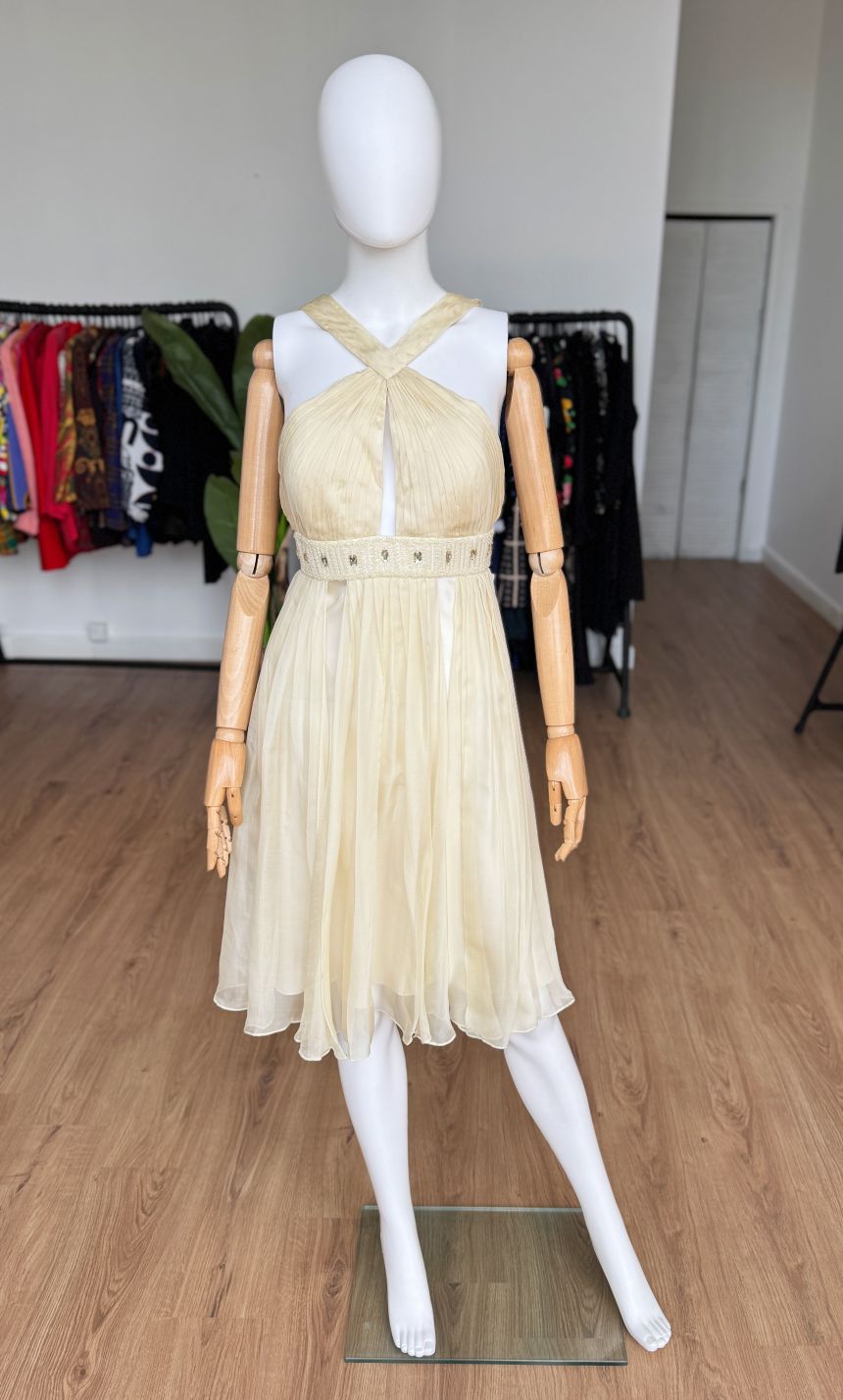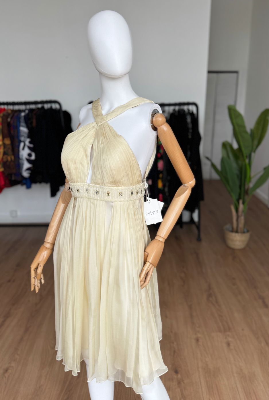 Nieużywana, z kompletem papierowych metek. Oryginalna sukienka luksusowej francuskiej marki Guy Laroche. Koktajlowy model wykonany w całości z naturalnego jedwabiu. Plisowana góra z usztywnianymi miseczkami i krzyżującymi się ramiączkami. Talia dopasowana, wysadzana stylowymi biżuteryjnymi aplikacjami. Dół z jedwabnej satyny z plisowanymi, swobodnymi pasami materiału z wierzchu.
