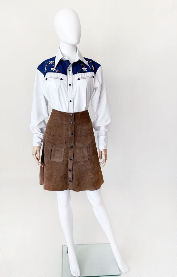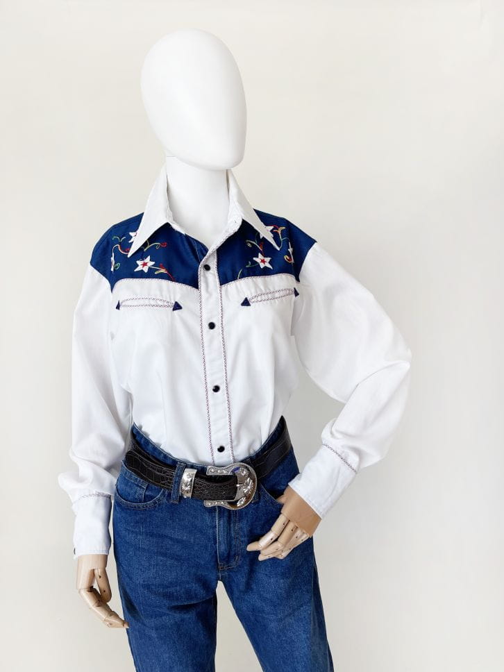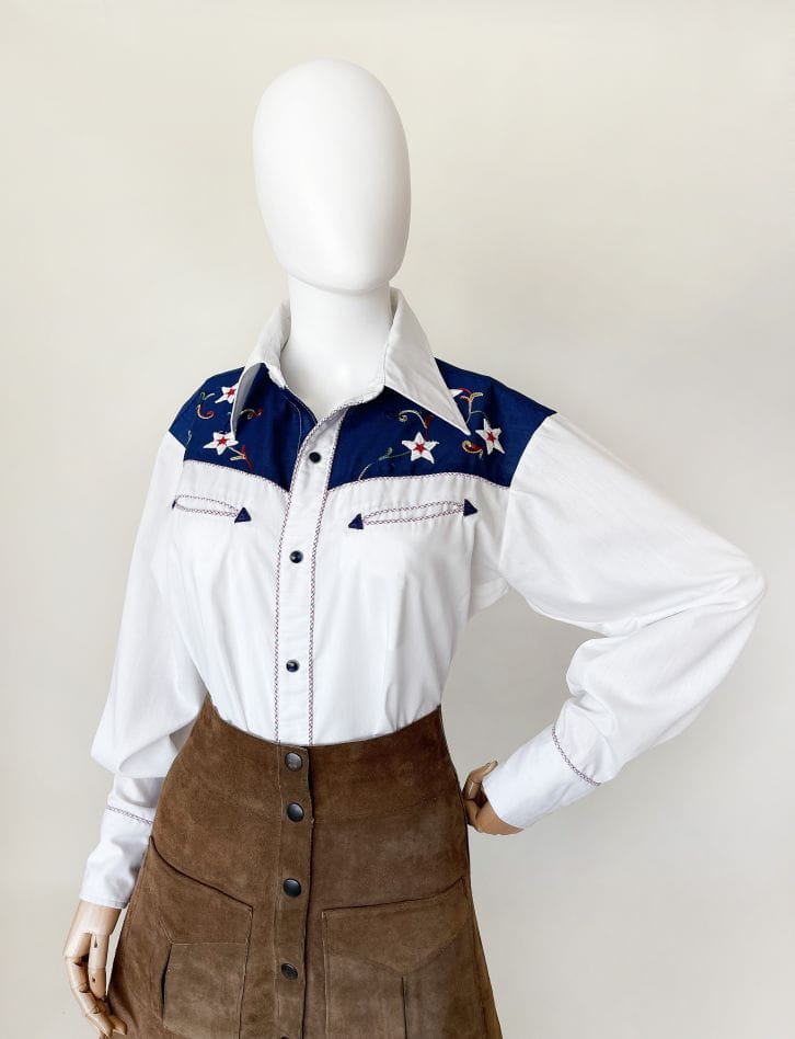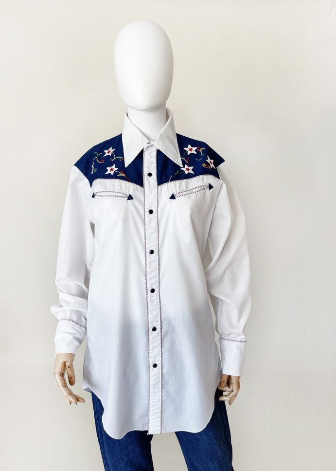 Koszula western z USA projektu kultowej marki H BAR C California. Autentyczny model vintage z lat 70-tych. Uszyta z lekkiej koszulowej bawełnianej tkaniny. Przód i karczek wyszywane charakterystycznymi dla marki kolorowymi aplikacjami. Zapinana na kontrastowe czarne napy, wzdłuż linii zapięcia i kieszeni drobna lamówka w kratę. U góry płytkie kieszenie w kształcie strzał. Model o dłuższym fasonie, zapinana na męską stronę - co nie stanowi żadnego problemu bo jest doskonała jako unisex (z ciekawostek: prawie wszystkie poprzednie modele marki kupiły od nas kobiety i były zachwycone). Długie rękawy z wysokimi mankietami, także przepinanymi napami. Wyjątkowy, rzadki egzemplarz na lata. Ceny używanych koszul marki przekraczają na Etsy 1000 zł.