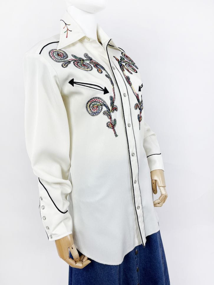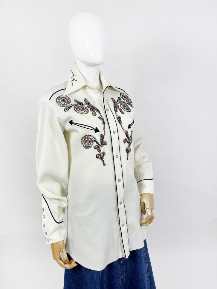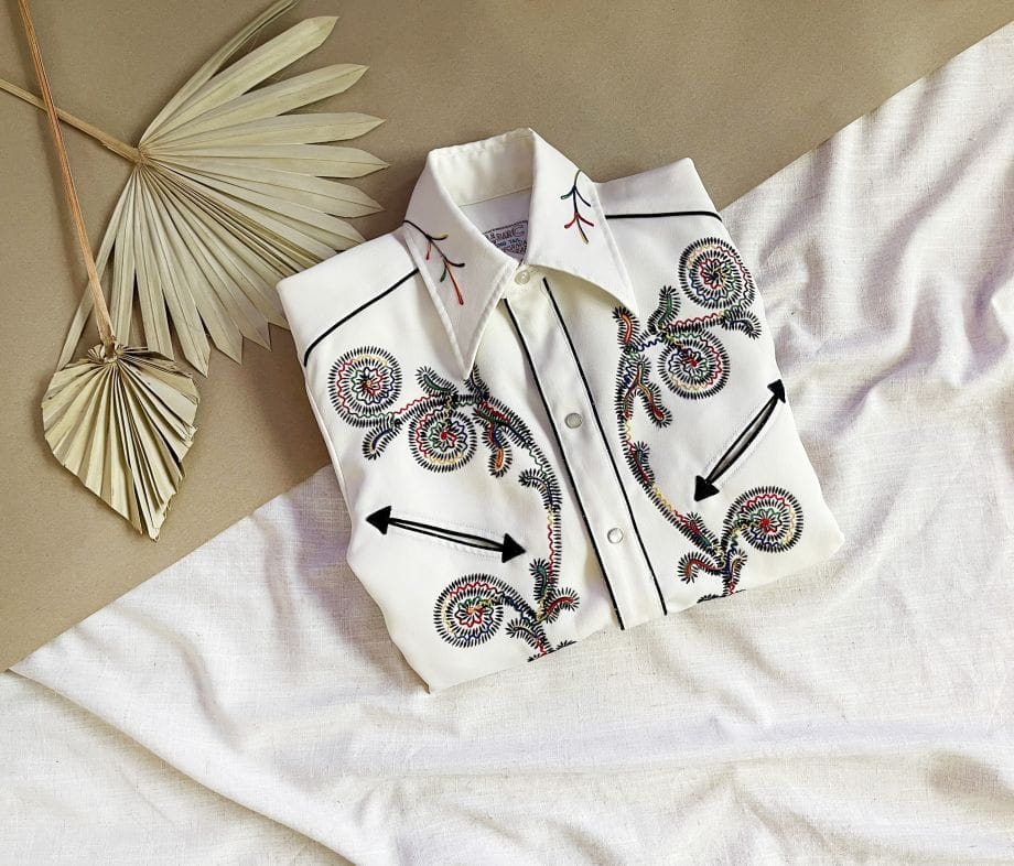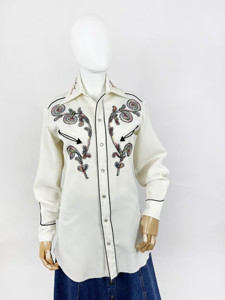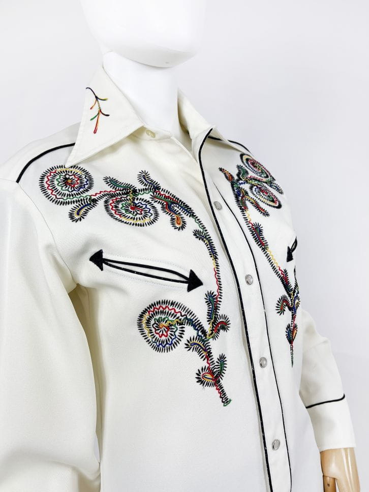 Z dumą prezentujemy Wam kolejny w naszej ofercie egzemplarz marki: Absolutnie unikatowa, prawdziwa perła z końca lat 60-tych/70-tych. Koszula western kultowej amerykańskiej marki H Bar C. Wykonana z solidnej, nieco grubszej tkaniny w kolorze śmietankowym. Przód z haftowanymi tęczowymi aplikacjami charakterystycznymi dla marki. Kontrastowa czarna lamówka. U góry niewielkie wsuwane kieszenie w kształcie strzał. Lekko taliowany dłuższy fason. Zapinana na perłowe napy, przy kołnierzu klasyczny guzik. Długie mankiety z lamówką i napami. Wyjątkowy, bardzo rzadki egzemplarz na lata. Ceny używanych koszul marki przekraczają na Etsy 1000 zł.