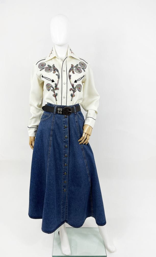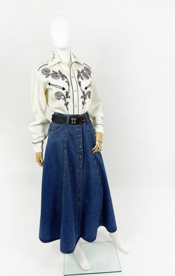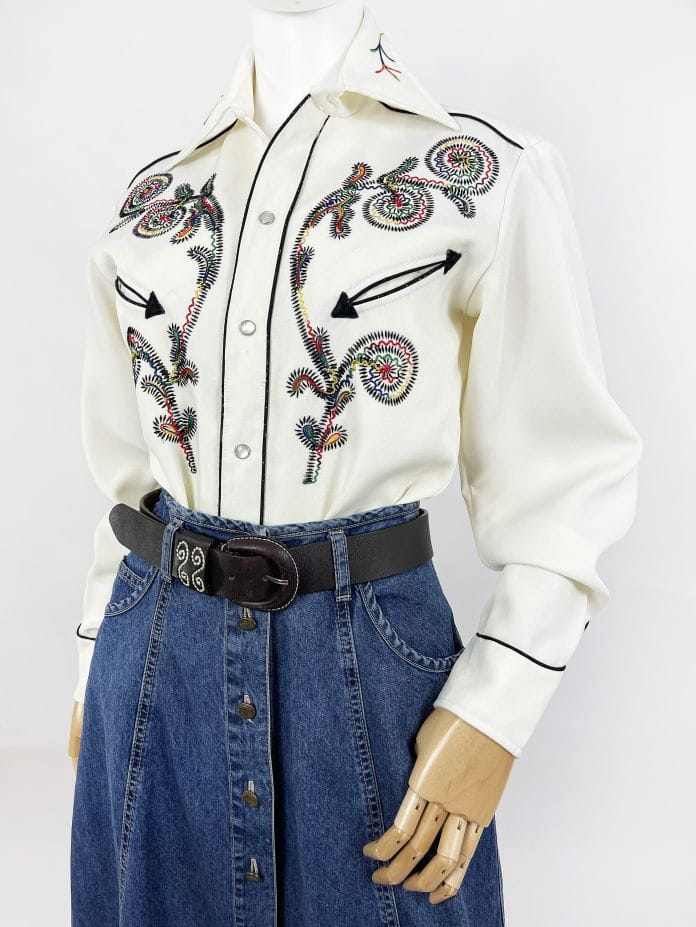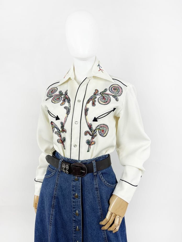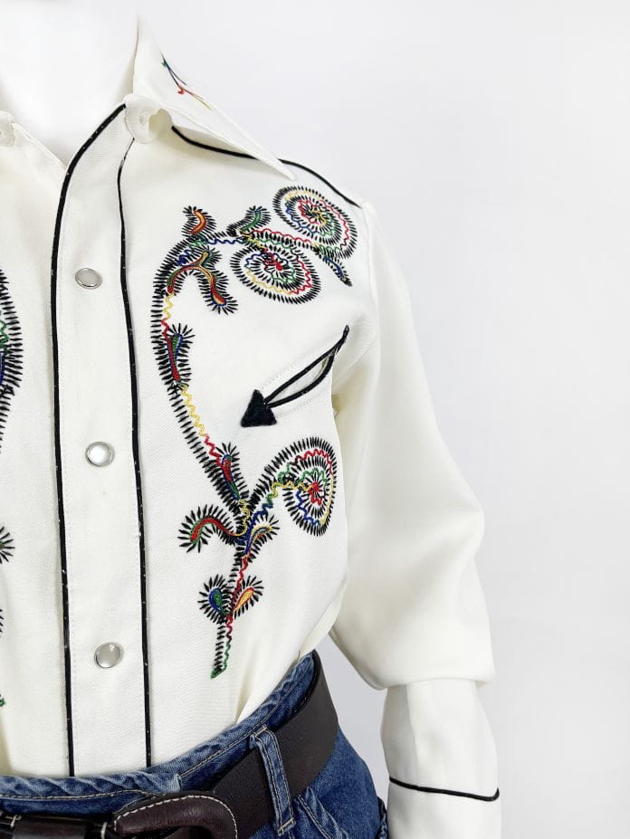 Z dumą prezentujemy Wam kolejny w naszej ofercie egzemplarz marki: Absolutnie unikatowa, prawdziwa perła z końca lat 60-tych/70-tych. Koszula western kultowej amerykańskiej marki H Bar C. Wykonana z solidnej, nieco grubszej tkaniny w kolorze śmietankowym. Przód z haftowanymi tęczowymi aplikacjami charakterystycznymi dla marki. Kontrastowa czarna lamówka. U góry niewielkie wsuwane kieszenie w kształcie strzał. Lekko taliowany dłuższy fason. Zapinana na perłowe napy, przy kołnierzu klasyczny guzik. Długie mankiety z lamówką i napami. Wyjątkowy, bardzo rzadki egzemplarz na lata. Ceny używanych koszul marki przekraczają na Etsy 1000 zł.