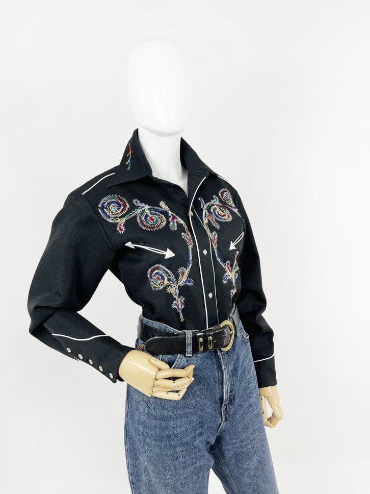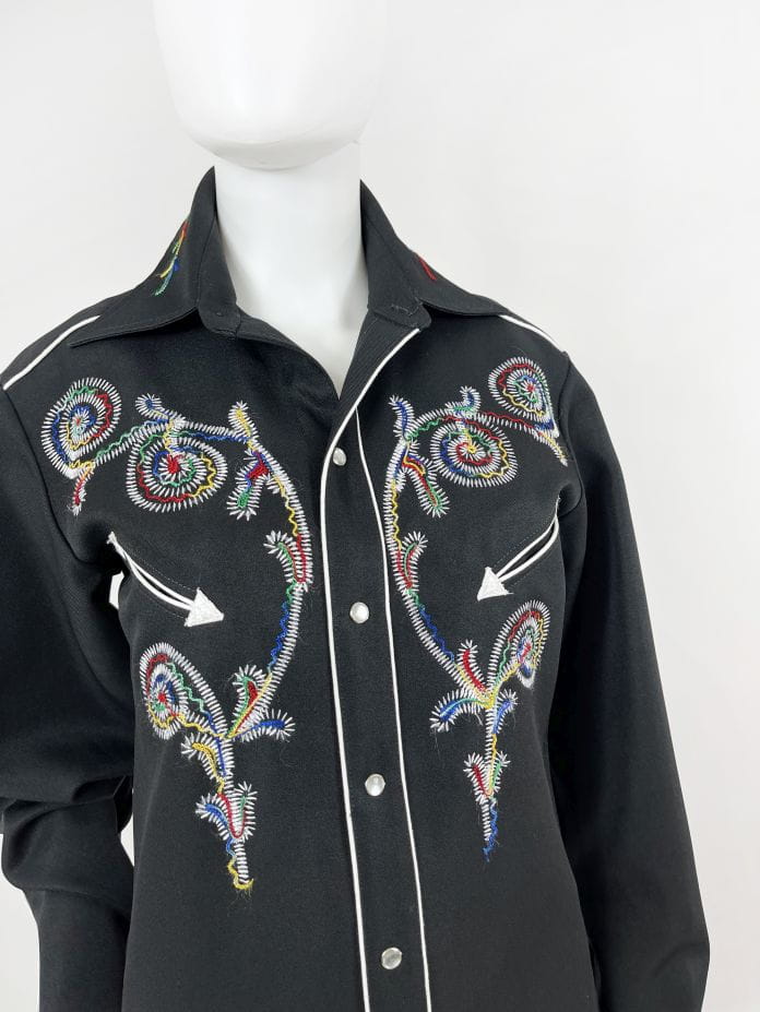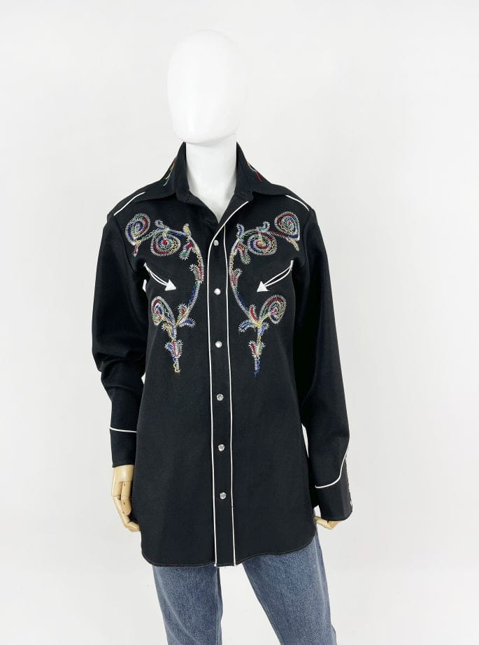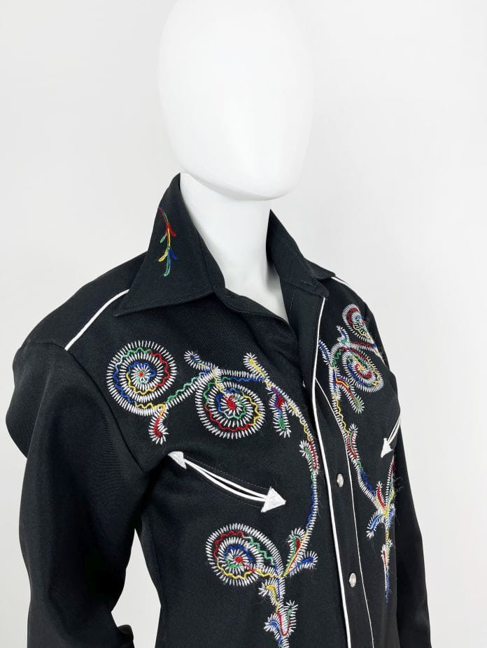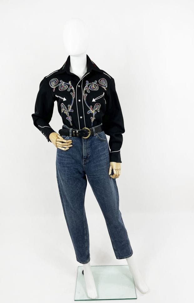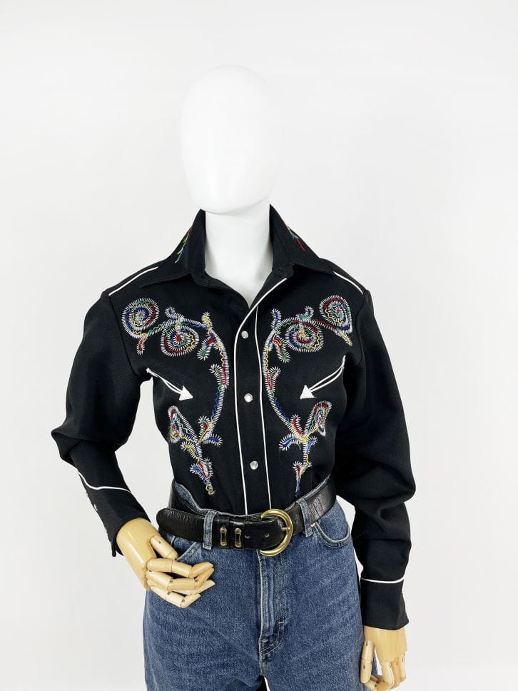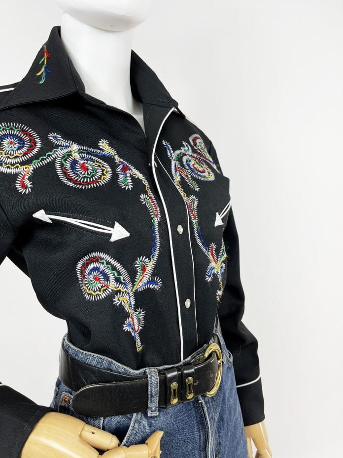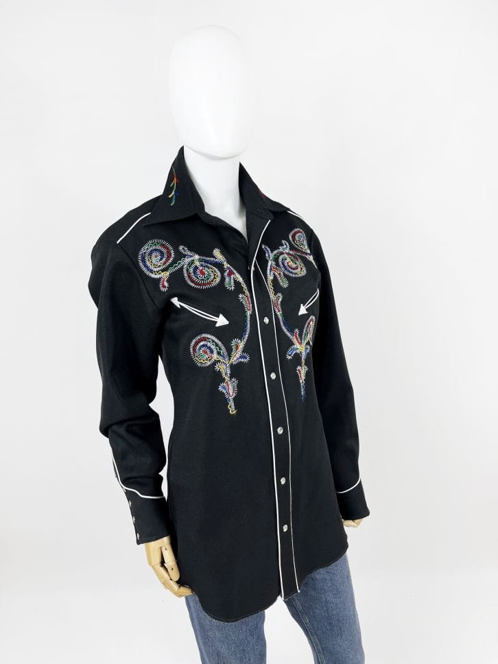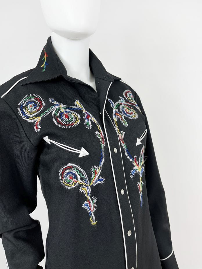 Absolutnie unikatowa, prawdziwa perła z lat 60-tych. Kolejna w naszej ofercie koszula western kultowej amerykańskiej marki H Bar C. Tym razem model pochodzący z lat 60-tych. Wykonana z solidnej, nieco grubszej tkaniny w kolorze czarnym. Przód z haftowanymi tęczowymi aplikacjami charakterystycznymi dla marki. Kontrastowa biała lamówka. U góry niewielkie wsuwane kieszenie w kształcie strzał. Lekko taliowany dłuższy fason. Zapinana na perłowe napy, przy kołnierzu klasyczny guzik. Długie mankiety z lamówką i napami. Wyjątkowy, bardzo rzadki egzemplarz na lata. Ceny używanych koszul marki przekraczają na Etsy 1000 zł.