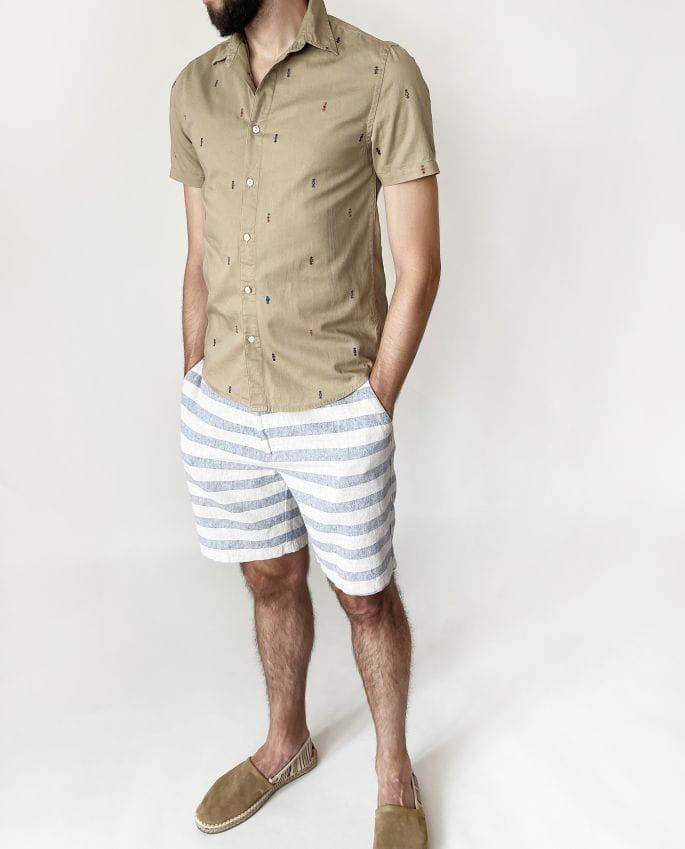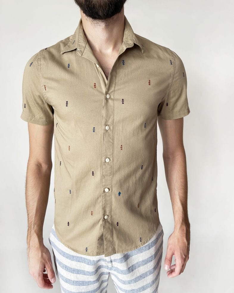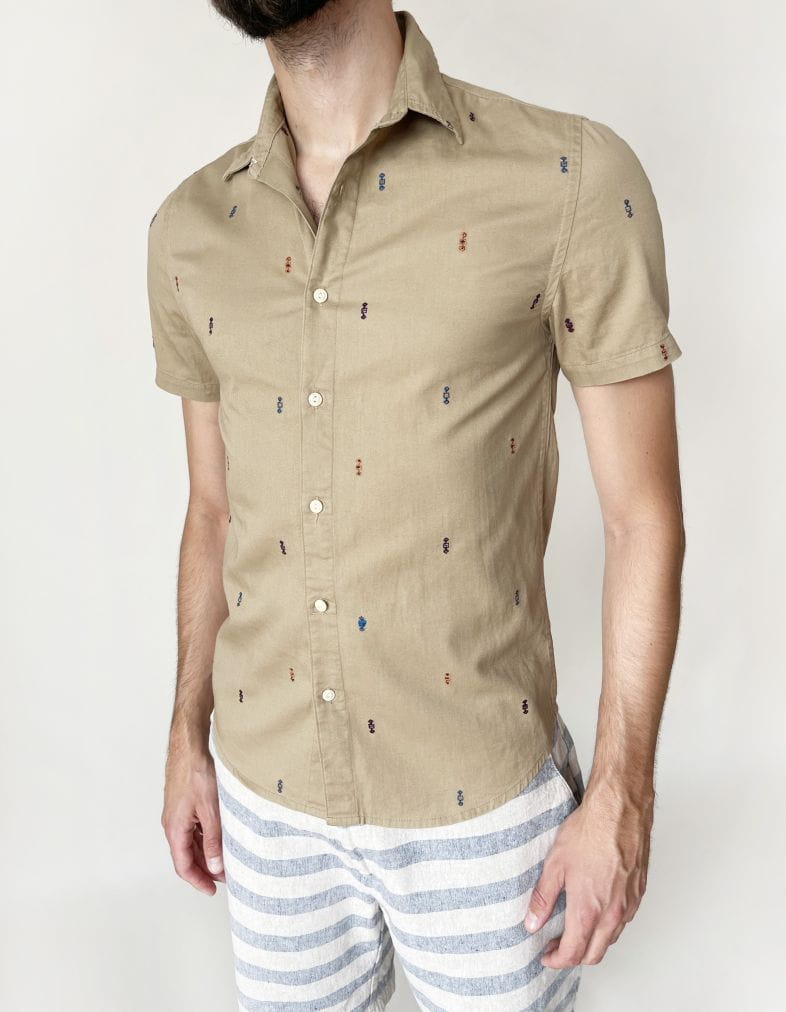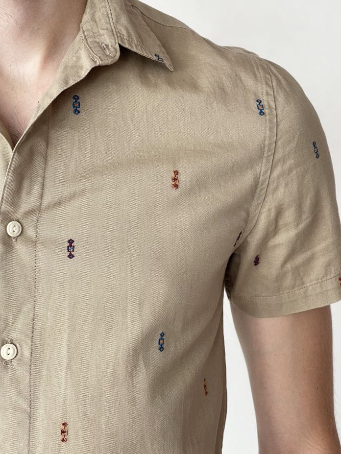 Koszula marki Asos wykonana z bawełnianej tkaniny w kolorze beżowym w drobne haftowane aplikacje. Lekko slimowany fason.