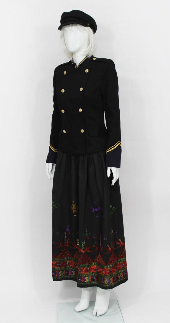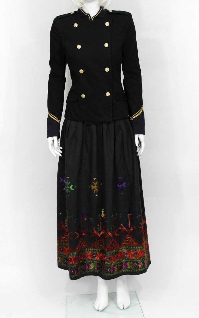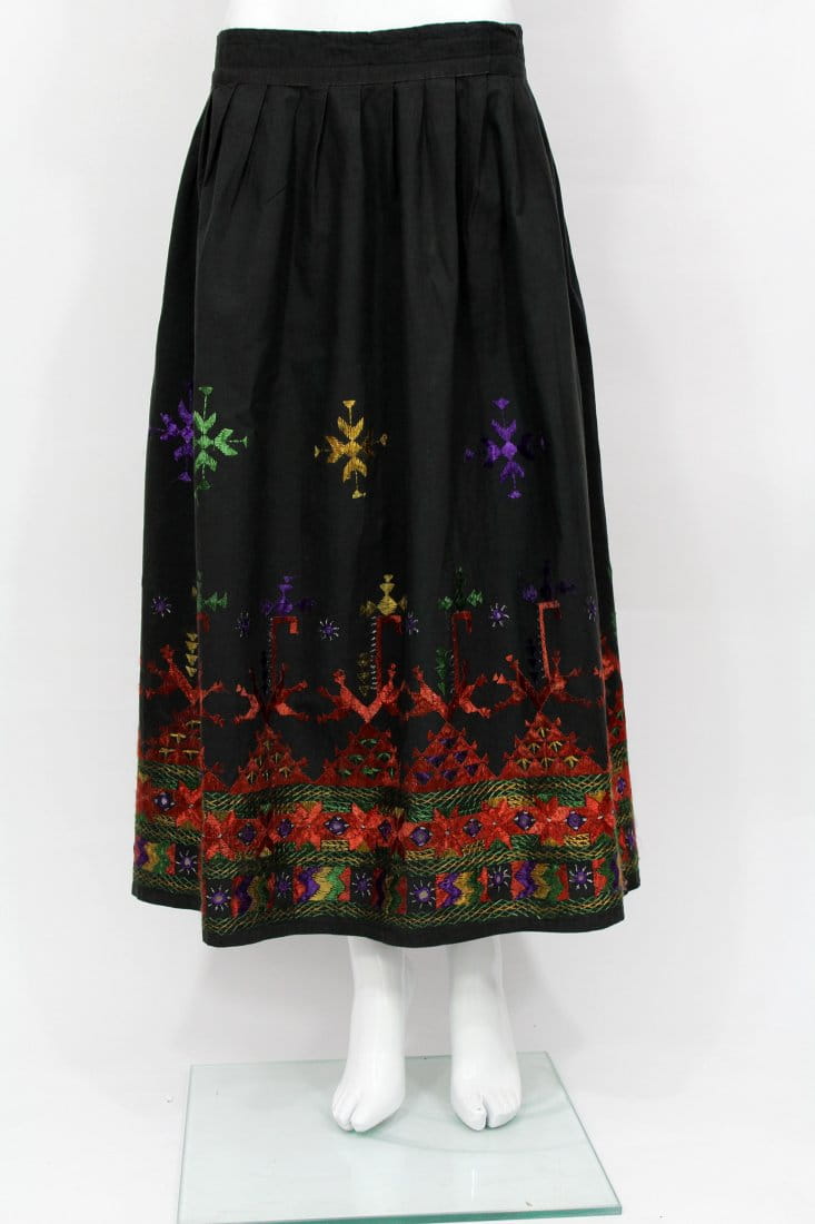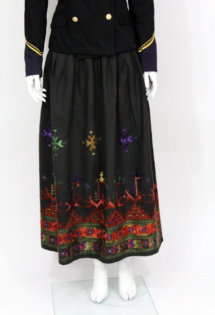 Czarna spódnica midi w stylu Valentino, bogato haftowana - duże kolorowe misternie wyszywane aplikacje. Góra swobodna, ma gumkę. Pod linią pasa drapowana o kroju swobodnym, lekko rozkloszowanym.