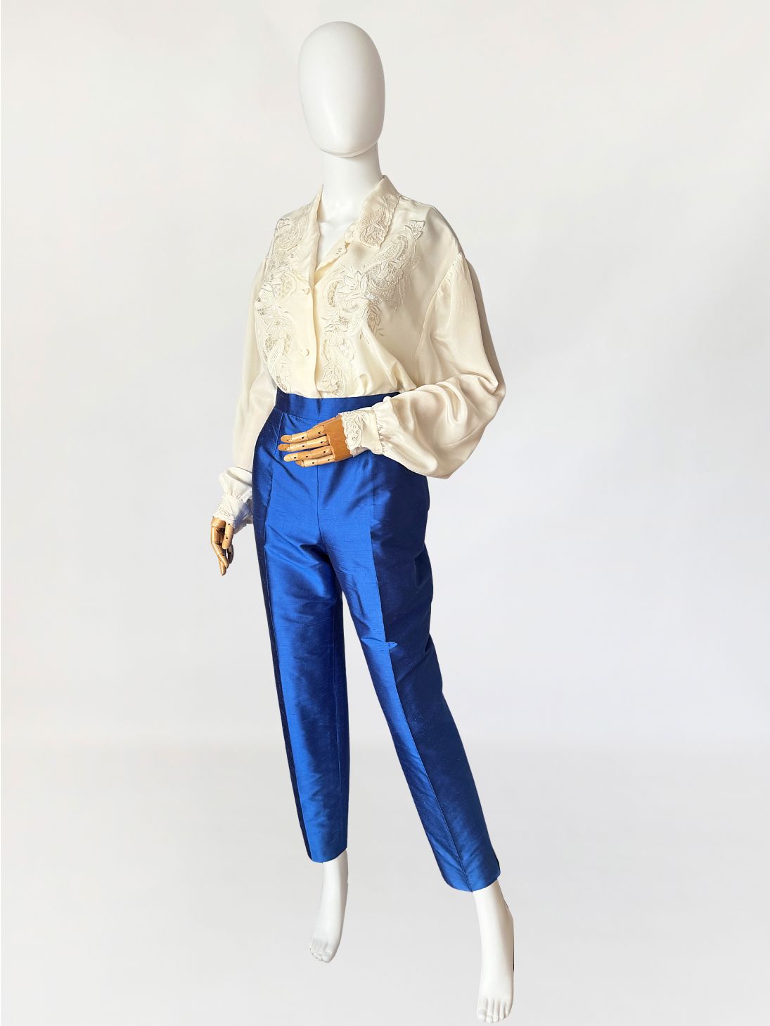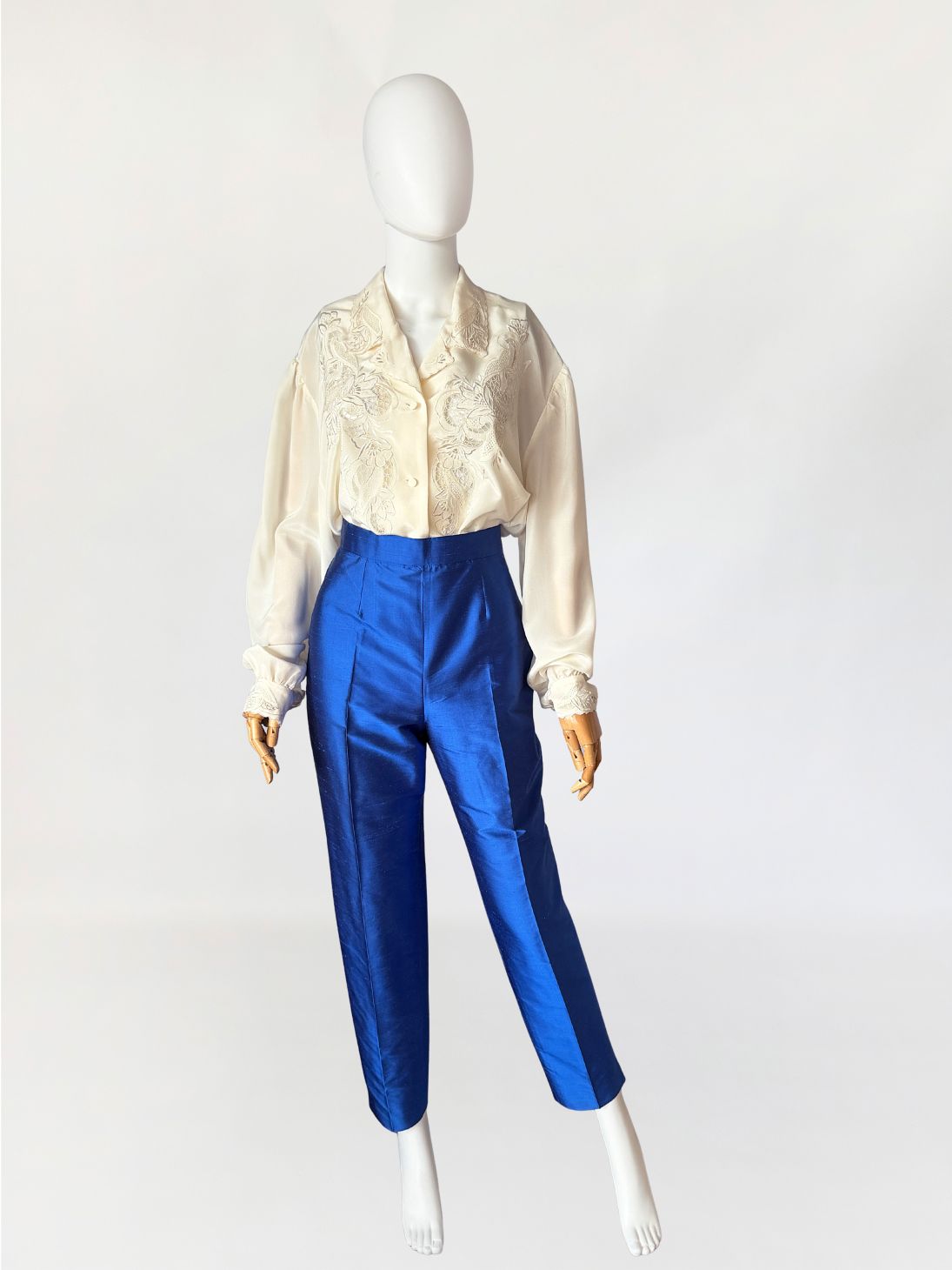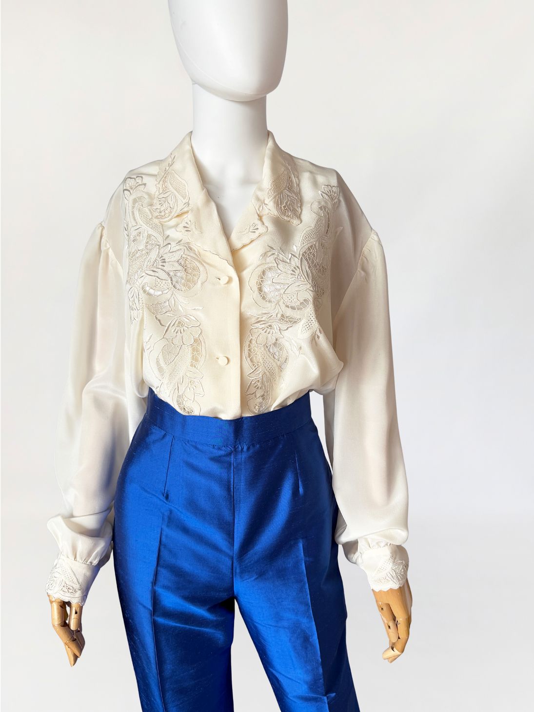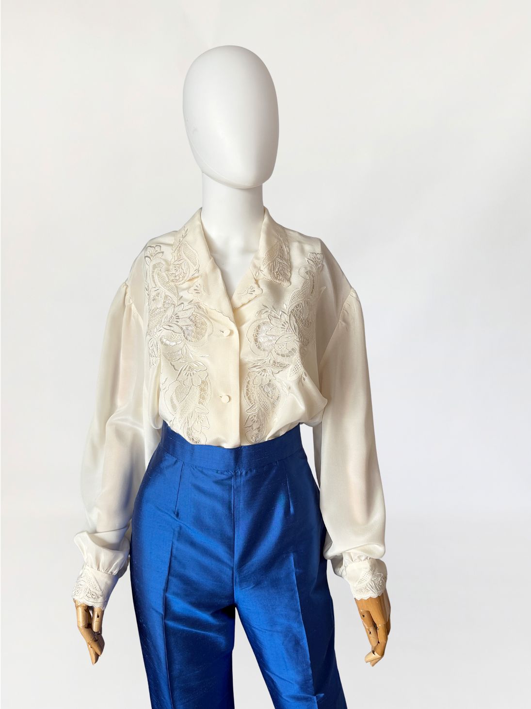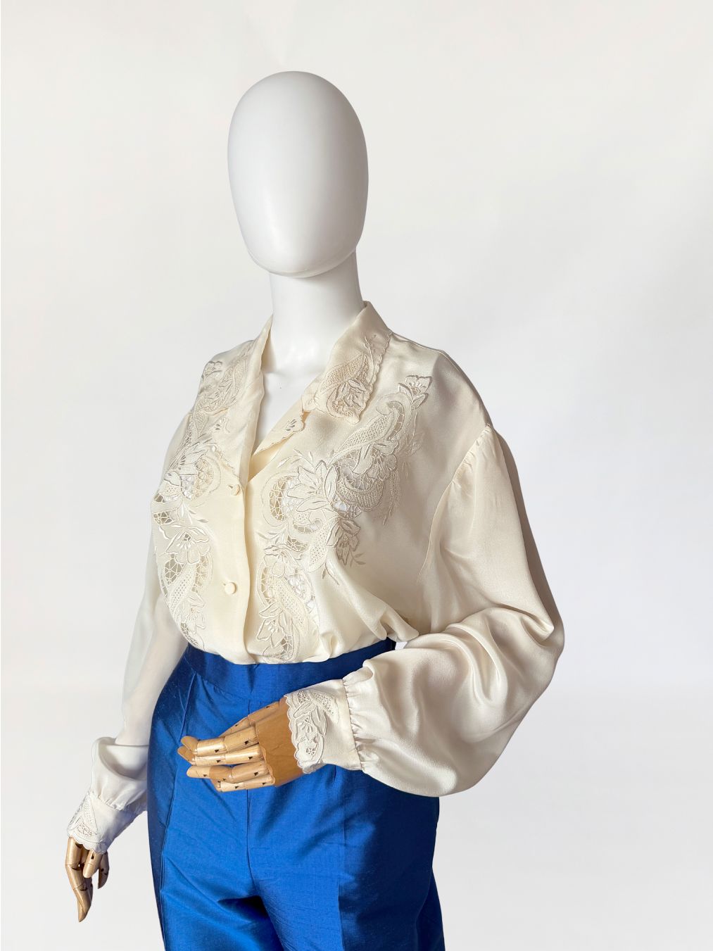 Włoska koszula vintage wykonana w całości z naturalnego jedwabiu w jasnym, kremowym odcieniu. Swobodny fason z lekko opuszczoną linią ramion. Przód zapinany na rząd powlekanych guzików. Nieduży kołnierz z wyłogami o nieregularnej, dekoracyjnej linii wykończenia. W przedniej części rozmieszczone symetrycznie rozbudowane hafty o charakterze ornamentalnym, z elementami ażurowymi i gęstym ściegiem, przechodzące również na kołnierz. Rękawy długie, o zwiększonej objętości, zakończone mankietami z haftowanym wykończeniem oraz delikatnym marszczeniem przy wszyciu. Tył gładki, bez zdobień.