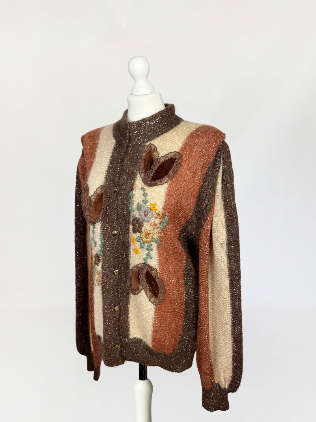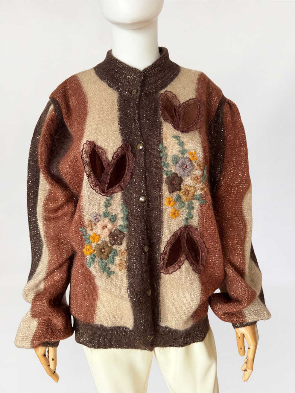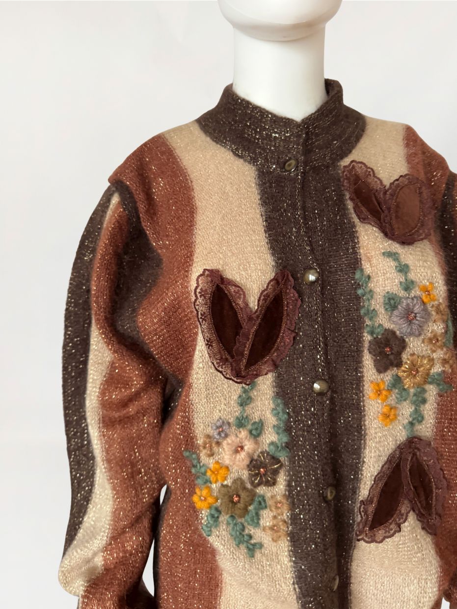 Włoski sweter vintage wykonany z luksusowej puszystej przędzy - miękkiego baby moheru. Dzianina w szerokie pionowe pasy w odcieniach gorzkiej czekolady, karmelu i kości słoniowej. Front dekorowany rozbudowanymi aplikacjami: haftowanymi motywami florystycznymi w odcieniach żółci, beżu, brązu i mięty, oraz trójwymiarowymi elementami z miękkiego aksamitu, zamkniętymi w koronkowych obrysach i wszytymi symetrycznie po obu stronach zapięcia. Rozpinany model o swobodnym fasonie z klasyczną linią ramion i rękawami o pełnej długości, zakończonymi mankietami o zwartym ściągaczu.