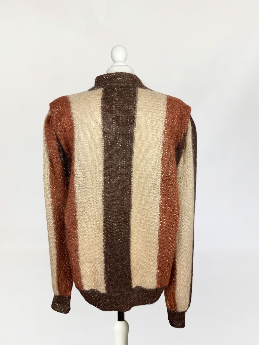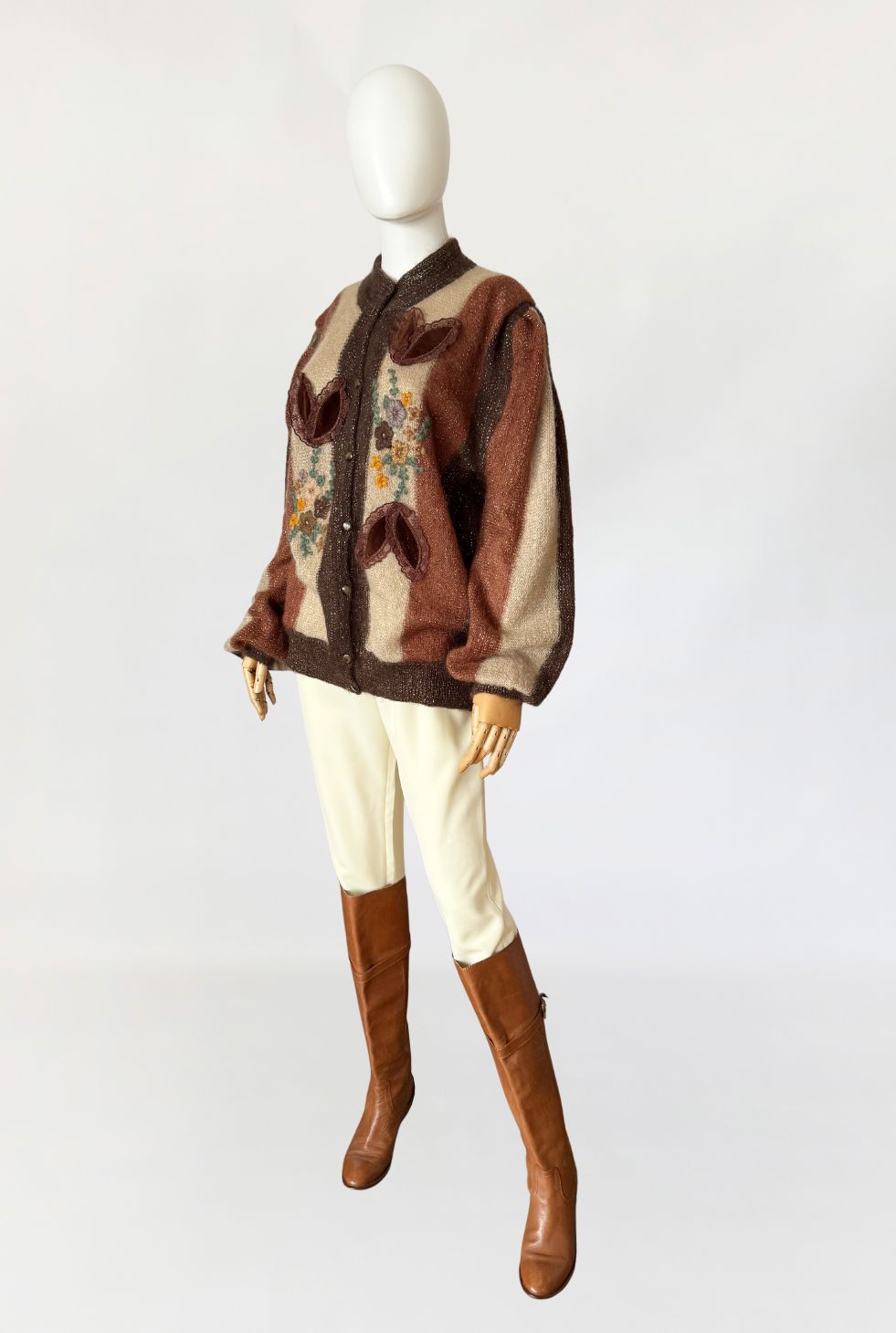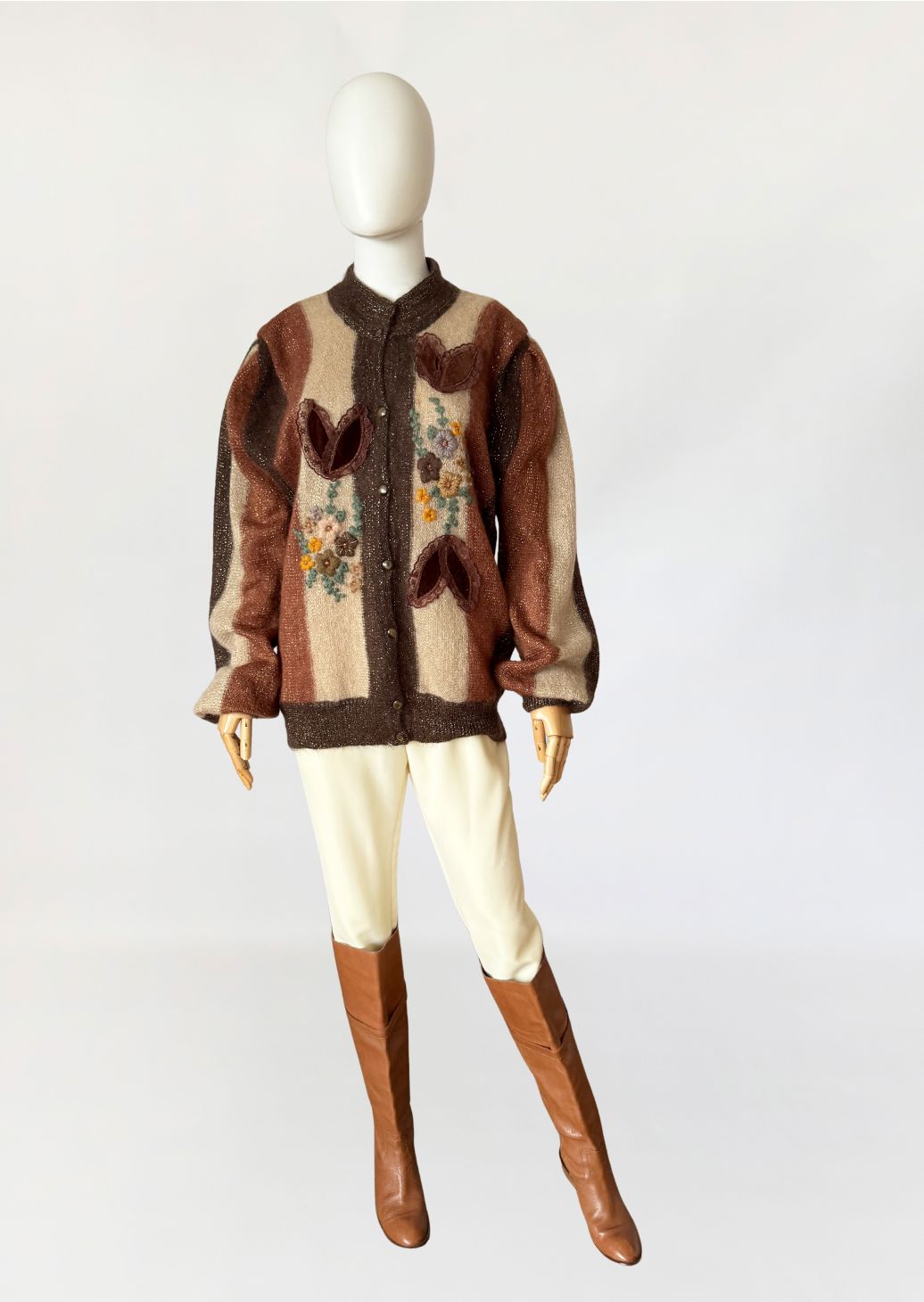 Włoski sweter vintage wykonany z luksusowej puszystej przędzy - miękkiego baby moheru. Dzianina w szerokie pionowe pasy w odcieniach gorzkiej czekolady, karmelu i kości słoniowej. Front dekorowany rozbudowanymi aplikacjami: haftowanymi motywami florystycznymi w odcieniach żółci, beżu, brązu i mięty, oraz trójwymiarowymi elementami z miękkiego aksamitu, zamkniętymi w koronkowych obrysach i wszytymi symetrycznie po obu stronach zapięcia. Rozpinany model o swobodnym fasonie z klasyczną linią ramion i rękawami o pełnej długości, zakończonymi mankietami o zwartym ściągaczu.