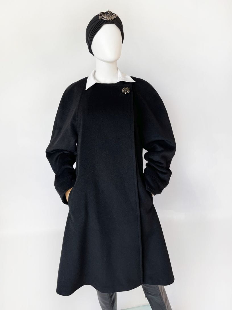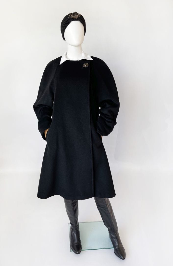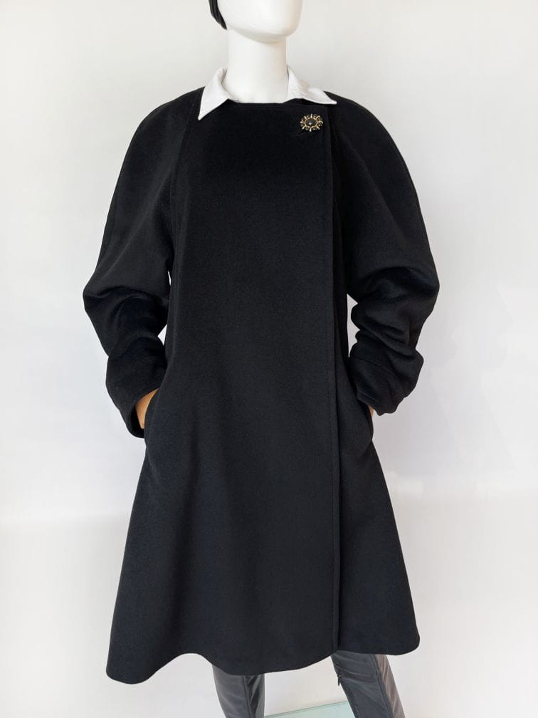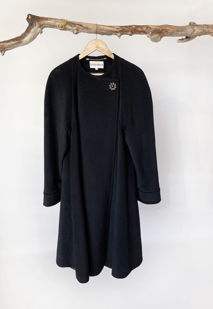Przepiękny płaszcz vintage projektu renomowanej marki Hans Erras. Model o eleganckiej, minimalistycznej formie. Wykonany z doskonałej jakościowo miękkiej mieszanki wełny jagnięcej i angory w głębokiej czerni. Zapinany kopertowo na duży biżuteryjny guzik przy dekolcie. Rozkloszowany fason w typie peleryny, poszerza się swobodnie od pach do dołu. Długie raglanowe rękawy, u góry okrągły dekolt. Na wysokości bioder wsuwane kieszenie. Wewnątrz na podszewce.